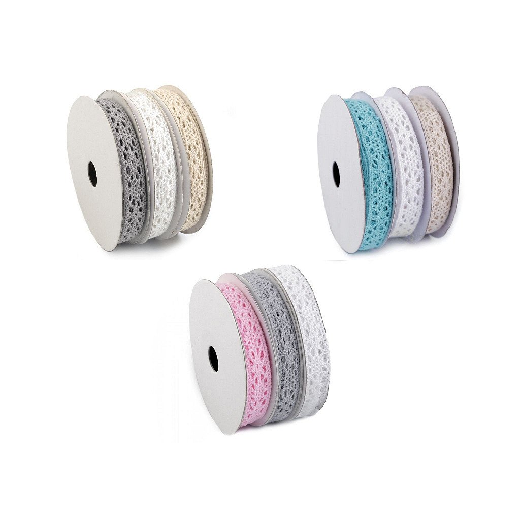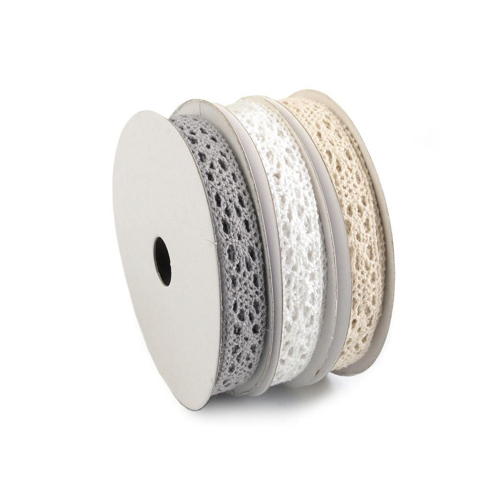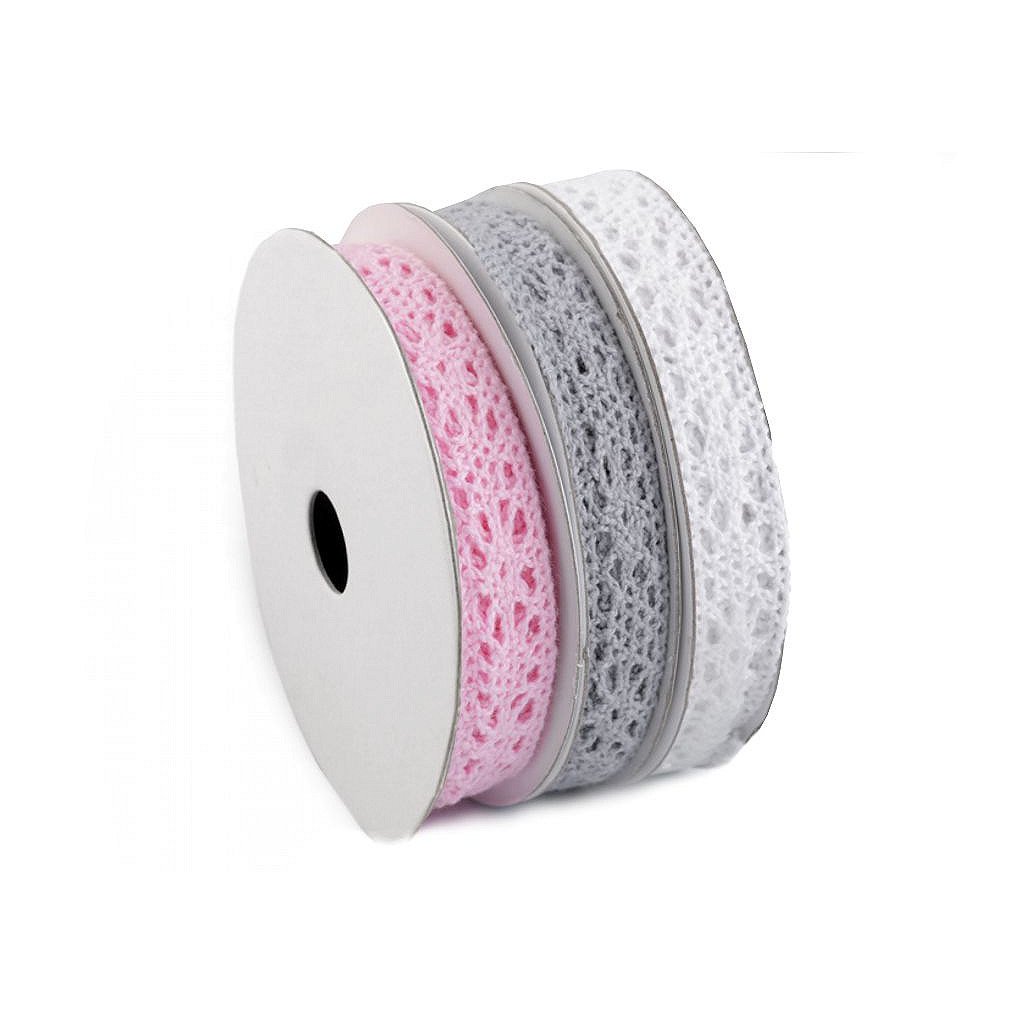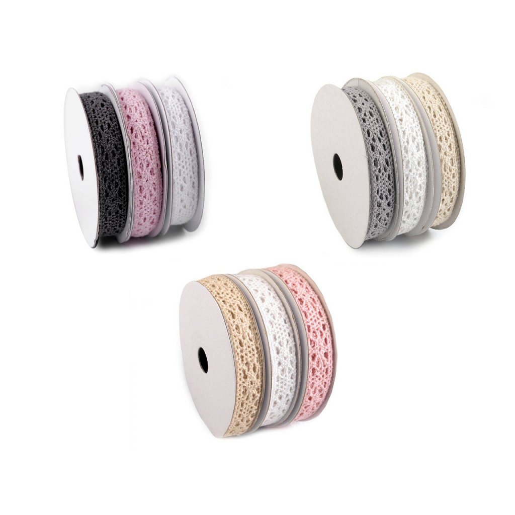 V jedné sadě jsou 3 cívky a na každé z nich je krajka s návinem 5 m. Celkem je tedy v jednom balení 15 m. Cena je za 1 cívku/1 ks.Na 1 cívce se může vyskytovat 1 prostřih.
