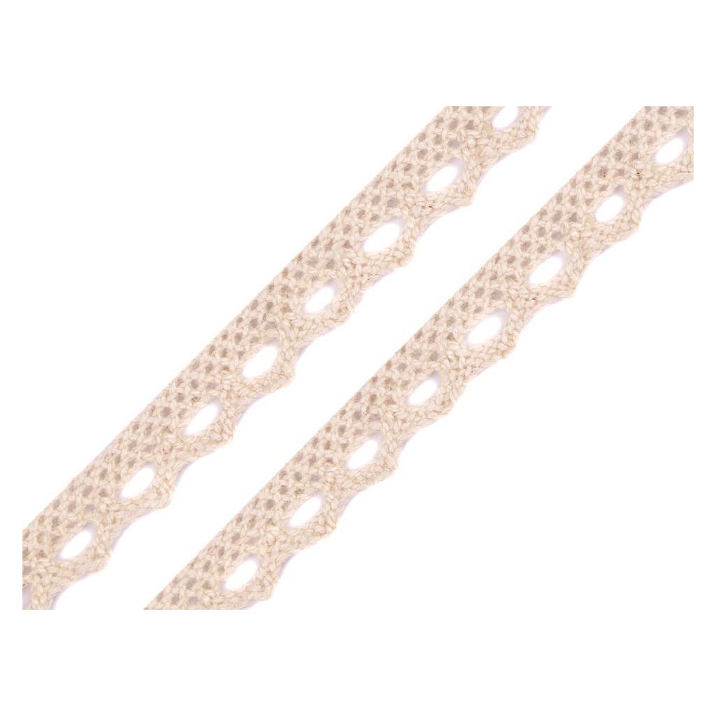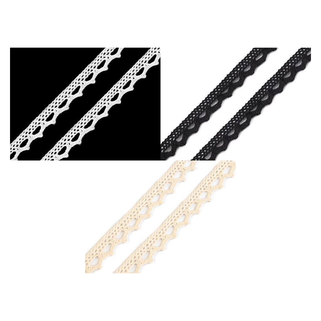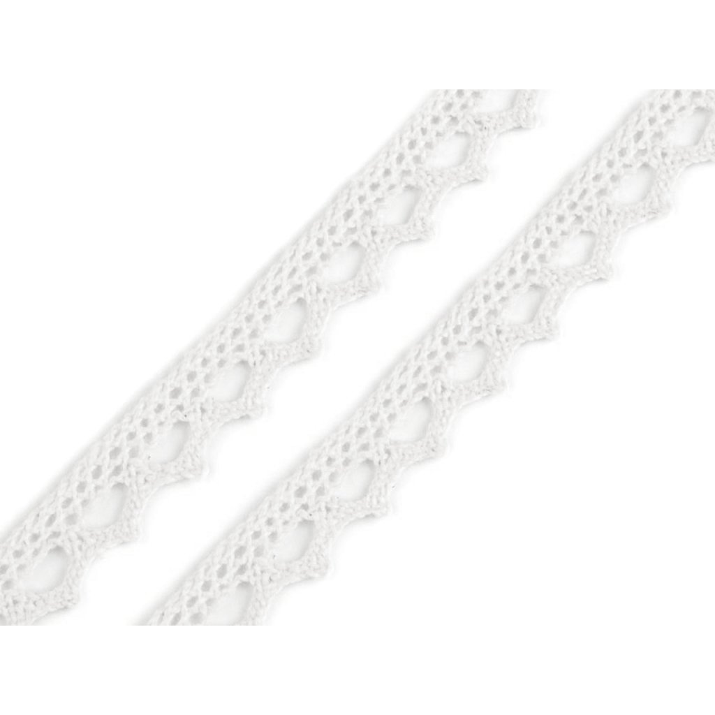 Pevná krajka je vyrobená z bavlny. Zdobí ji jemný paličkovaný vzor s drobnými očky.