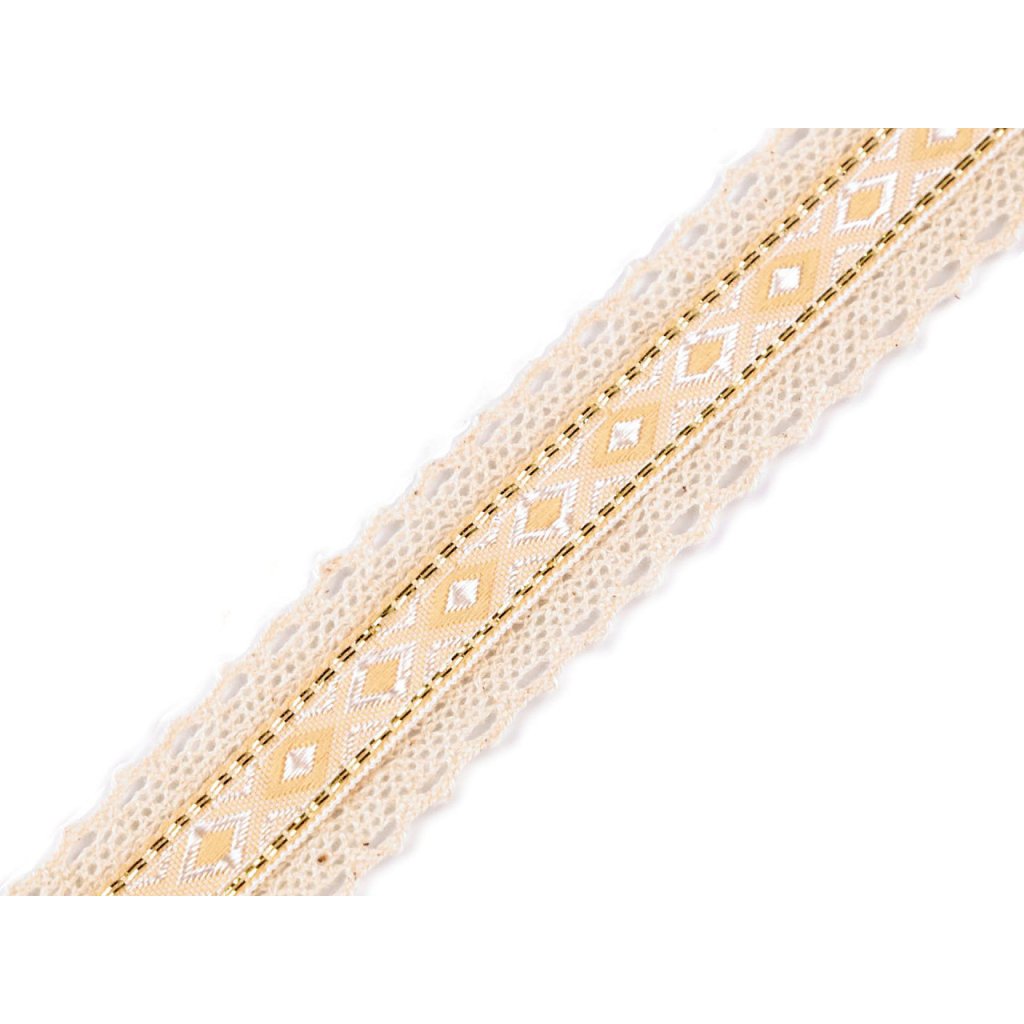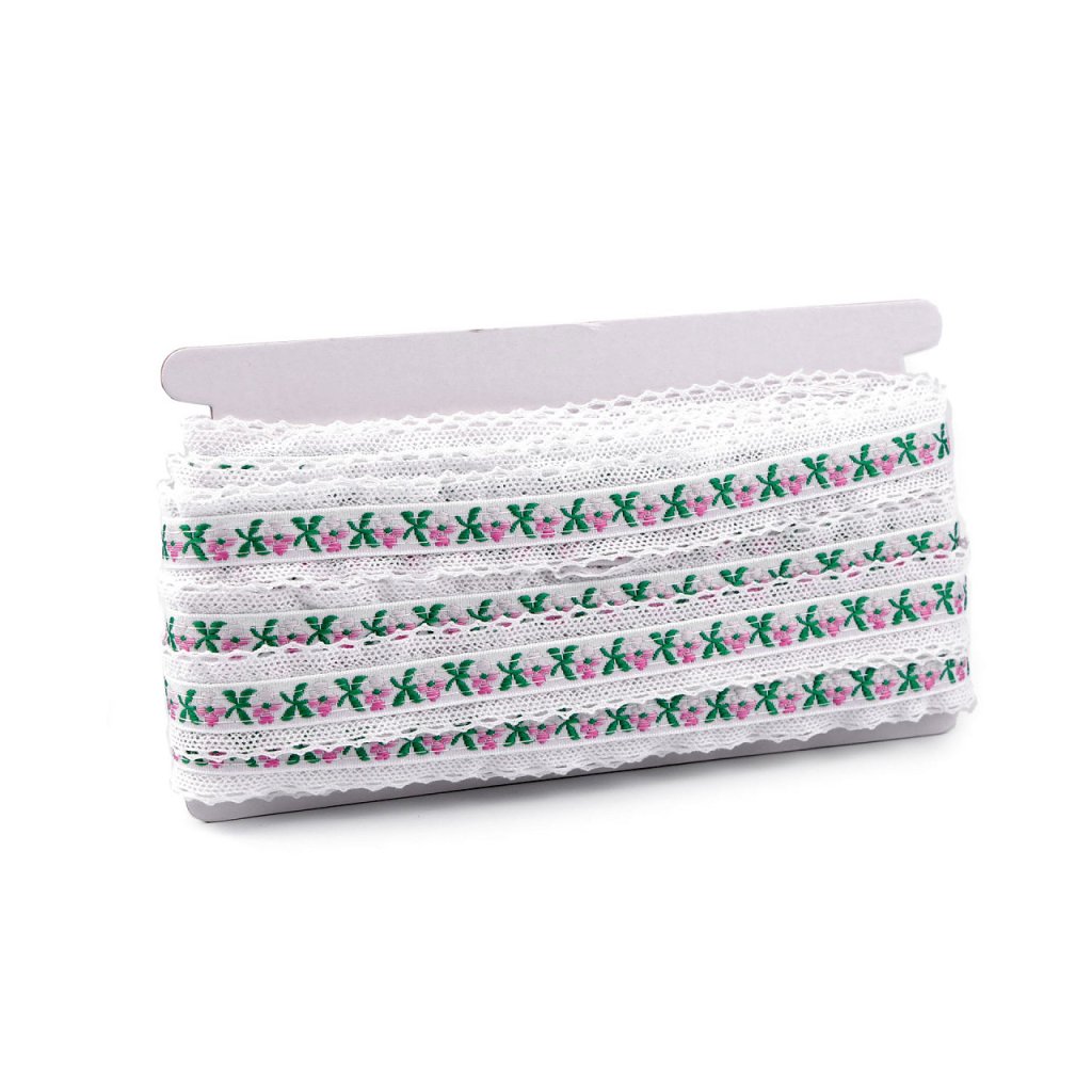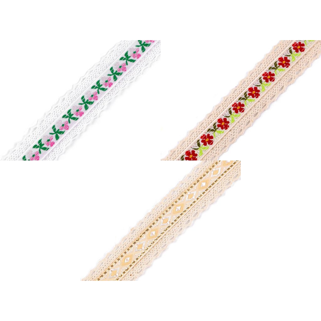Bavlněnou krajku zdobí středový pruh ze vzorovky. Krajka je měkká a příjemná na dotek. Ozdobíte s ní oděvy i doplňky.