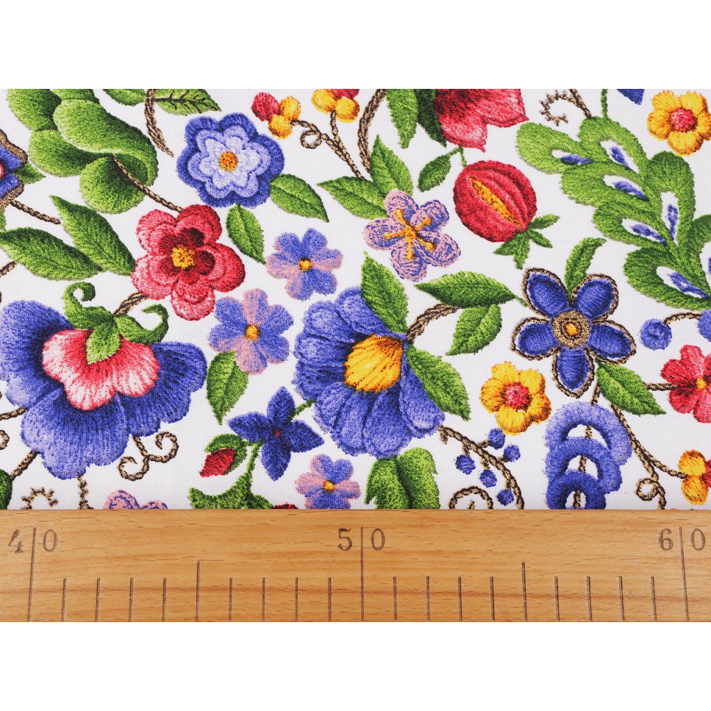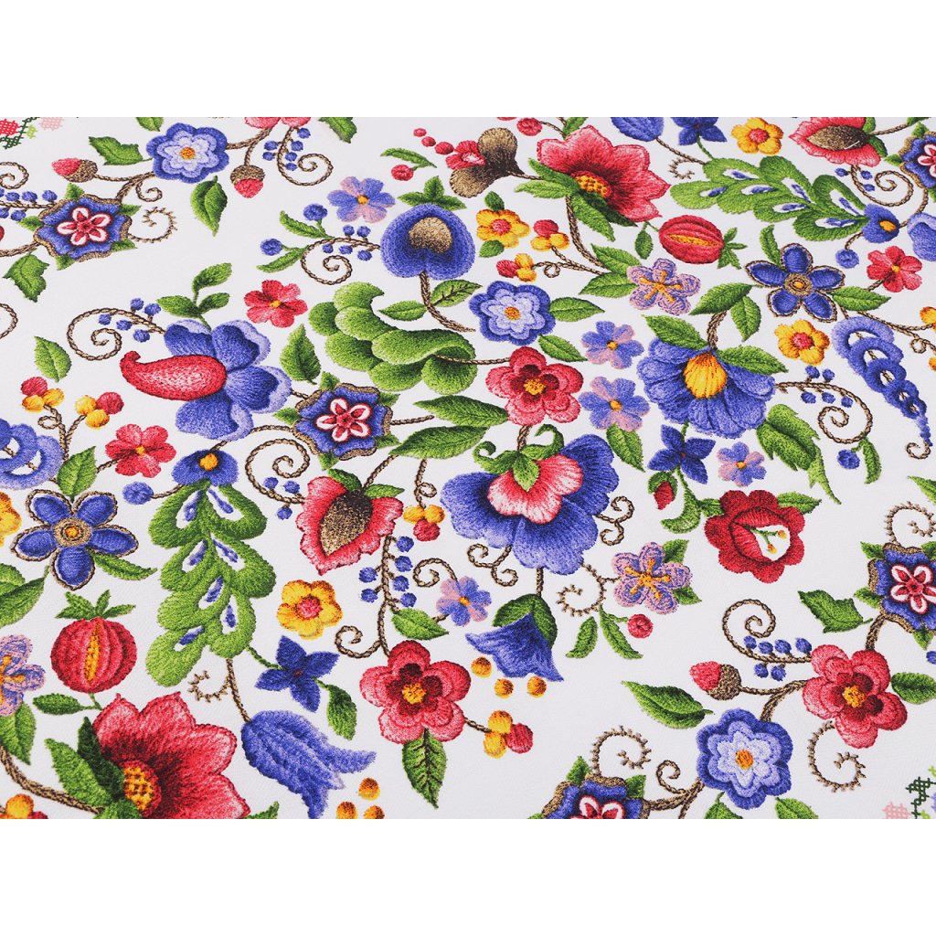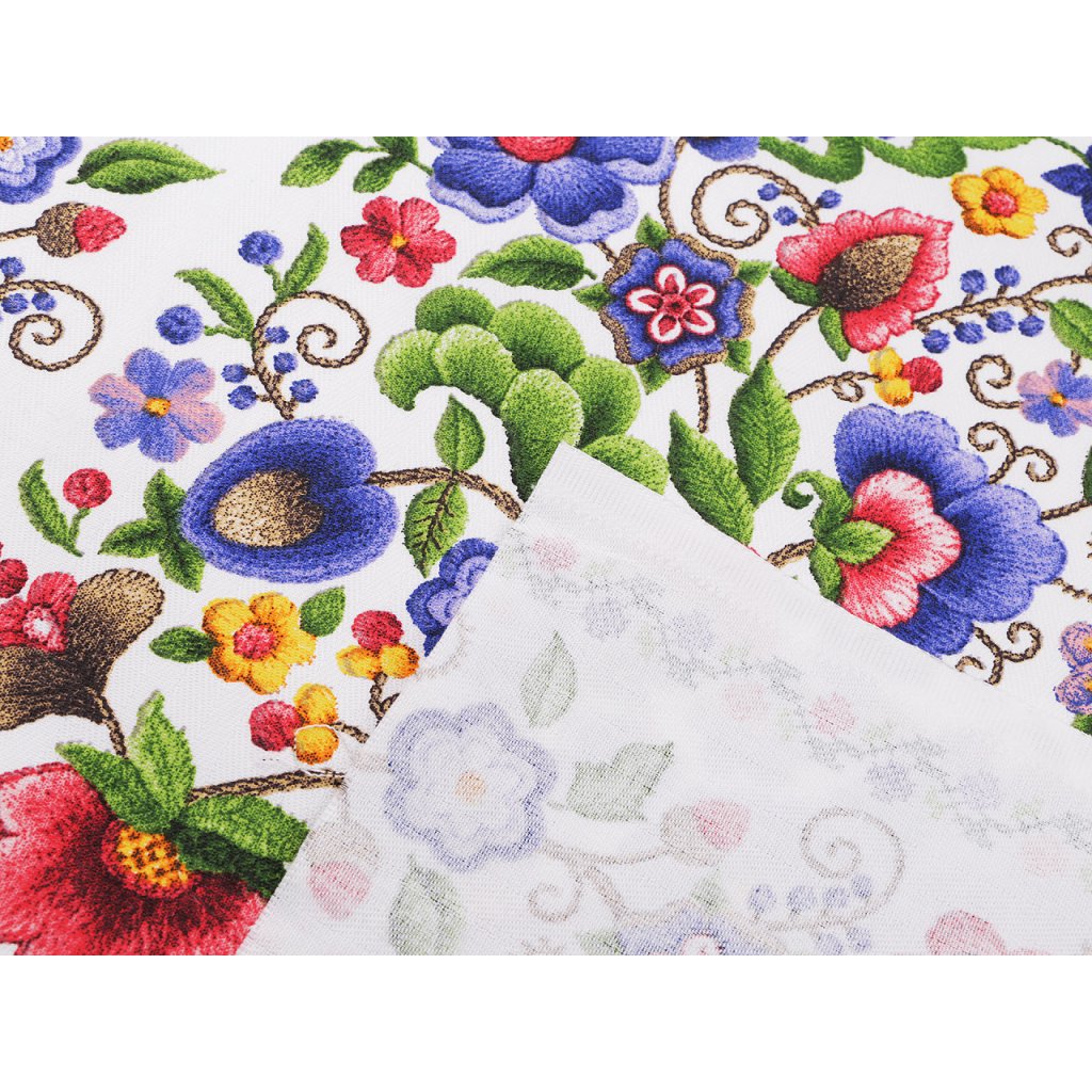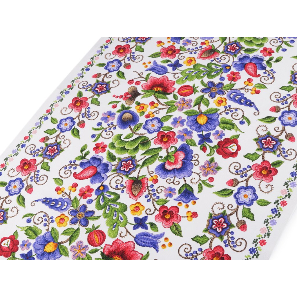 Bavlněnou látku zdobí květovaný potisk, který zapadá do folklorního stylu. Látka je svou šíří uzpůsobena tak, že z ní hravě vyrobíte běhoun na stůl, prostírání i dekorační povlaky na polštáře. Šíře je z obou stran začištěná, tak ji nemusíte vůbec zapošívat či jinak upravovat.Má design s nekonečným vzorem.