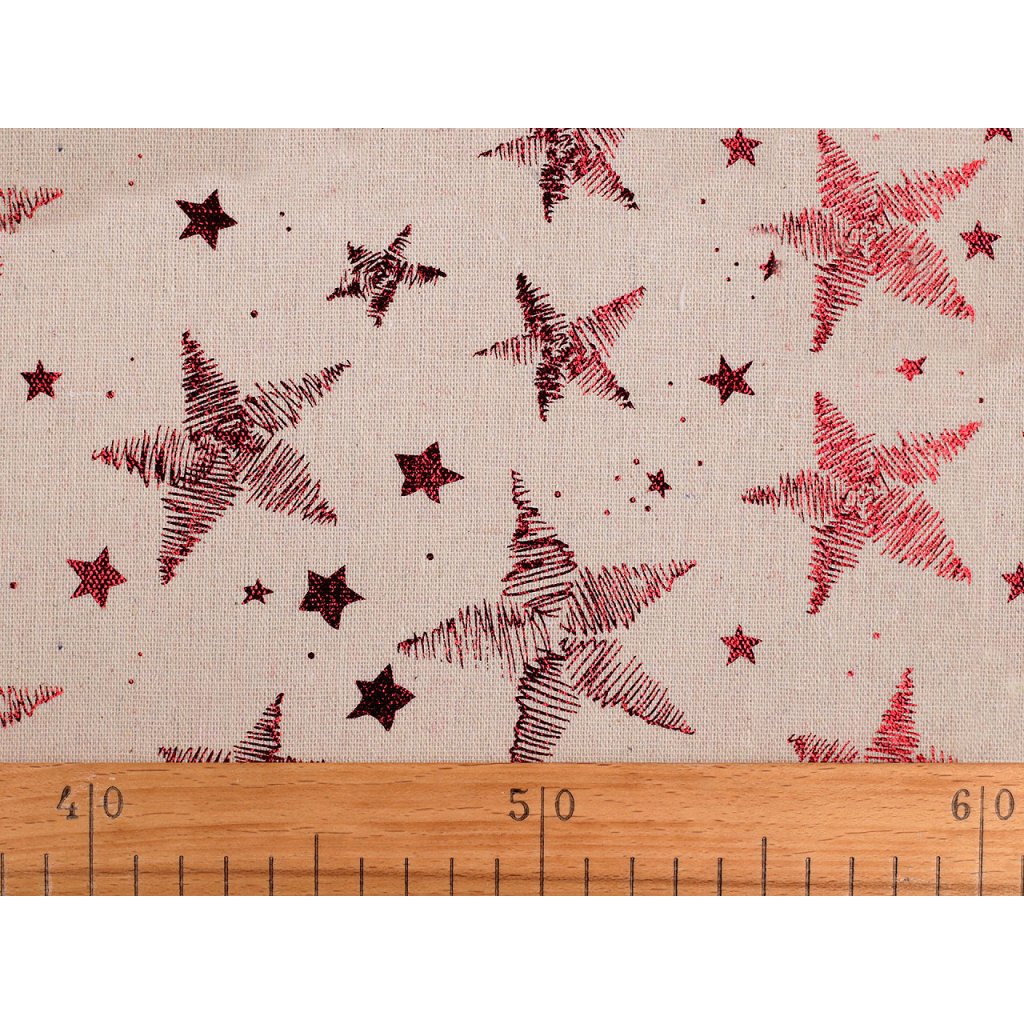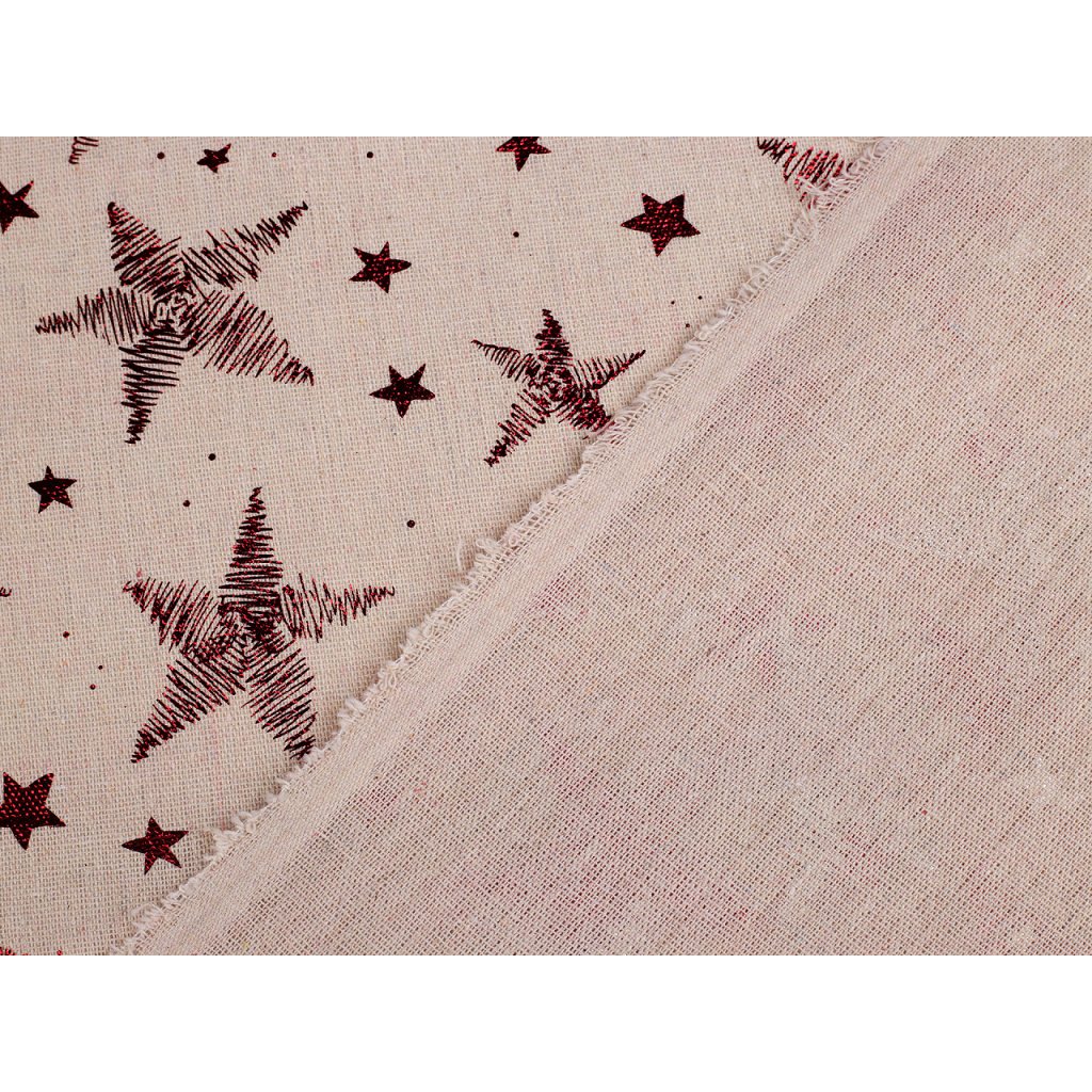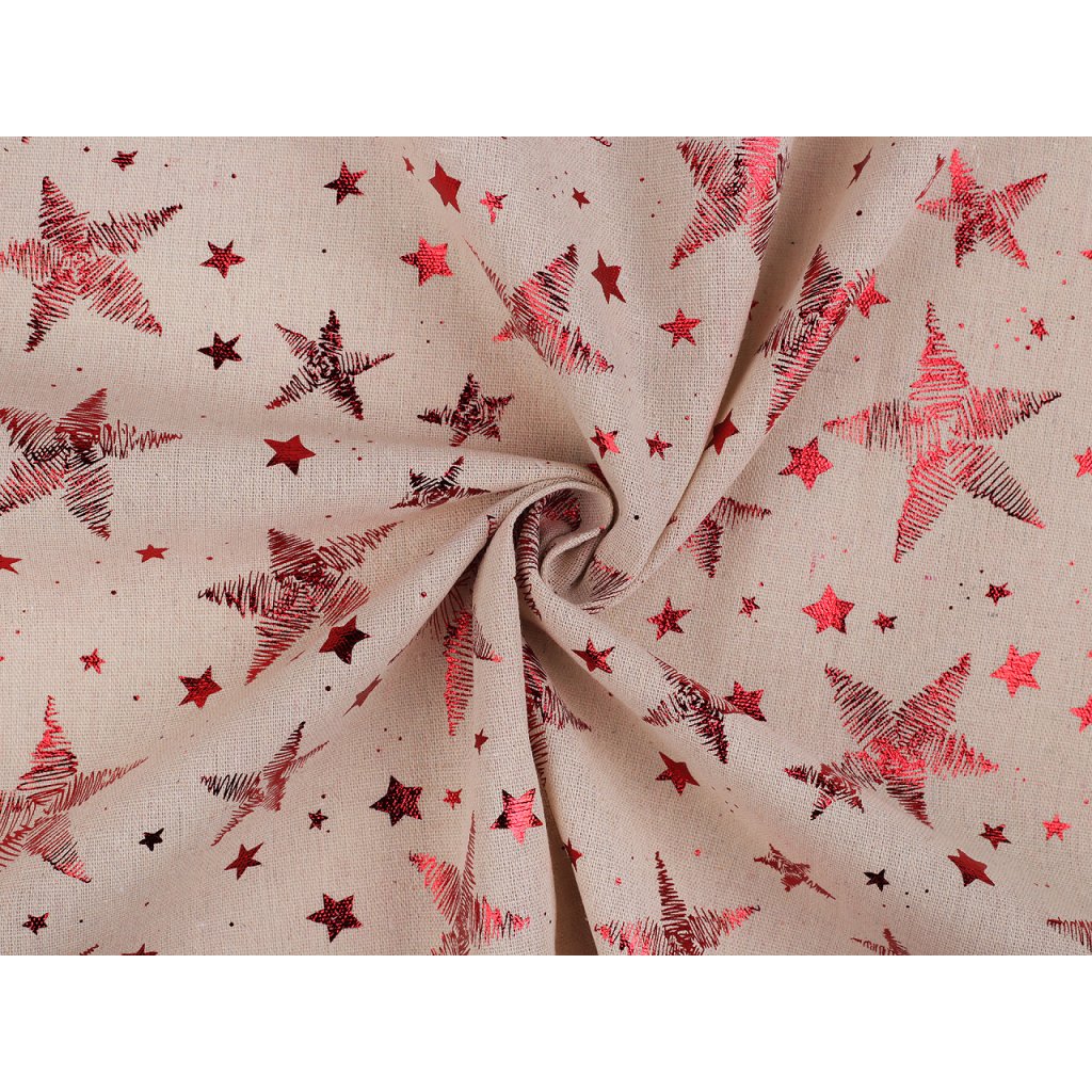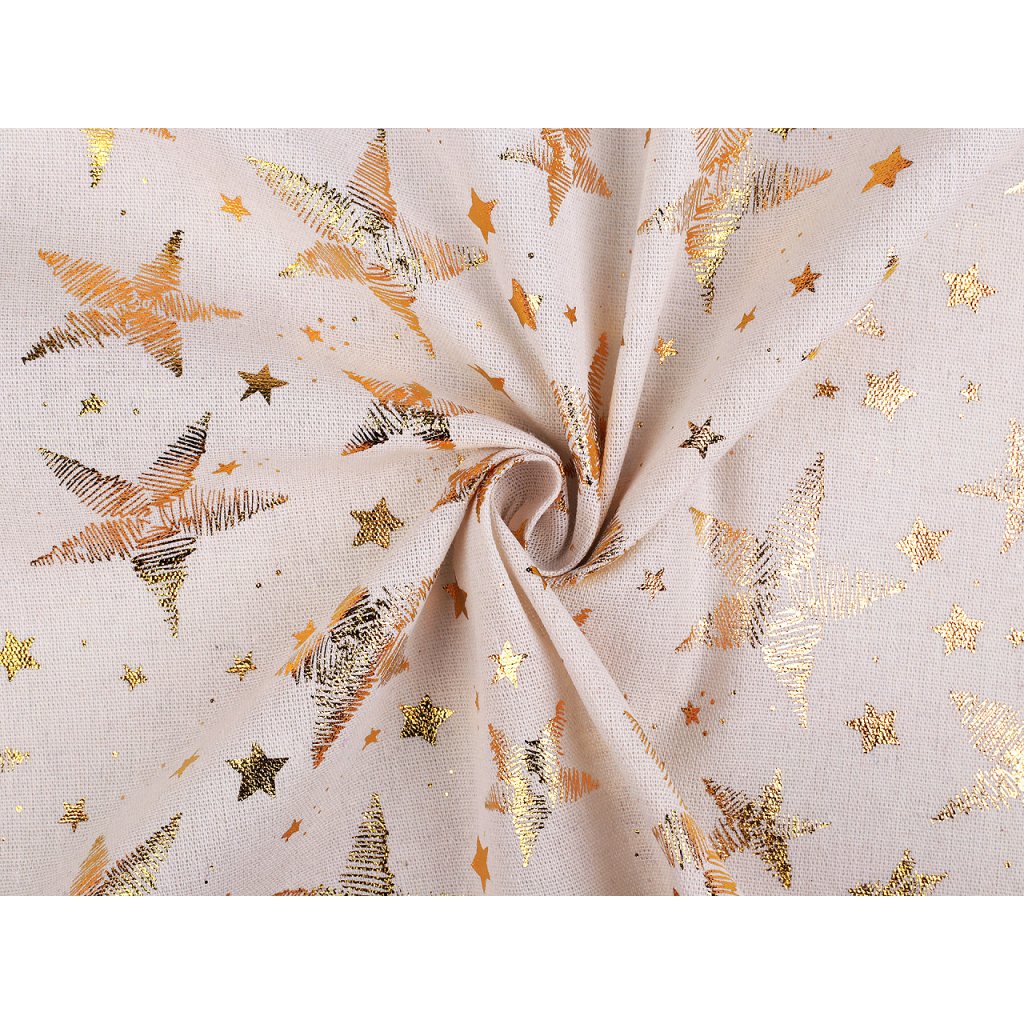 Hrubší bavlněná látka svou plátnovou vazbou imituje látky ze lnu. Zdobí ji metalický potisk hvězd. Využijete ji na šití ubrusů, dekoračních polštářů, tašek, pytlíků, ubrusů, prostírání apod.