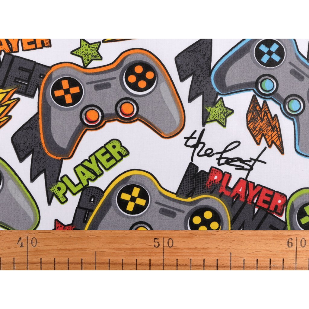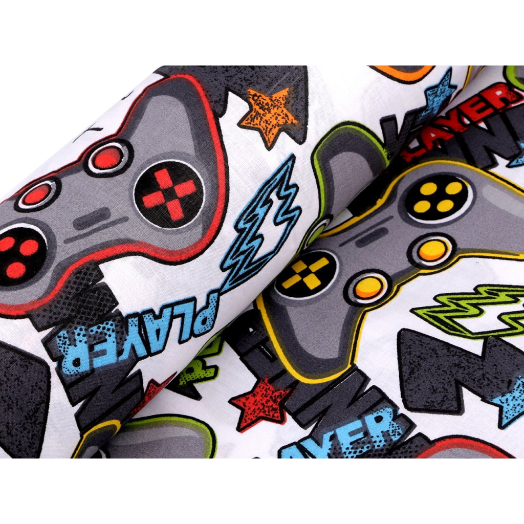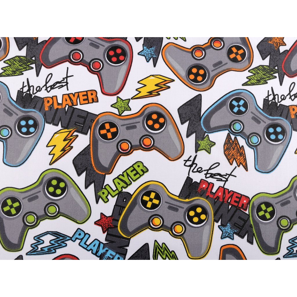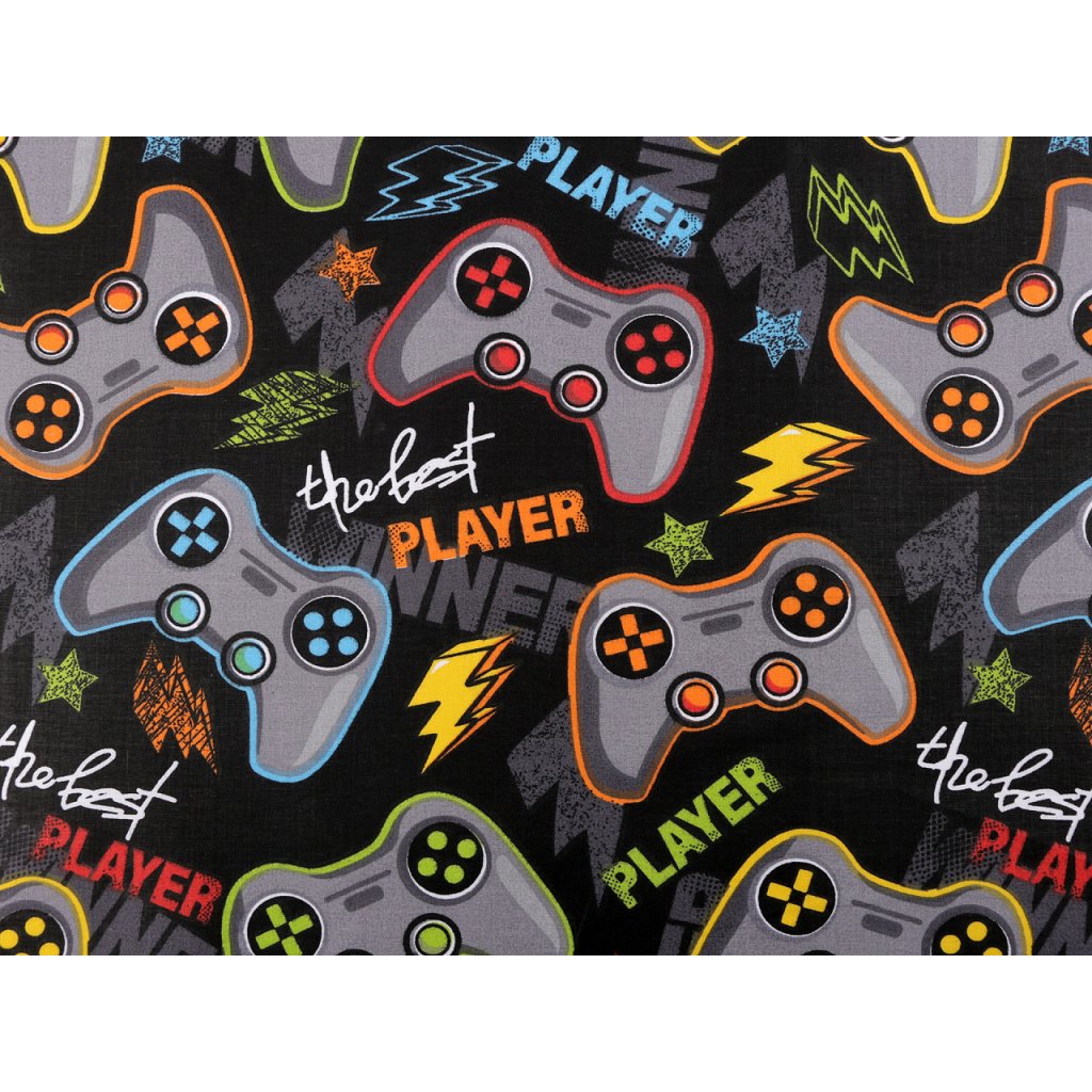 Bavlněnou látku zdobí obrázky herních konzolí, které ocení nejen mladší, ale i starší generace herních nadšenců. Je vhodná na šití polštářů, povlečení, hnízd pro děti, kapsářů, tašek, pytlíků apod.