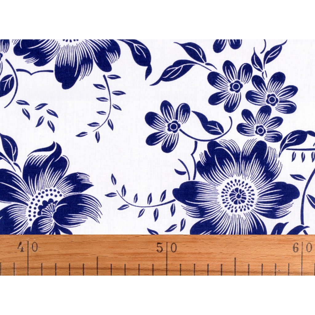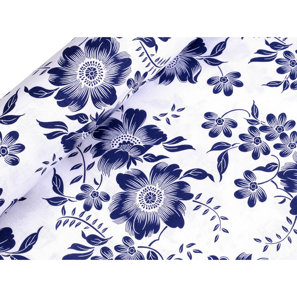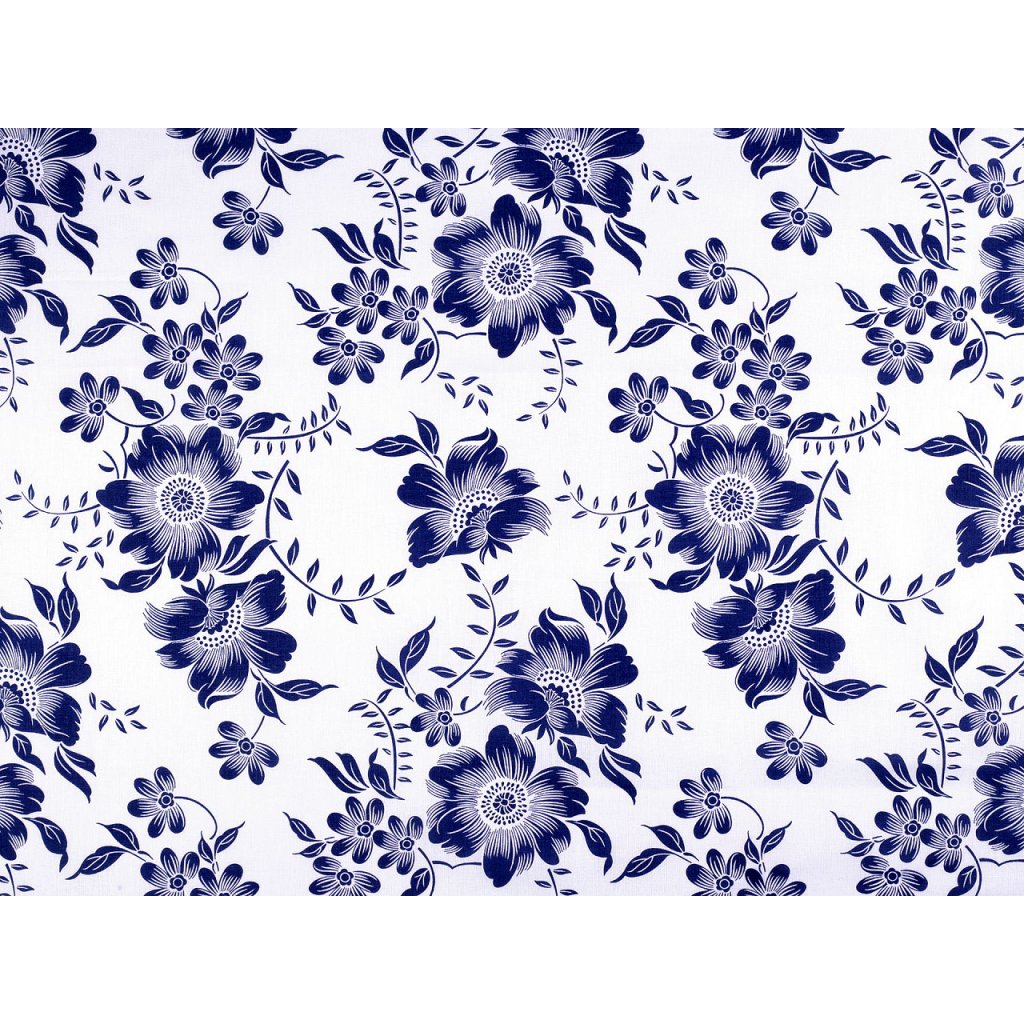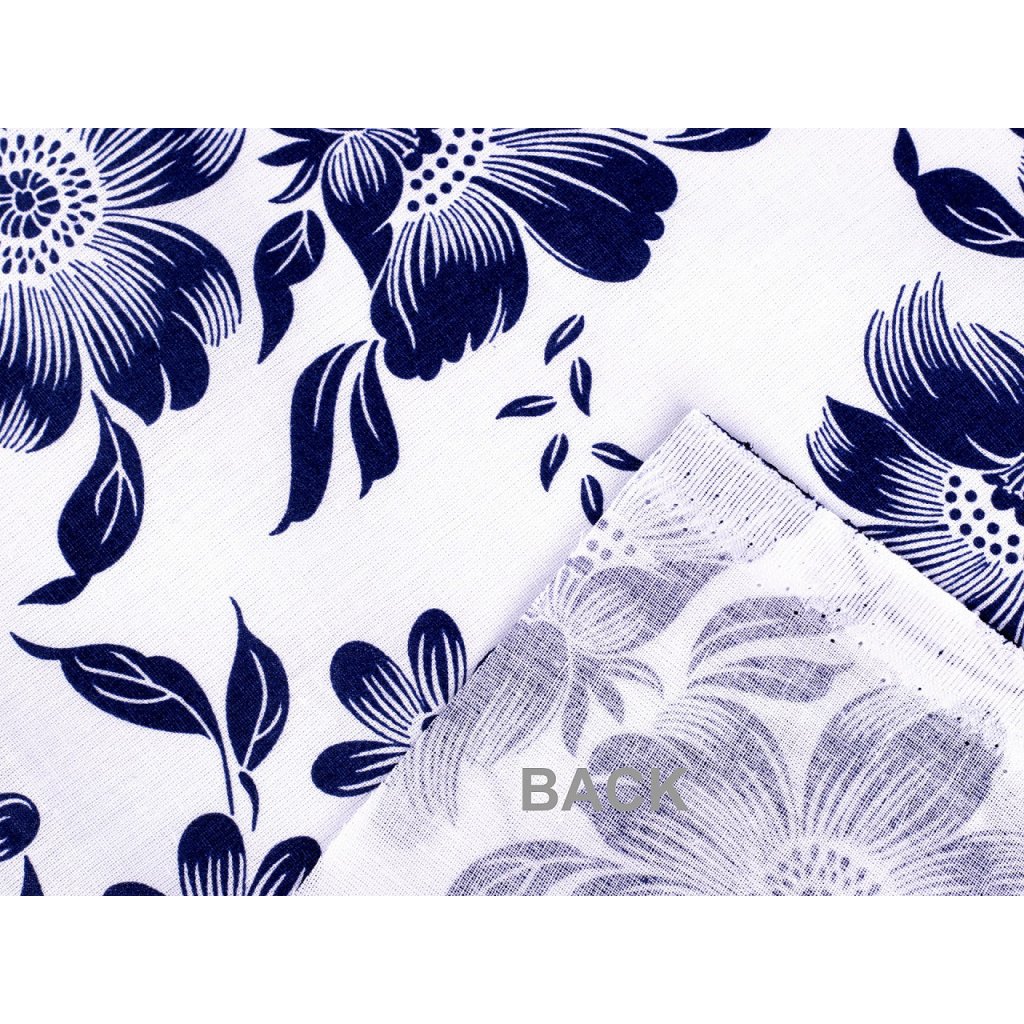 Bavlněné plátno zdobí potisk květů. Připomíná tzv. modrotisk. Hodí se na šití ubrusů, prostírání, závěsů, tašek, pytlíků, povlečení apod.