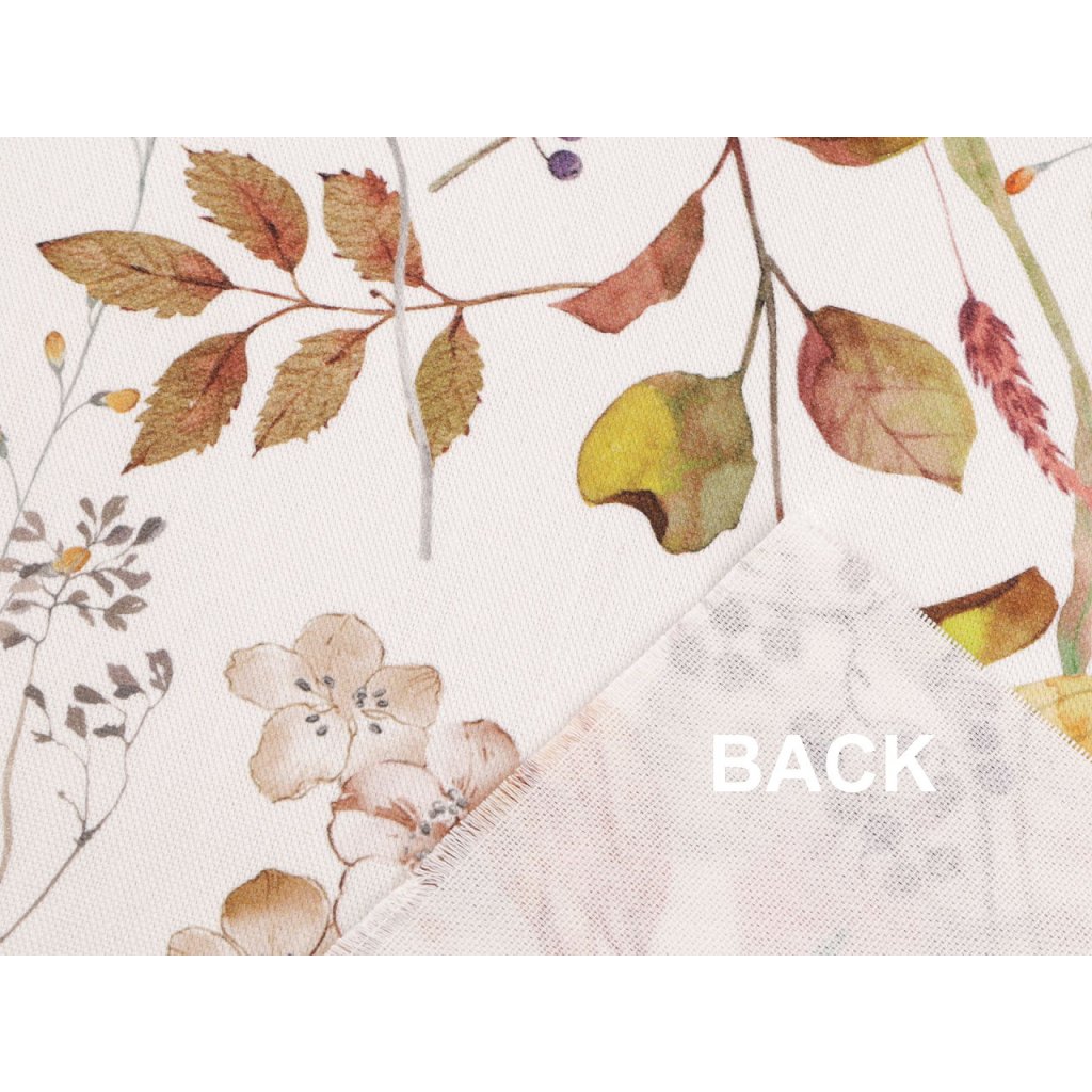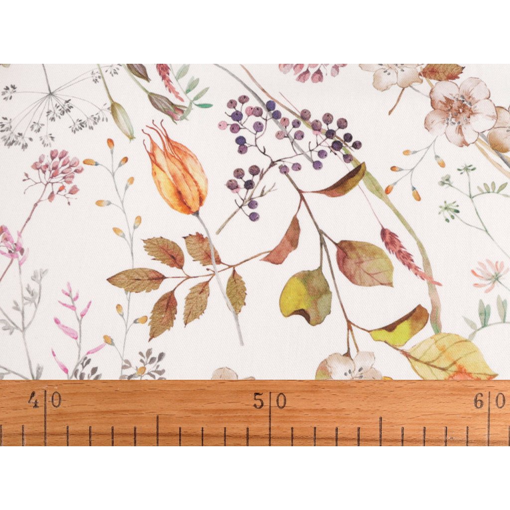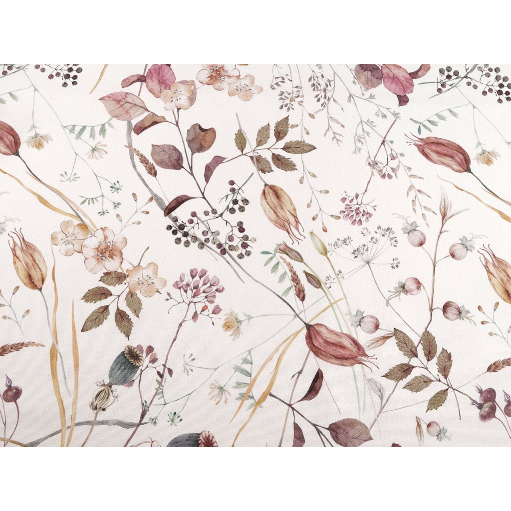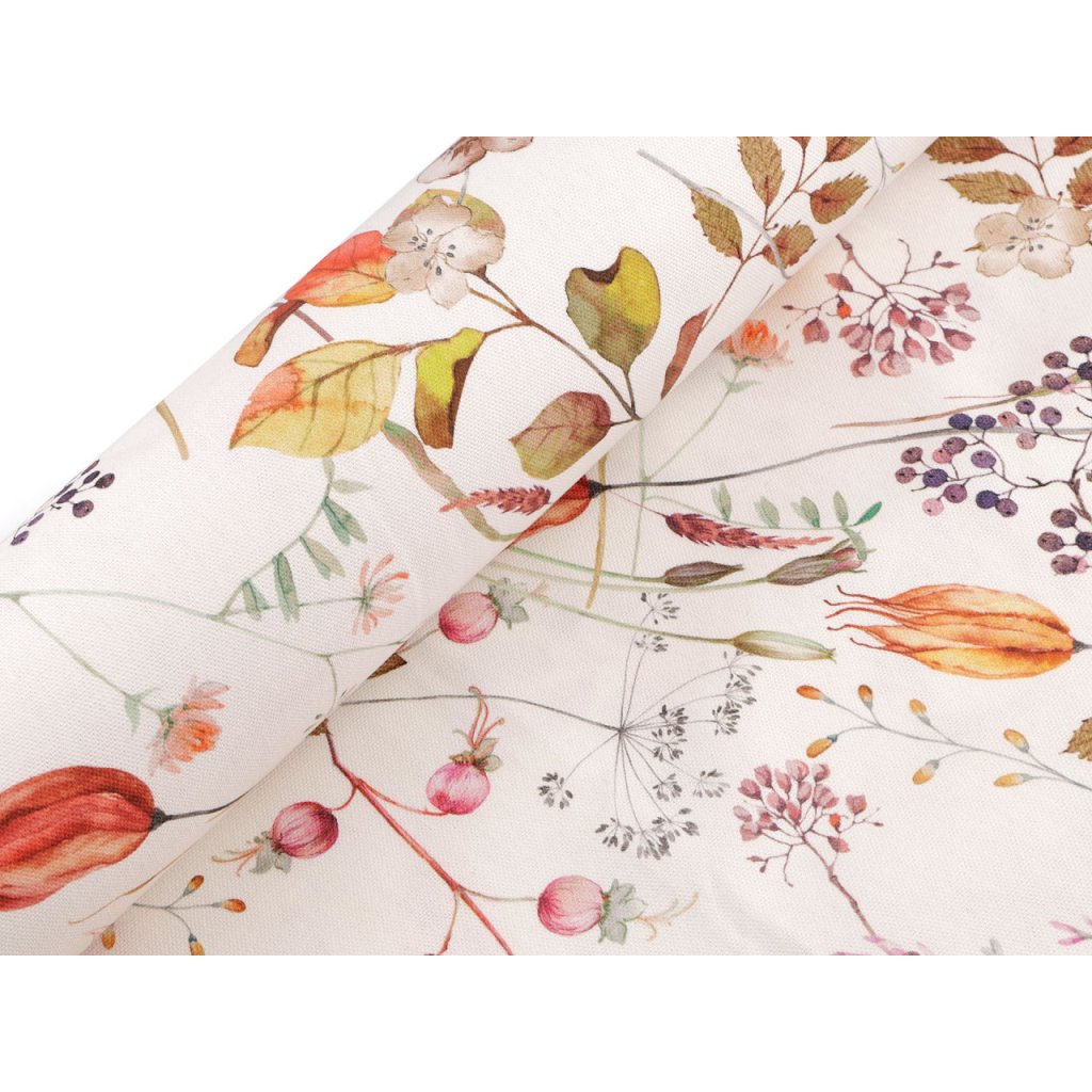 Bavlněná látka Half panama má strukturu podobnou klasické vyšívací panamě. Je pevná, ale zároveň měkká a příjemná na dotek. Zdobí ji květinový potisk.