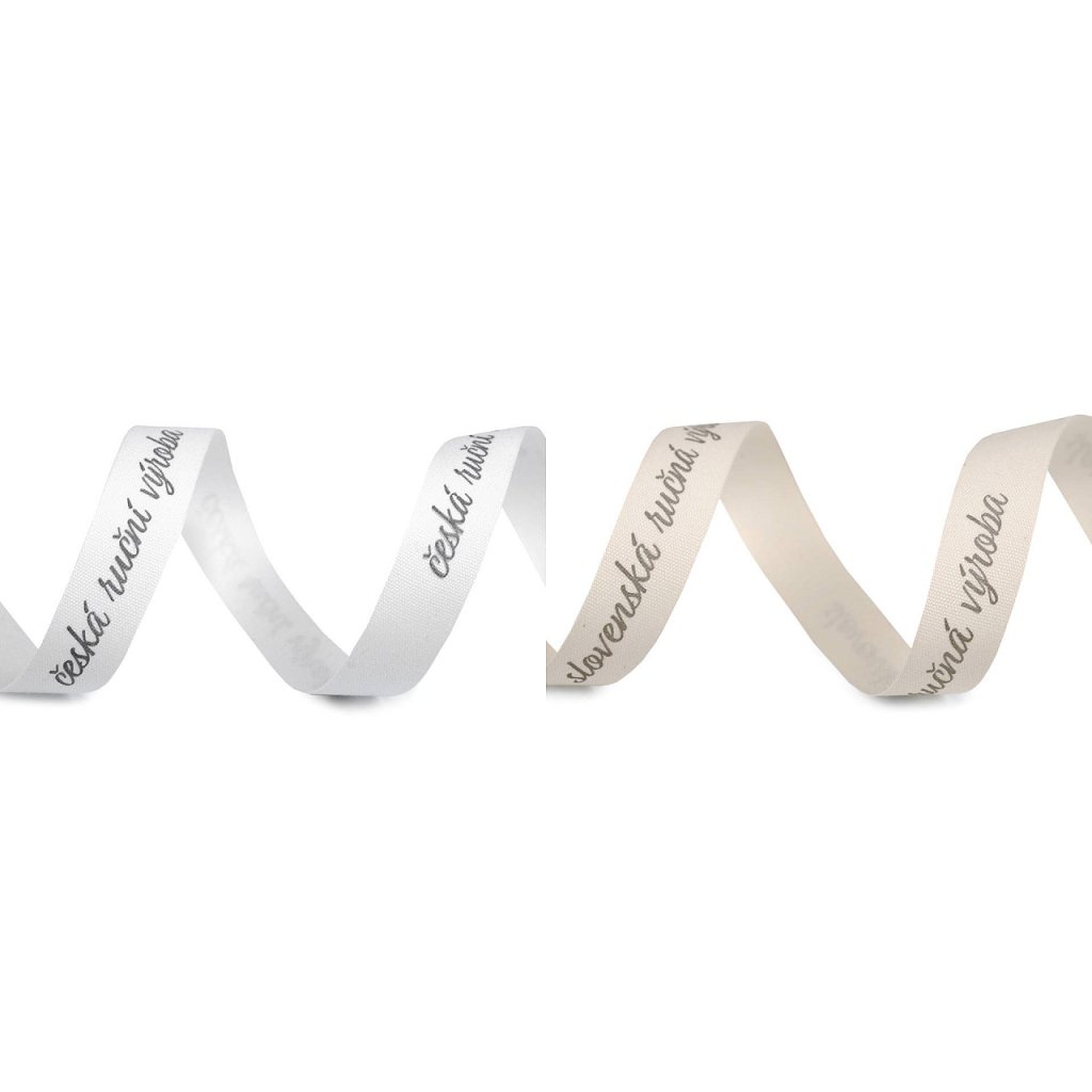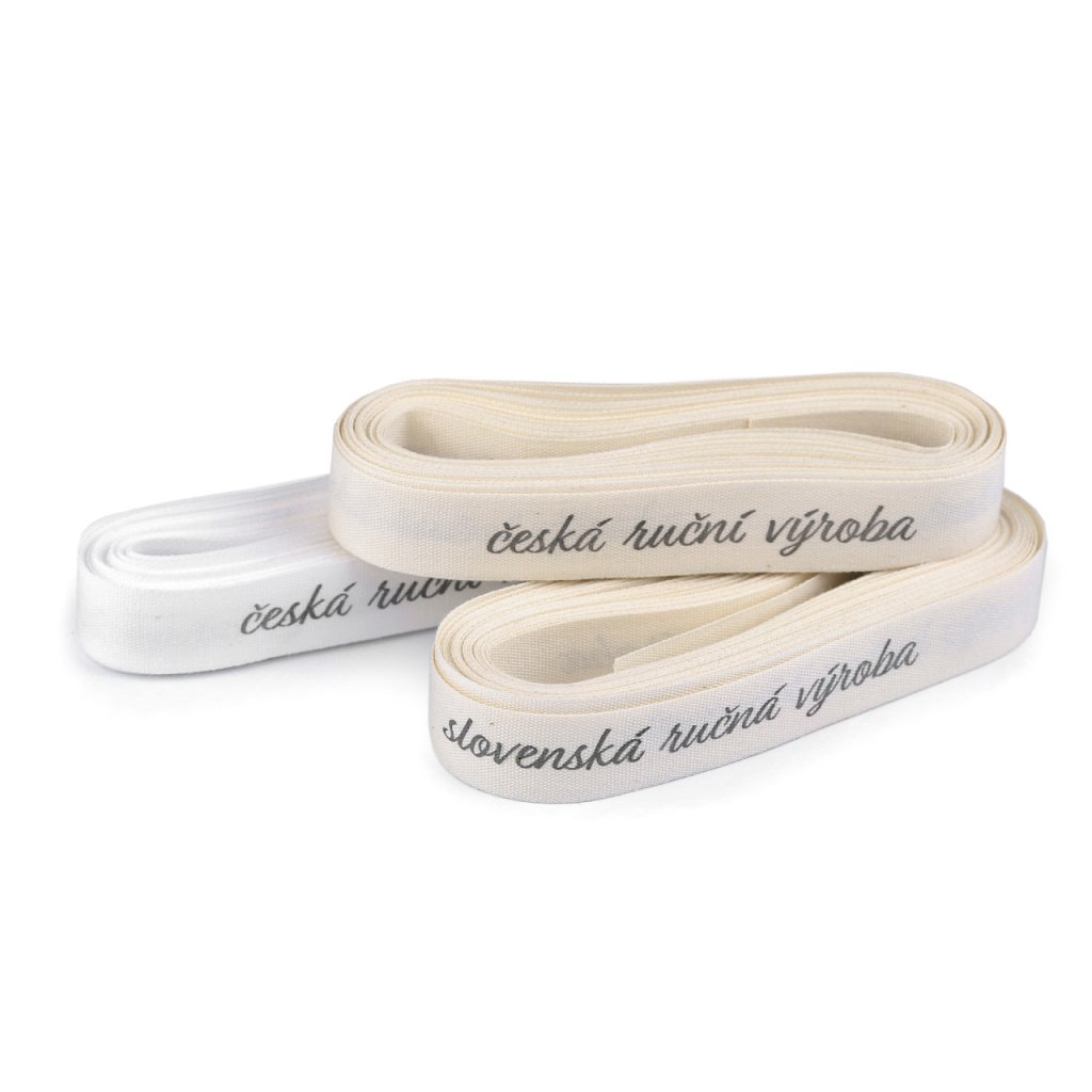 Bavlněnou stuhu zdobí nápis česká ruční výroba nebo nápis slovenská ručná výroba. Český nápis je dlouhý 6,5 cm, slovenský 8 cm. Stuha je jednostranná, pevná a příjemná na dotek.