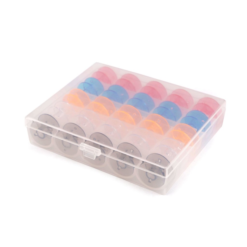 Uvnitř praktického boxu najdete 25 cívek (výška 11,3 mm, Ø20 mm, vnitřní Ø6,3 mm). Díky průhlednému plastu, ze kterého je box vyrobený, budete mít dokonalý přehled o cívkách i barvách nití na nich namotaných. Máme odzkoušené v domácích šicích strojích.