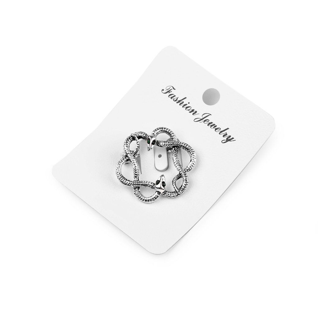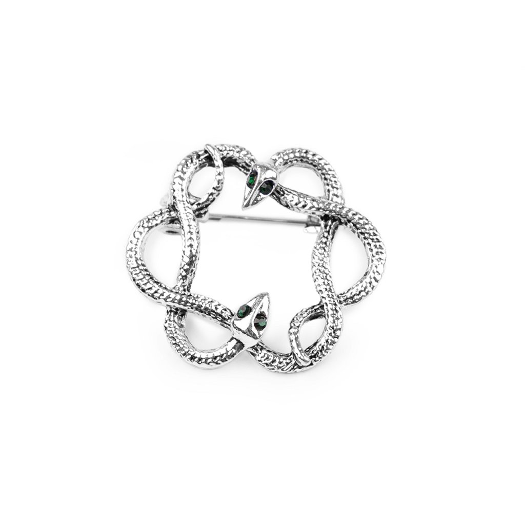 Kovová brož s propletenými hady vyniká nevtíravou elegancí. Oči jsou ozdobené drobnými broušenými kamínky. Využijete ji na běžné nošení i společenské události. Na zadní straně má brožový špendlík.