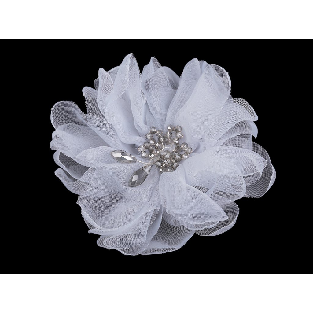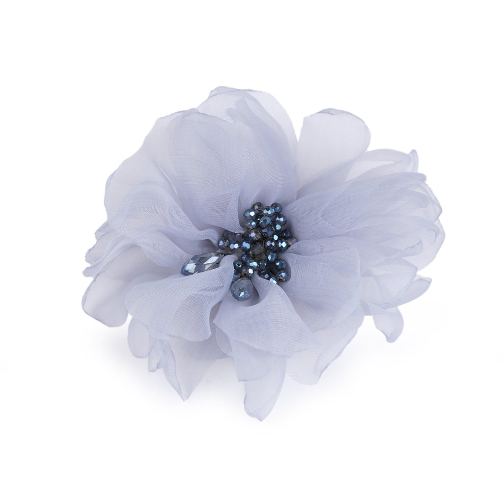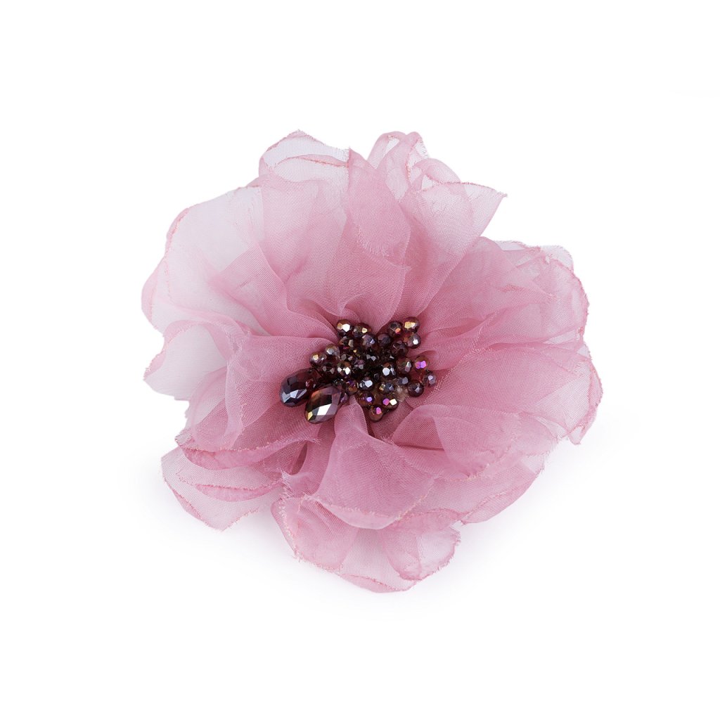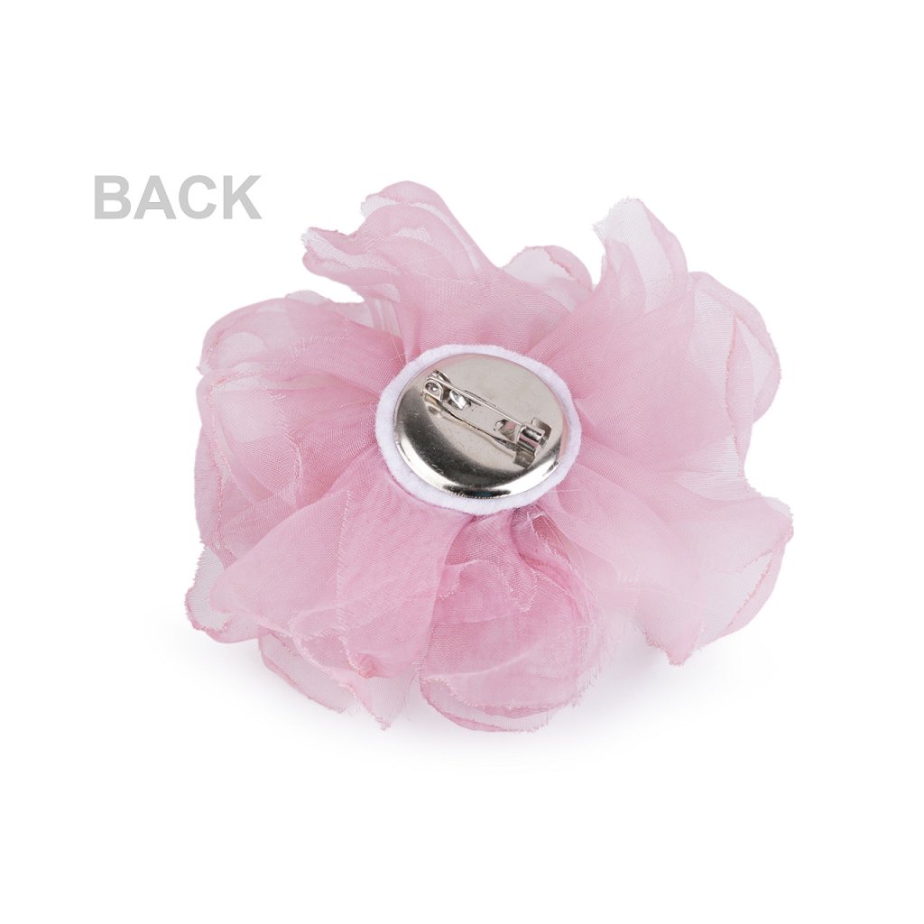 Romantická textilní brož květu z organzy má bohaté okvětní plátky, je jemně nadýchaná. Ve středu je ozdobená broušenými korálky, díky kterým se nádherně třpytí. Vzadu má brožový špendlík, květem si můžete ozdobit šaty, halenku, sako, klobouk i kabelku.
