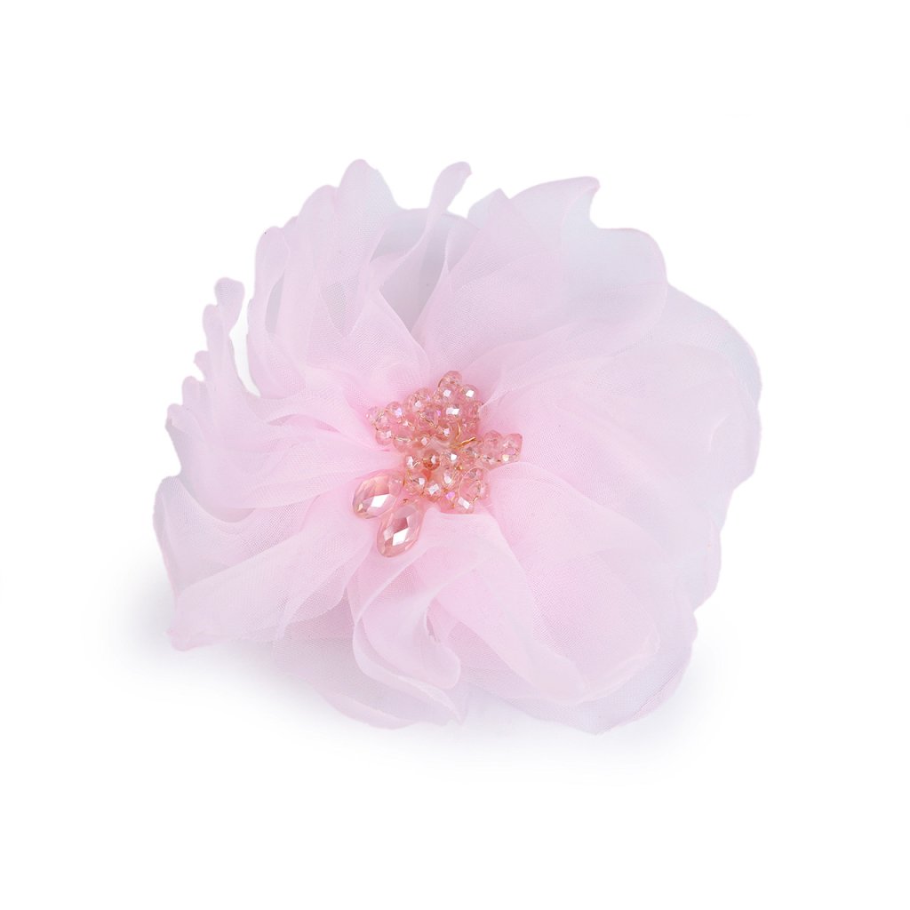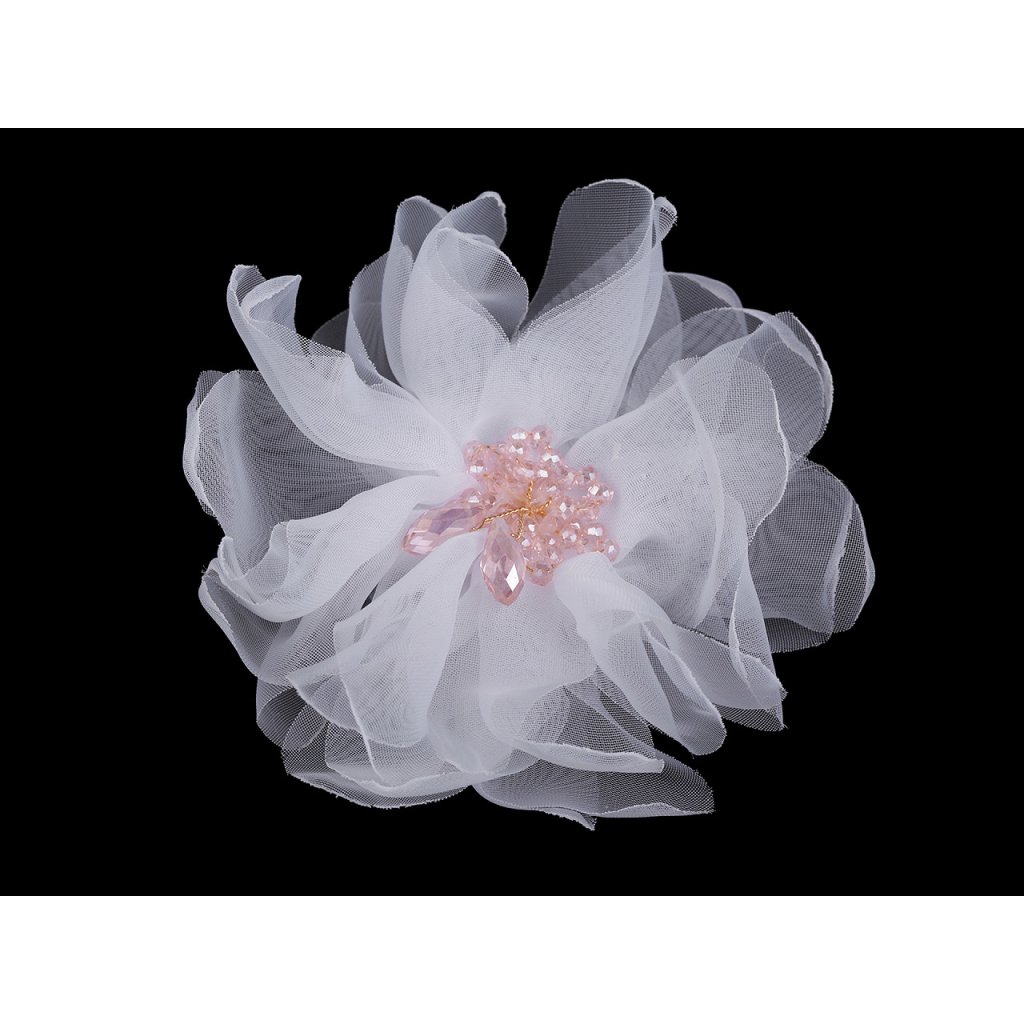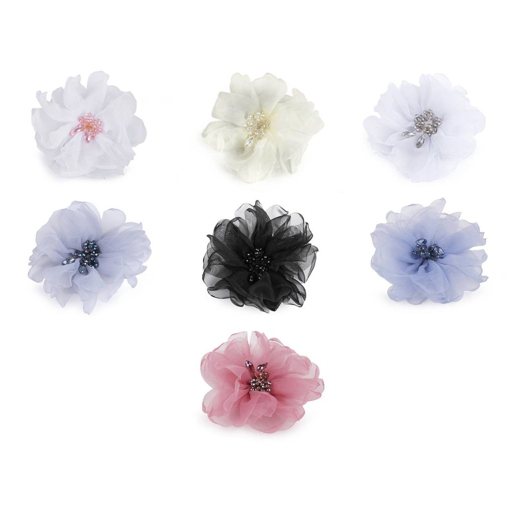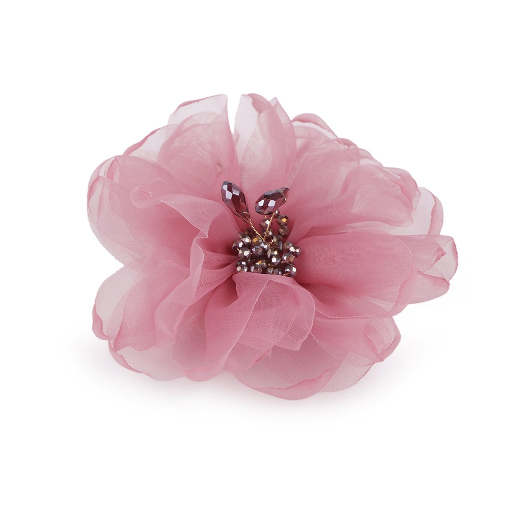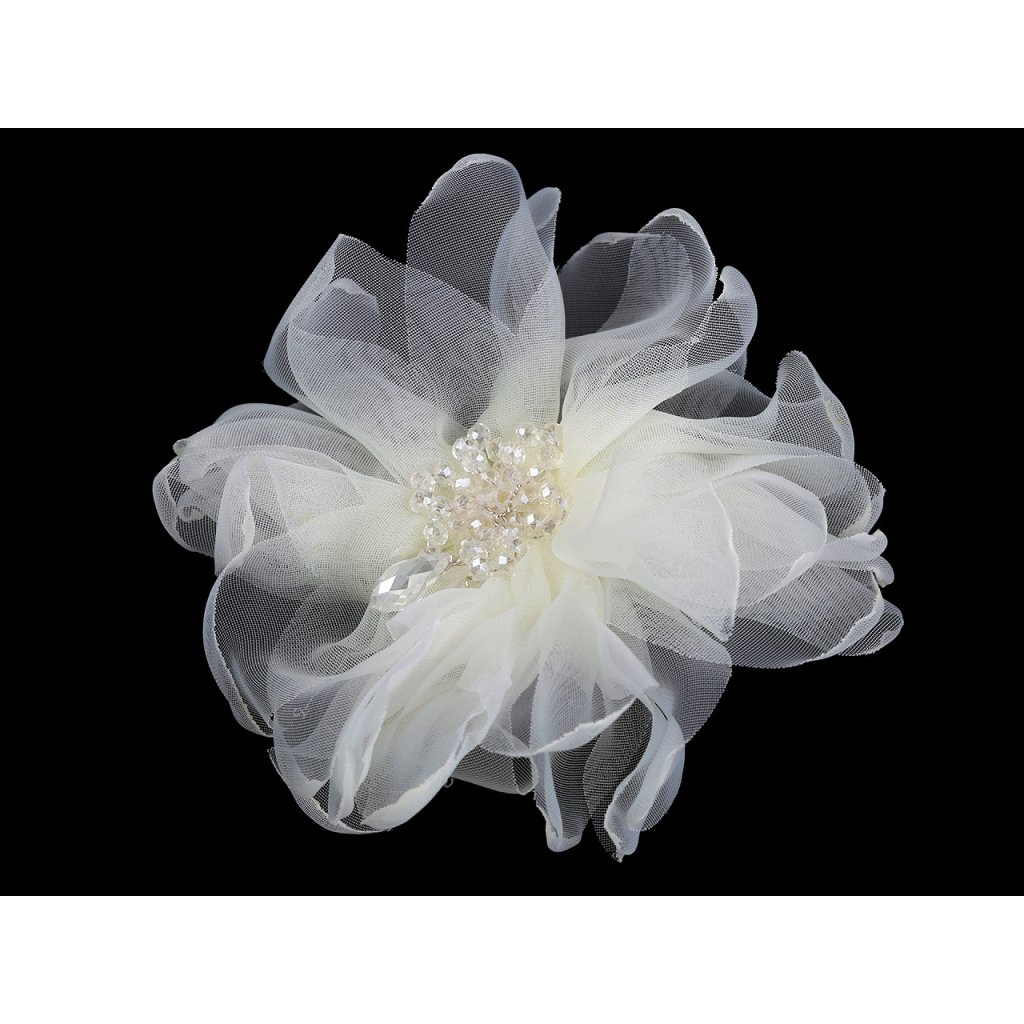 Romantická textilní brož květu z organzy má bohaté okvětní plátky, je jemně nadýchaná. Ve středu je ozdobená broušenými korálky, díky kterým se nádherně třpytí. Vzadu má brožový špendlík, květem si můžete ozdobit šaty, halenku, sako, klobouk i kabelku.