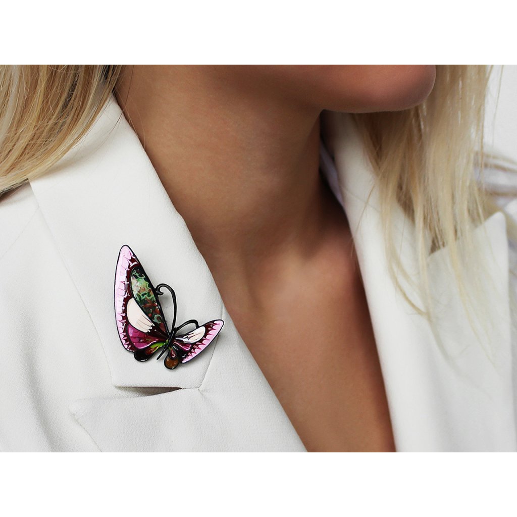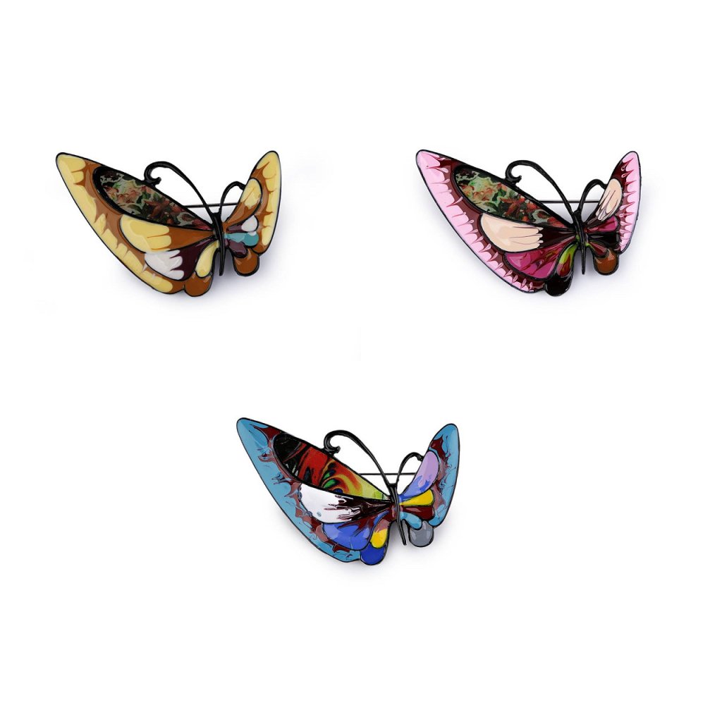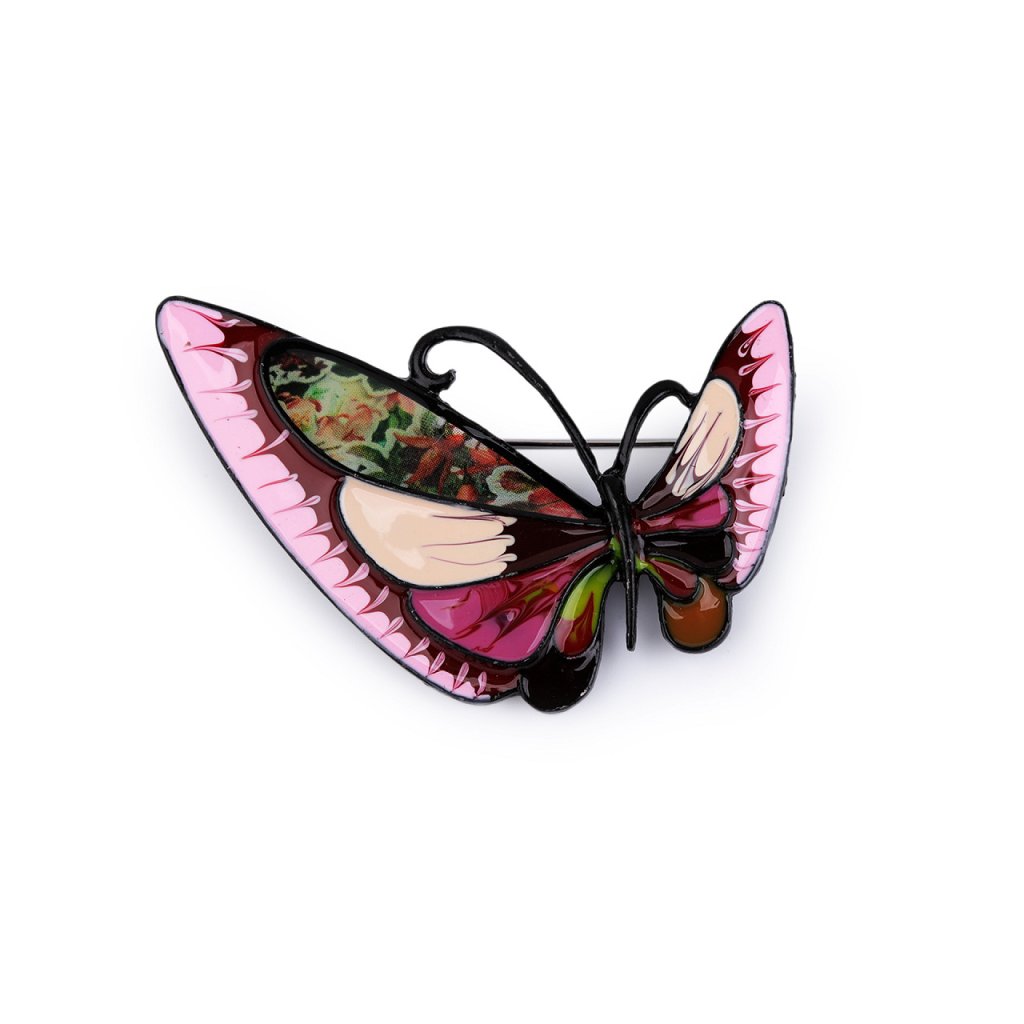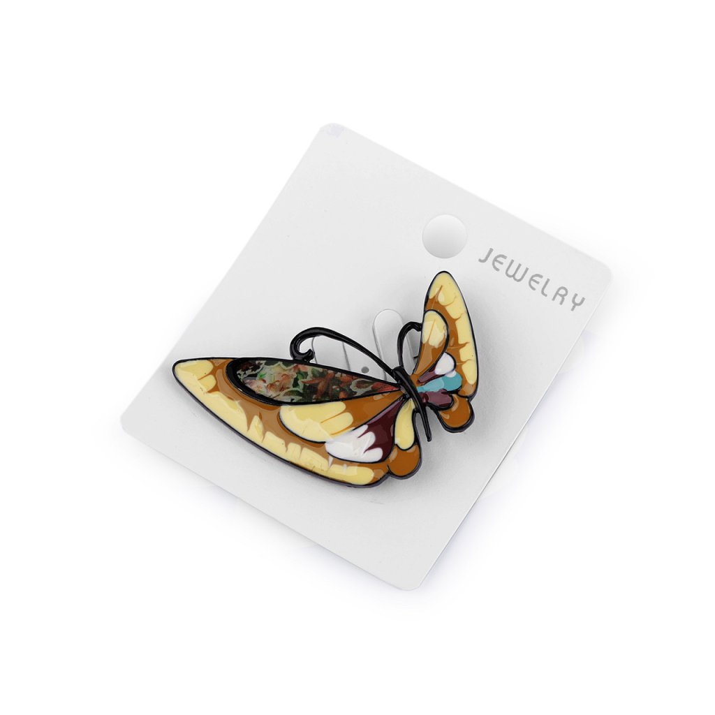 Brož motýla s barevným smaltem je elegantní a působivý doplněk, který dokáže oživit každý outfit. Je zpracována s důrazem na detail, což umocňuje její estetickou hodnotu. Z rubu má brožový špendlík. Můžete ji nosit nejen na oděvech, hodí se i k ozdobení klobouků, tašky či sepnutí šátku. Je skvělým dárkem pro každého, kdo ocení originální a hravé módní doplňky.