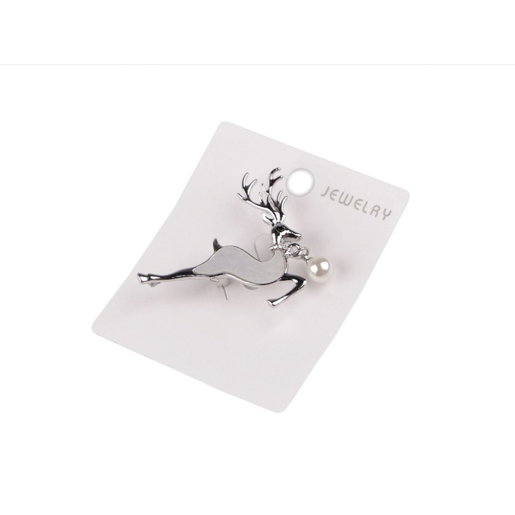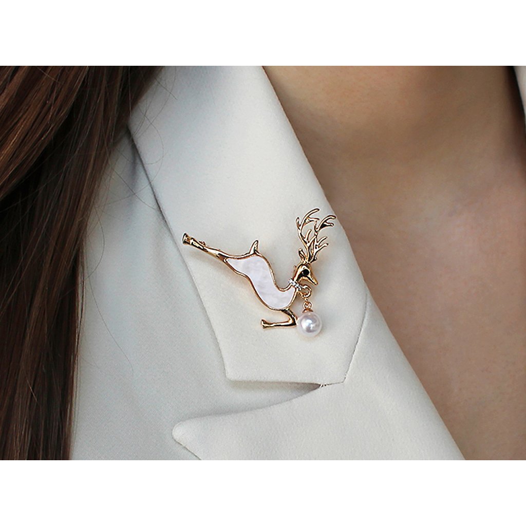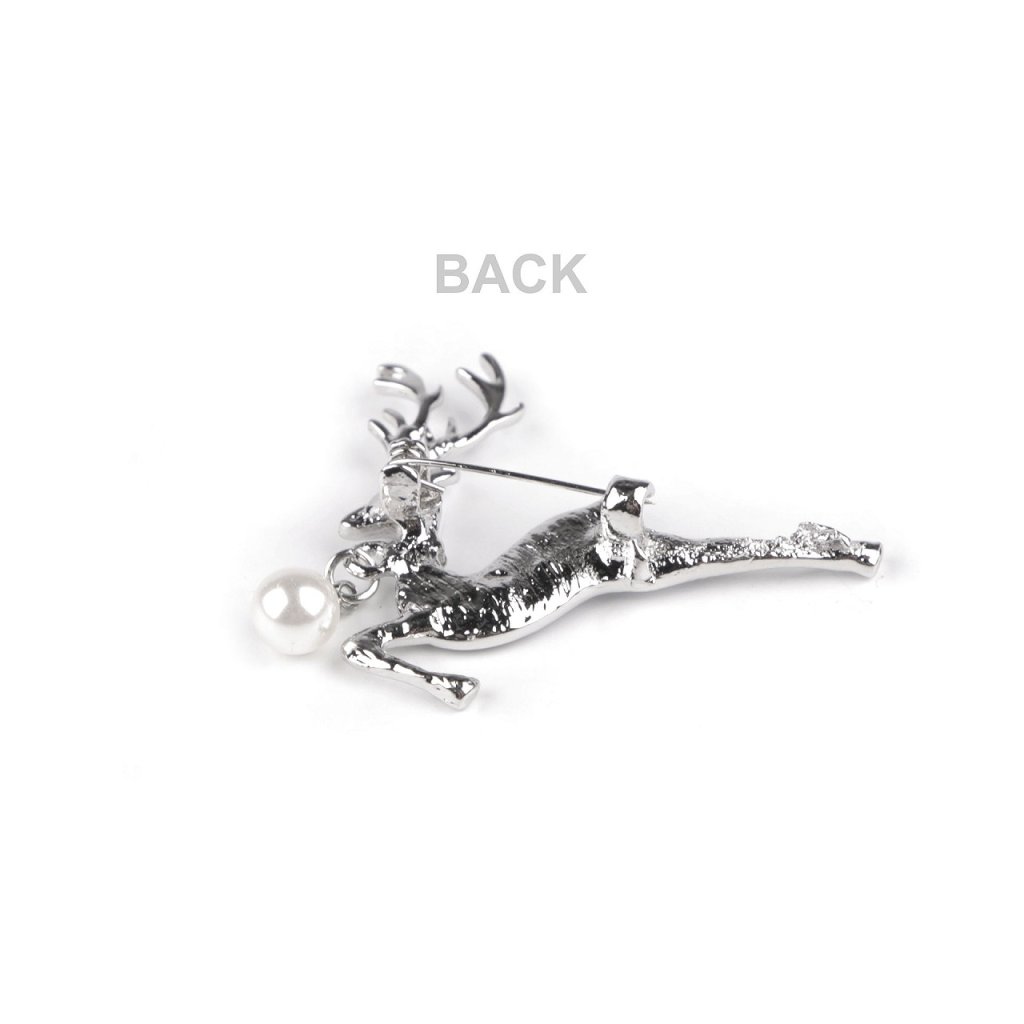 Elegantní brož s jelenem bude perfektním doplňkem vašeho oděvu. Je ozdobená perlou a imitací perleti. Díky broušeným kamínkům v oku a okolo krku se jemně třpytí, skvěle dozdobí košile, saka, svetry, kabelky či čepice. Hodí se i na ozdobné sepnutí šátku.