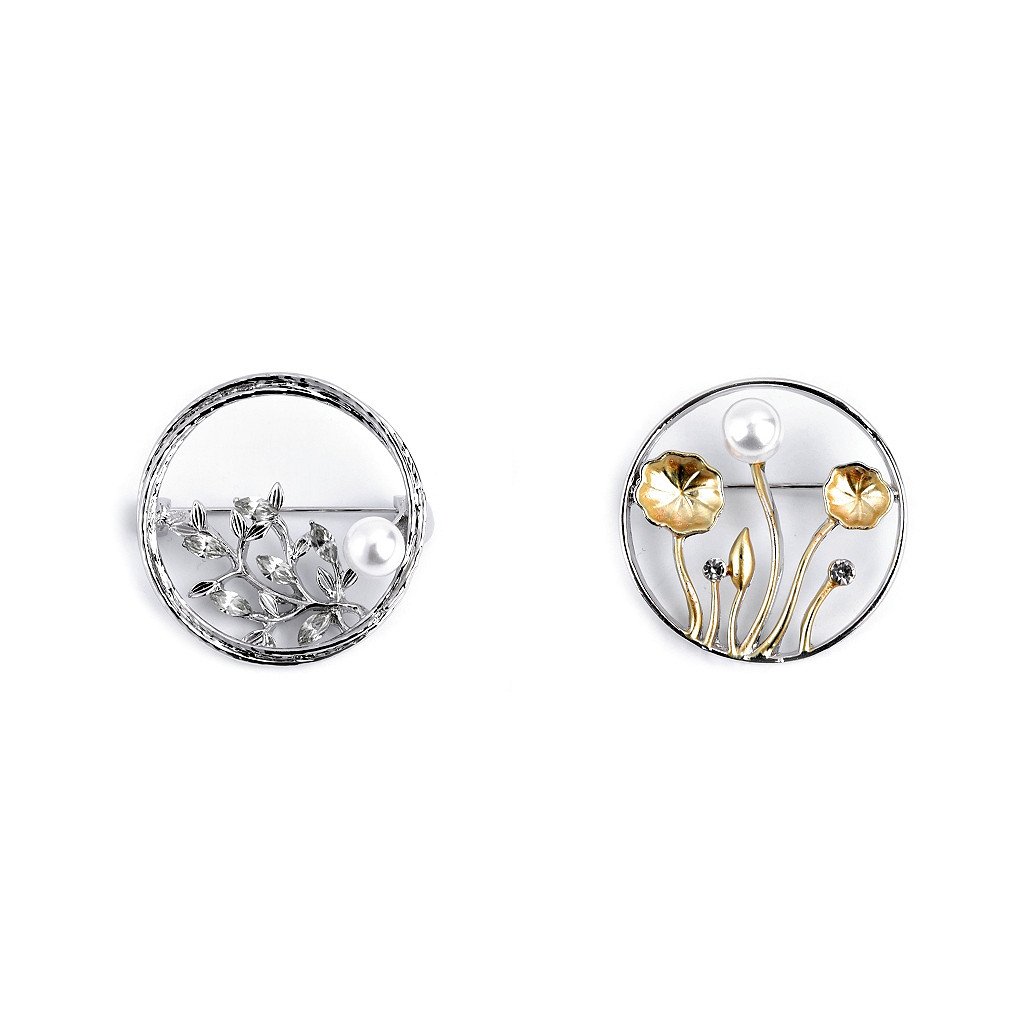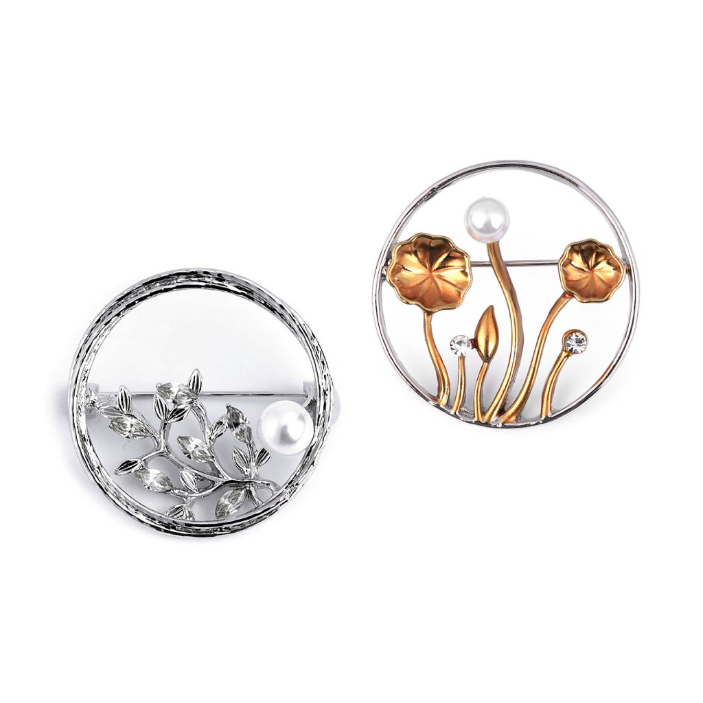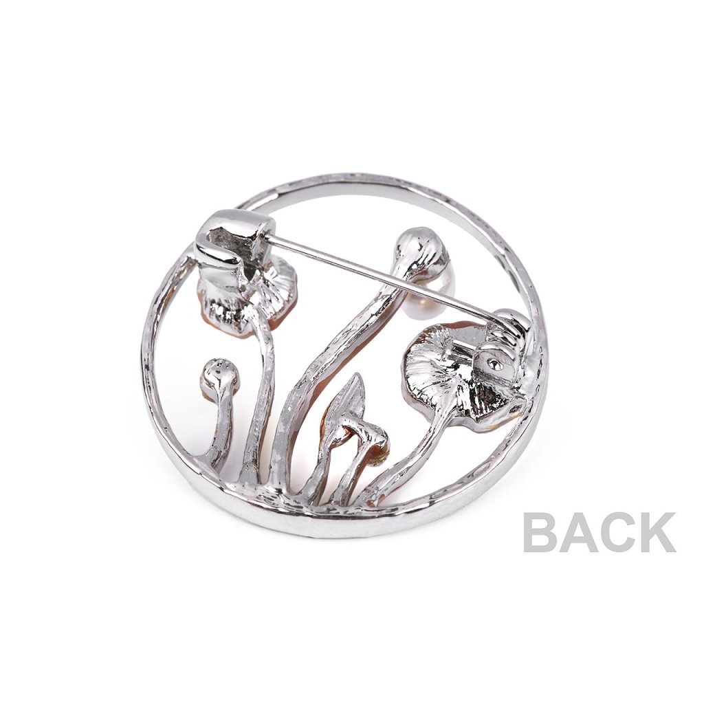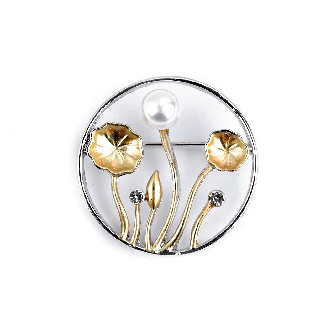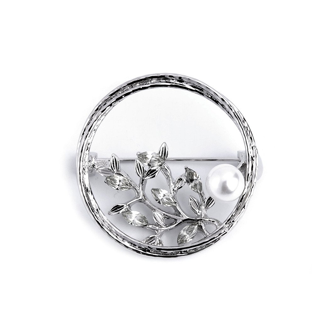 Kulatá brož s perlou a broušenými kamínky je velice elegantní. Vnitřní motiv znázorňuje květy. Bude se skvěle vyjímat na šatech, v klopě saka či na elegantním kloboučku nebo kabelce. Můžete ji použít na sepnutí šátku. Hodí se ke slavnostním událostem i na běžné nošení.