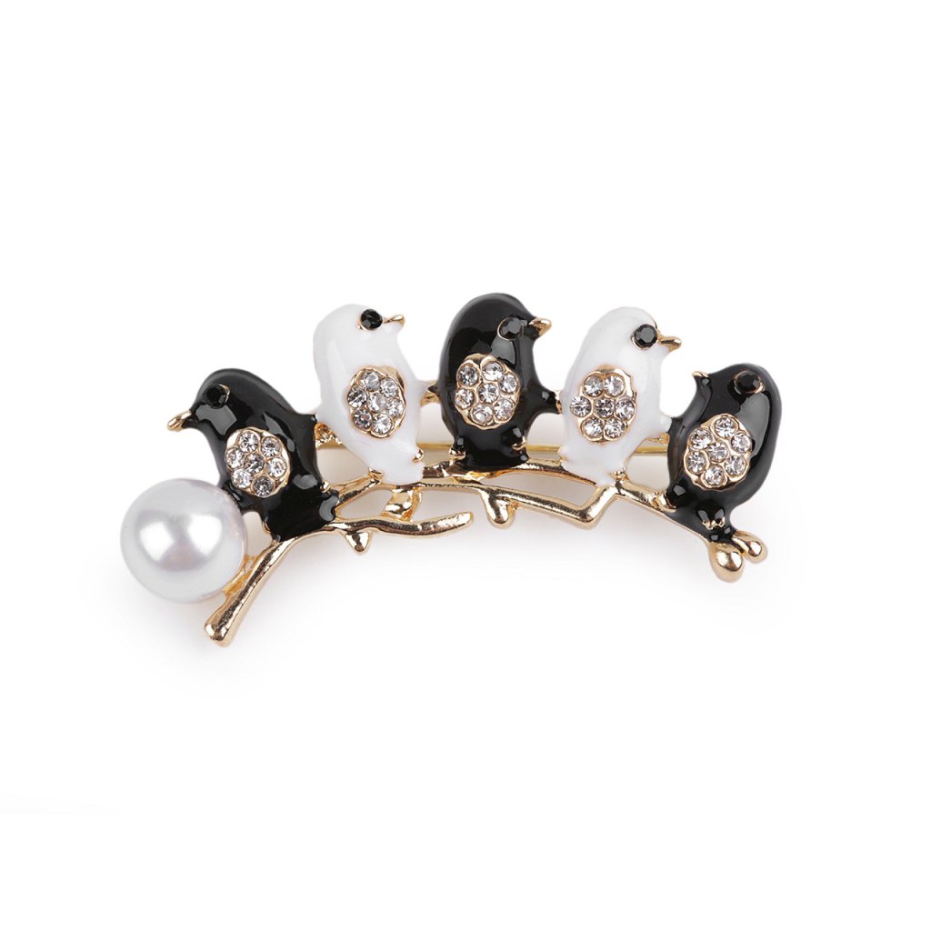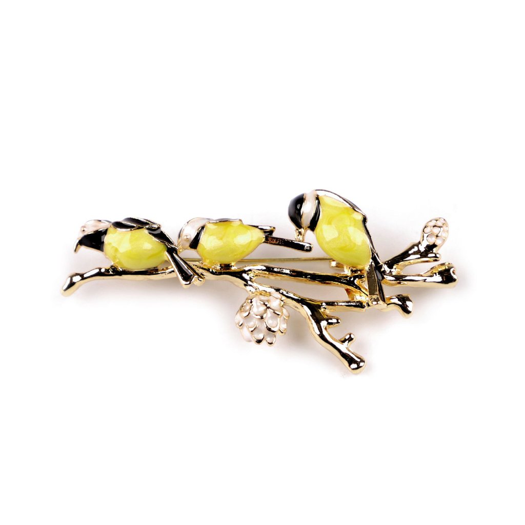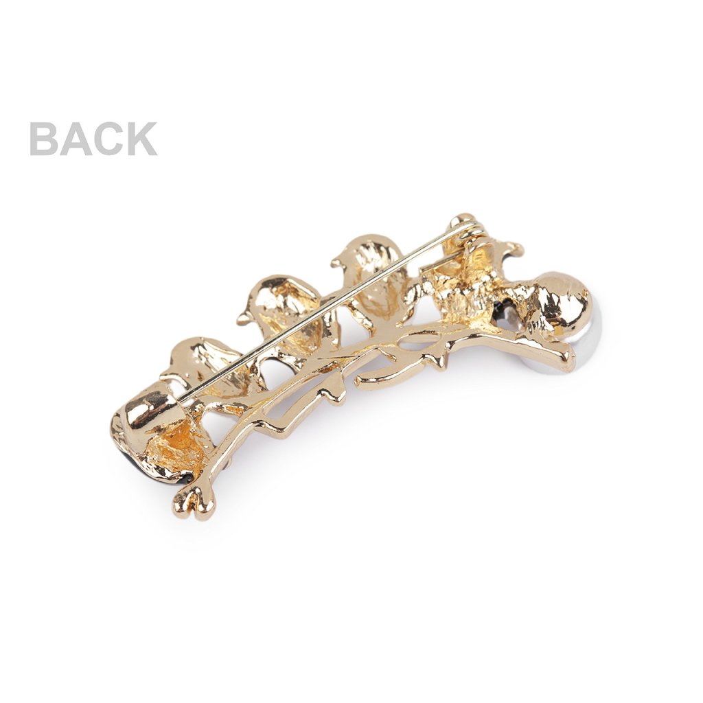 Kovová brož ptáčků na větvičce s perlou je velice elegantní, můžete ji využít na běžné nošení i na společenské události - návštěvy divadel, oslavy apod. Je ozdobená broušenými kamínky, díky kterým se nádherně třpytí. Z rubu má brož zavírací špendlík. Můžete ji nosit nejen na oděvech, hodí se i k ozdobení klobouků, tašky či sepnutí šátku.