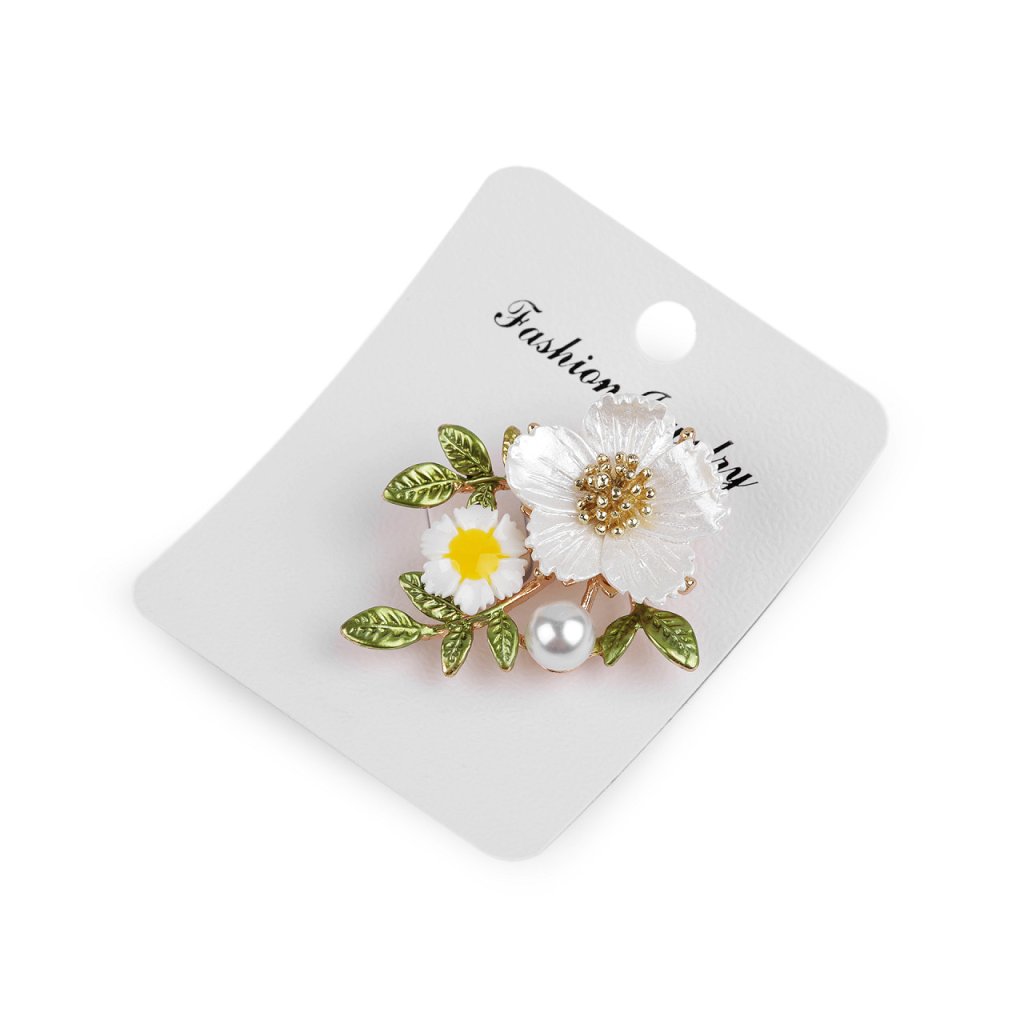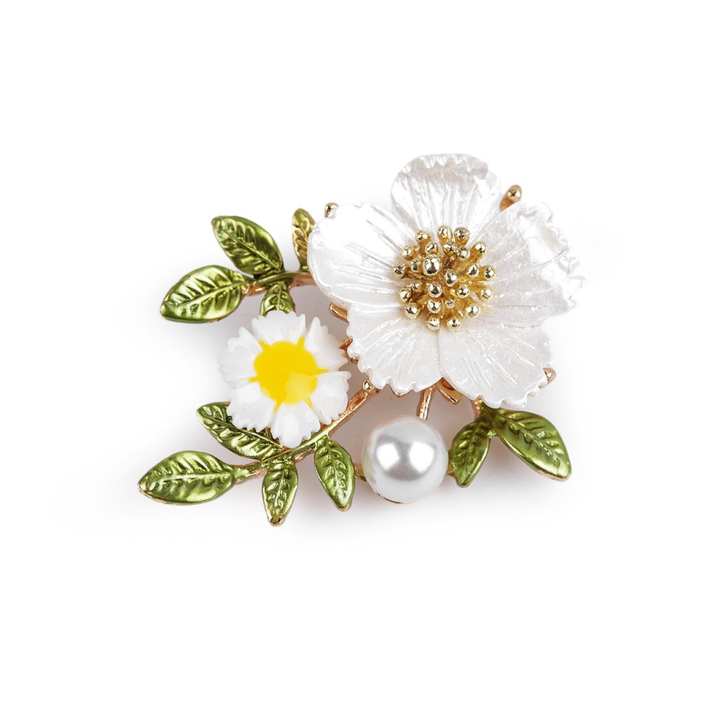 Elegantní květinová brož s perlou nadchne všechny romanticky založené ženy. Mohou ji nosit ve všední dny i na společenské události - návštěvy divadel, oslavy apod. Květy jsou plastové, s barevným smaltem, velký květ má perleťový lesk. Z rubu má brož zavírací špendlík. Můžete ji nosit nejen na oděvech, hodí se i k ozdobení klobouků, tašky či sepnutí šátku.