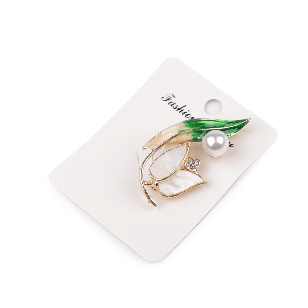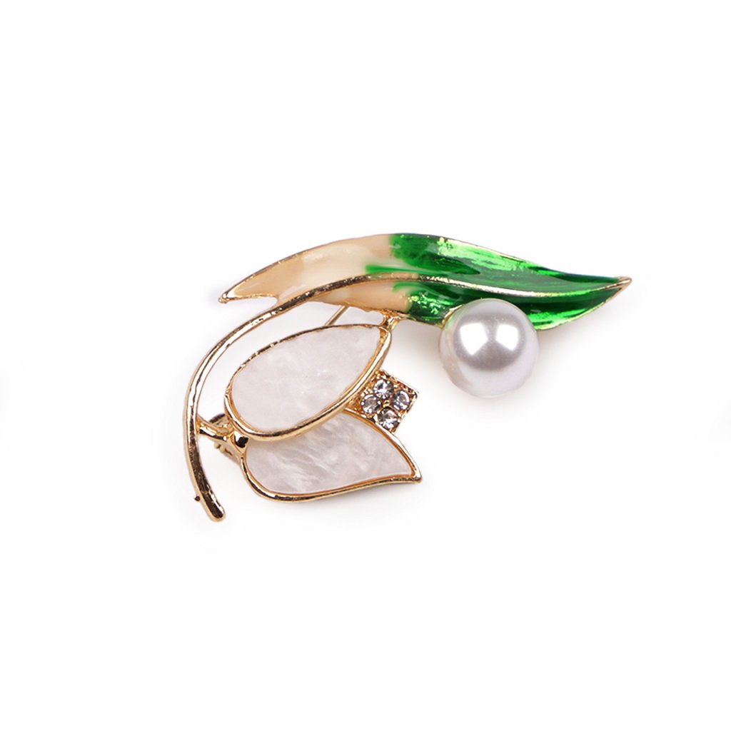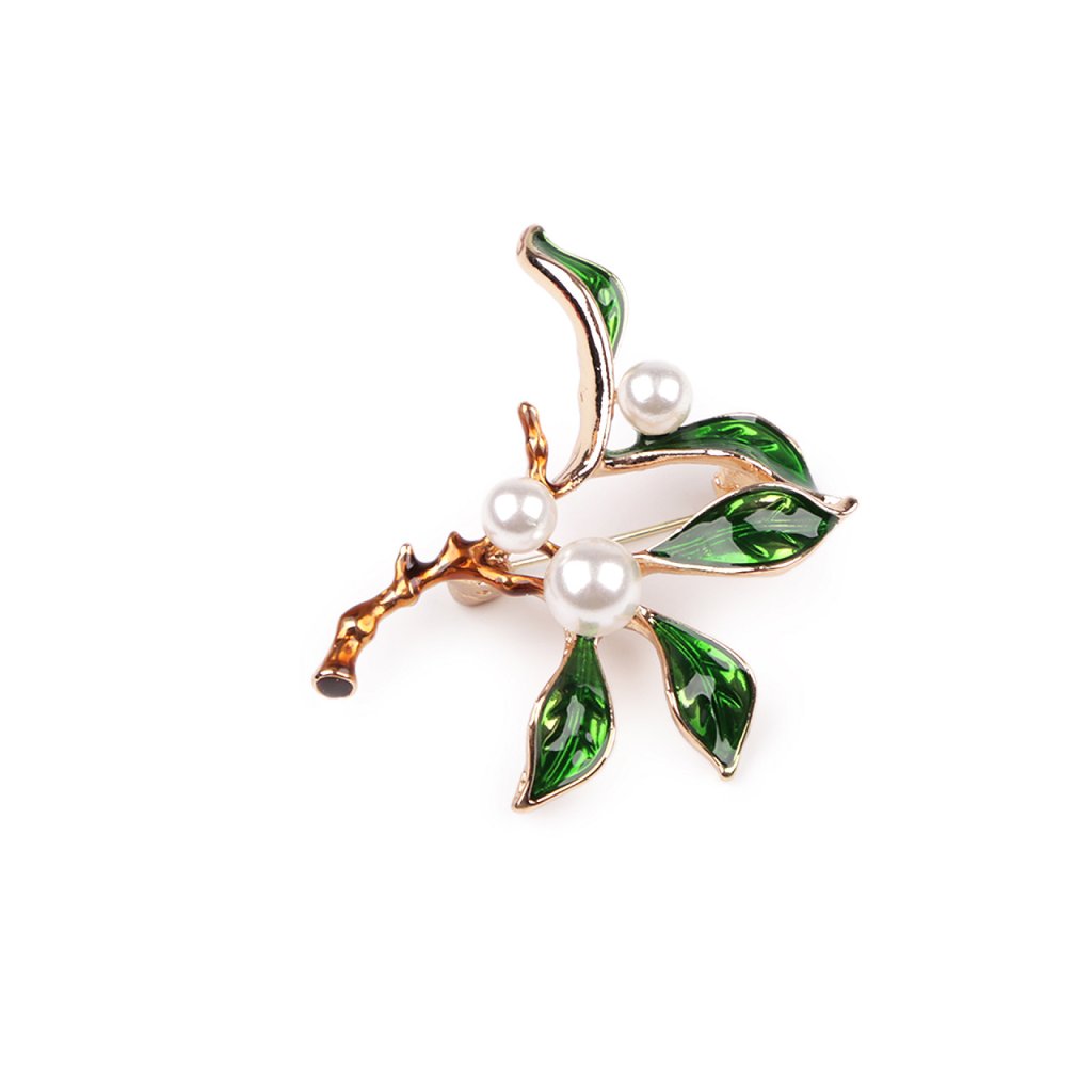 Elegantní brož s motivem rostlin bude perfektním doplňkem vašeho oděvu. Díky perlám a barevnému smaltu skvěle dozdobí halenky, šaty, saka, svetry, kabáty, kabelky či čepice. Hodí se i na ozdobné sepnutí šátku.