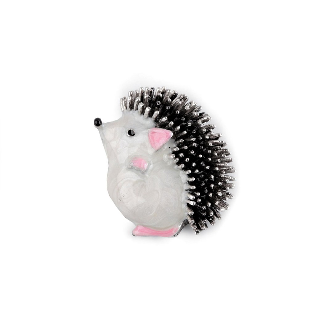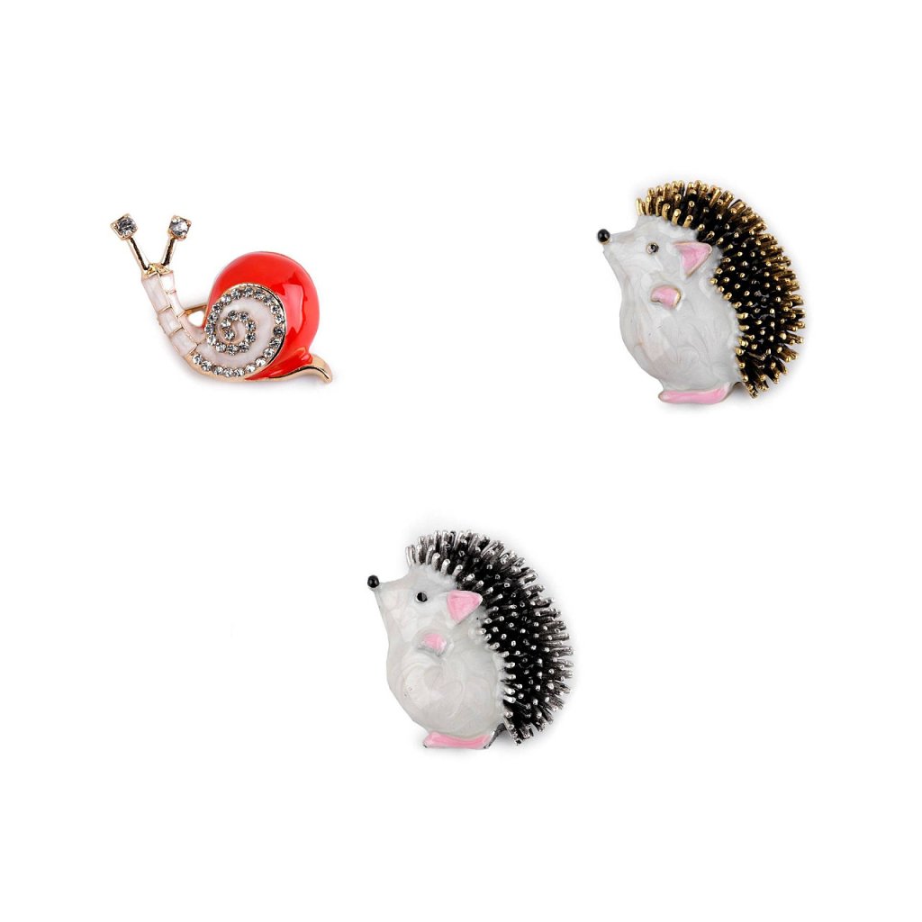 Brož šneka nebo ježka s barevným smaltem bude zajímavou ozdobou vašeho oděvu. Šneci jsou zkrášlení třpytivými broušenými kamínky, ježci mají kovově lesklé bodliny. Ze zadní strany mají brožový špendlík.