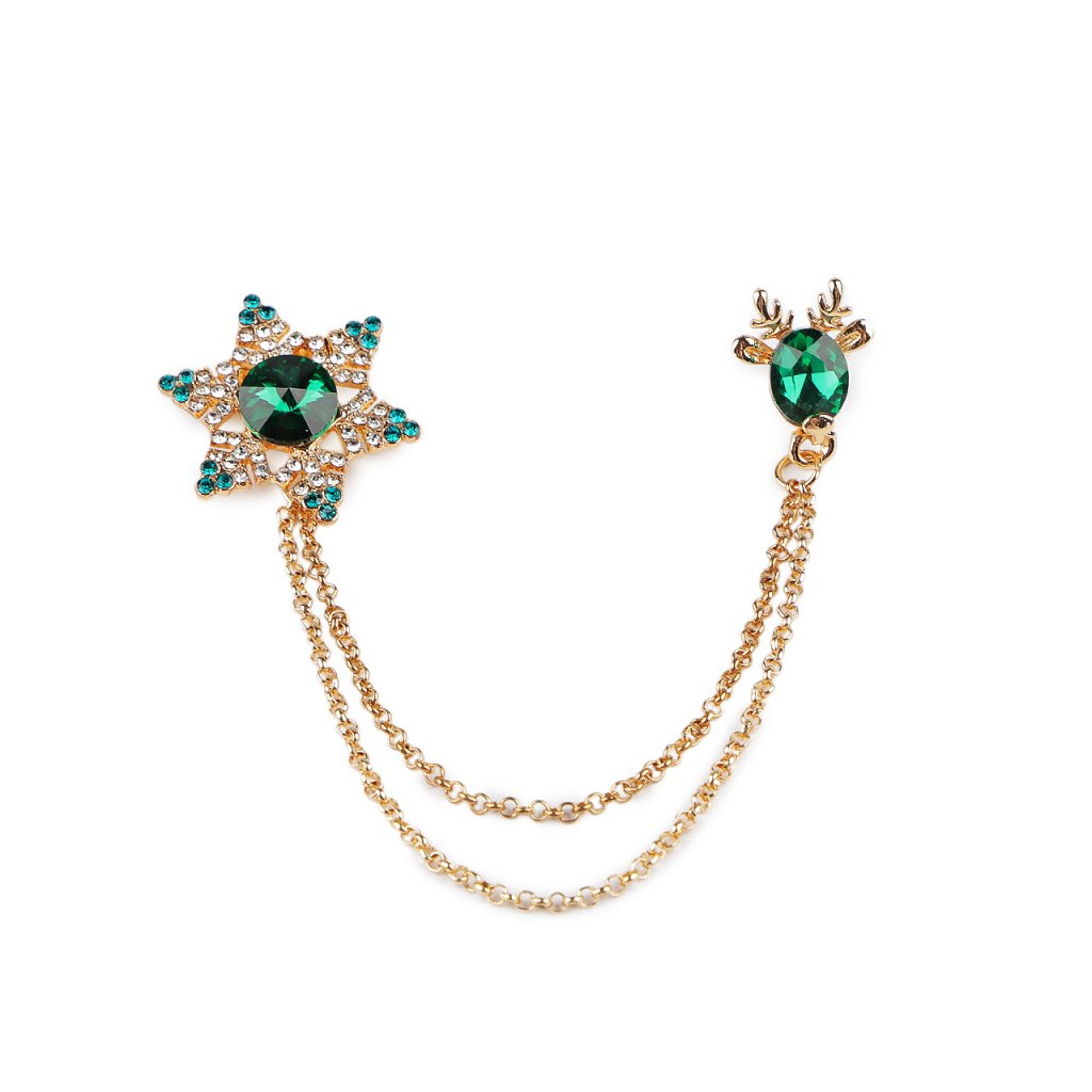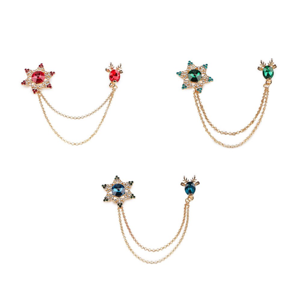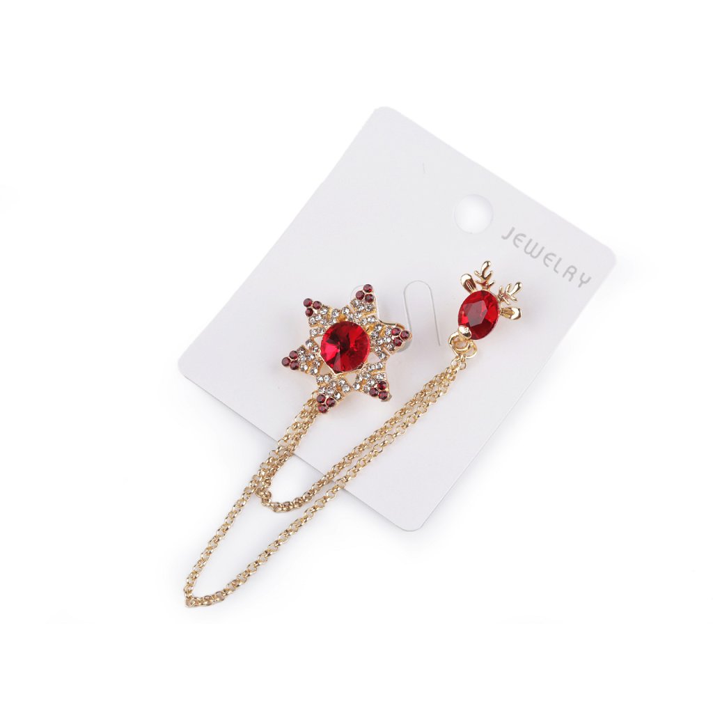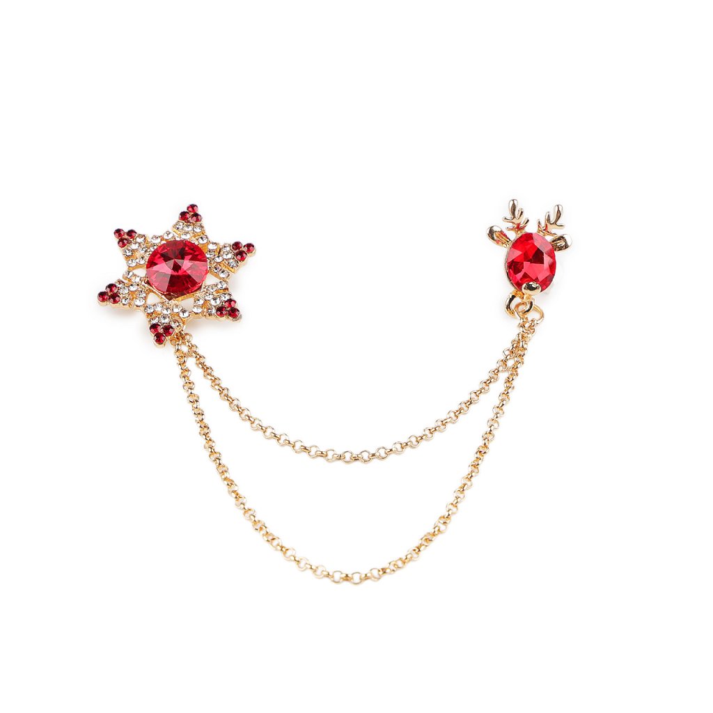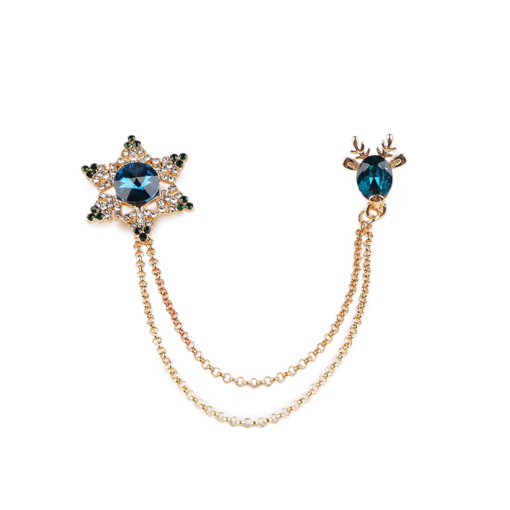 Brož / spona dragoun s vánočním designem je elegantním doplňkem, který zaujme na první pohled svým jemným a propracovaným designem. Je ozdobená broušenými kameny, na jedné straně najdete sněhovou vločku, která je propojená očkovými řetízky s jelení hlavou na druhé straně. Dragoun zajímavě oživí každý outfit. Můžete si jej připnout na sako, kabát, košili, halenku i tašku. Vločka má brožový špendlík, jelen má jednobodové zapínání jako odznak.