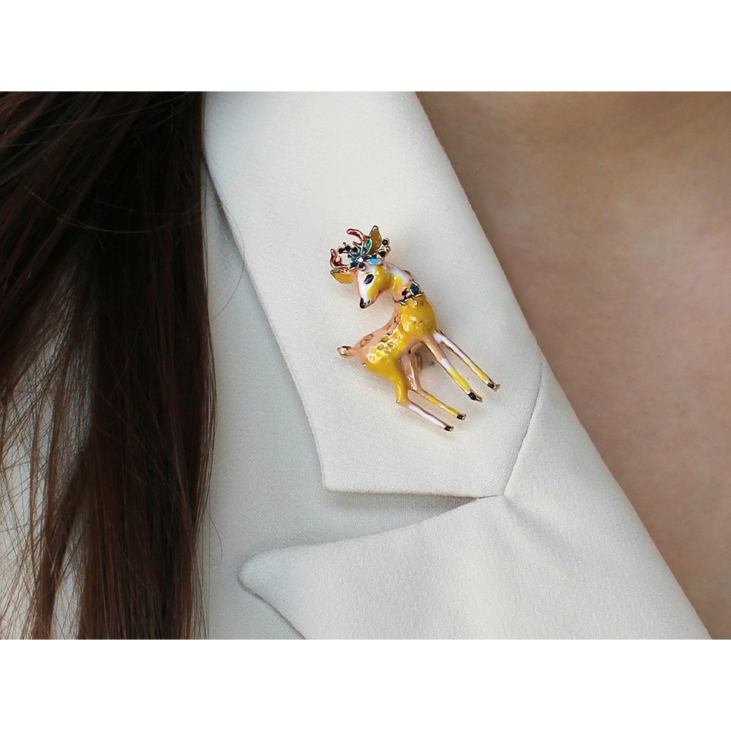 Brož srnky s barevným smaltem osloví všechny milovníky přírody a elegantních doplňků. Jemně zpracované detaily s broušenými kamínky dodávají této broži jedinečný šarm. Srnka vnese harmonii a půvab do každého dne, ať už jdete do práce nebo jen na procházku. Z rubu má brožový špendlík. Můžete ji nosit nejen na oděvech, hodí se i k ozdobení klobouků, tašky či sepnutí šátku.
