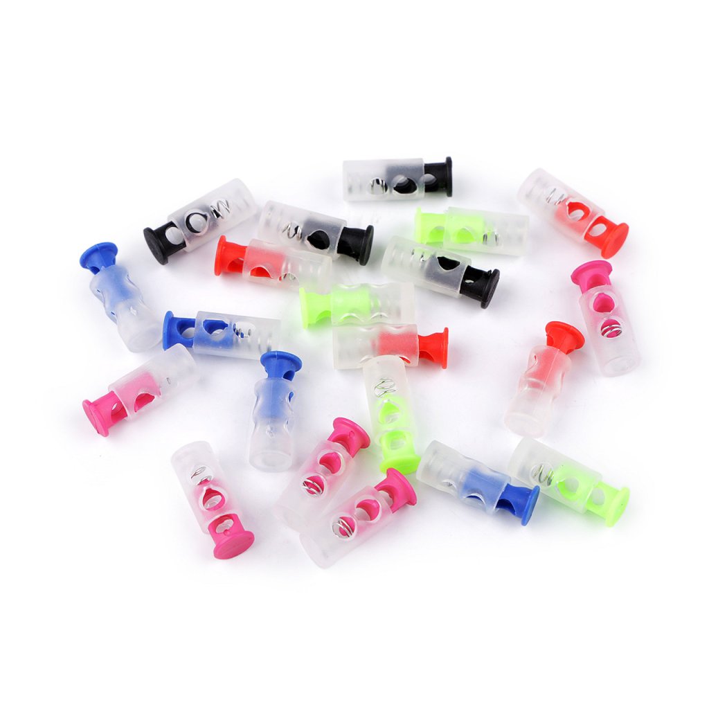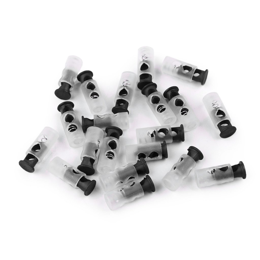 Brzda s dvěmi dírkami se používá jako součást oděvů a bund, díky ní si můžete utáhnout kapuci, poupravit délku dolního lemu sportovní bundy apod. Můžete ji využít i na batohy a vaky. Uvnitř brzdy je pružinka, která zajišťuje pevné uchycení. Pokud zamáčknete vyčnívající kolíček, můžete s brzdou popojíždět.