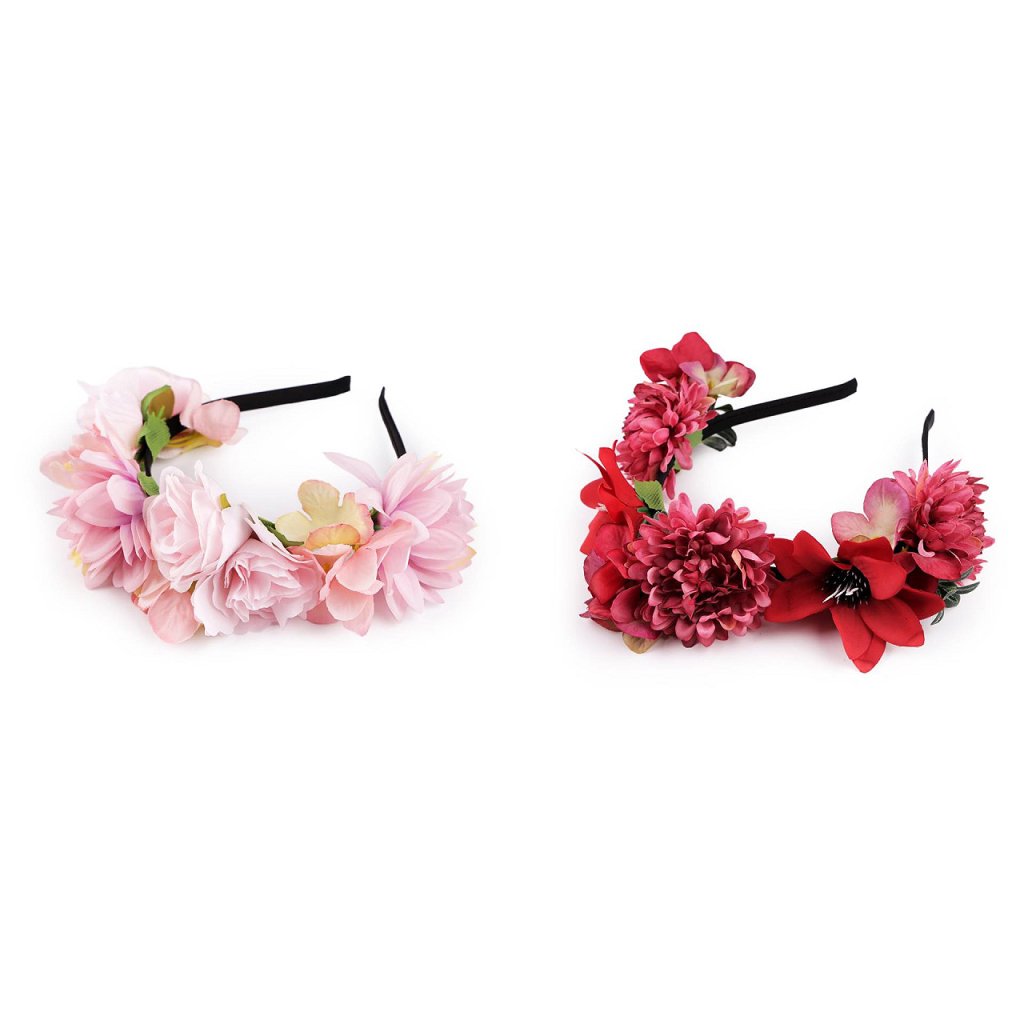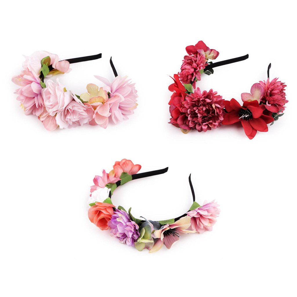 Květy jsou pevně přichycené ke kovové čelence, která je potažená saténovou stužkou.
