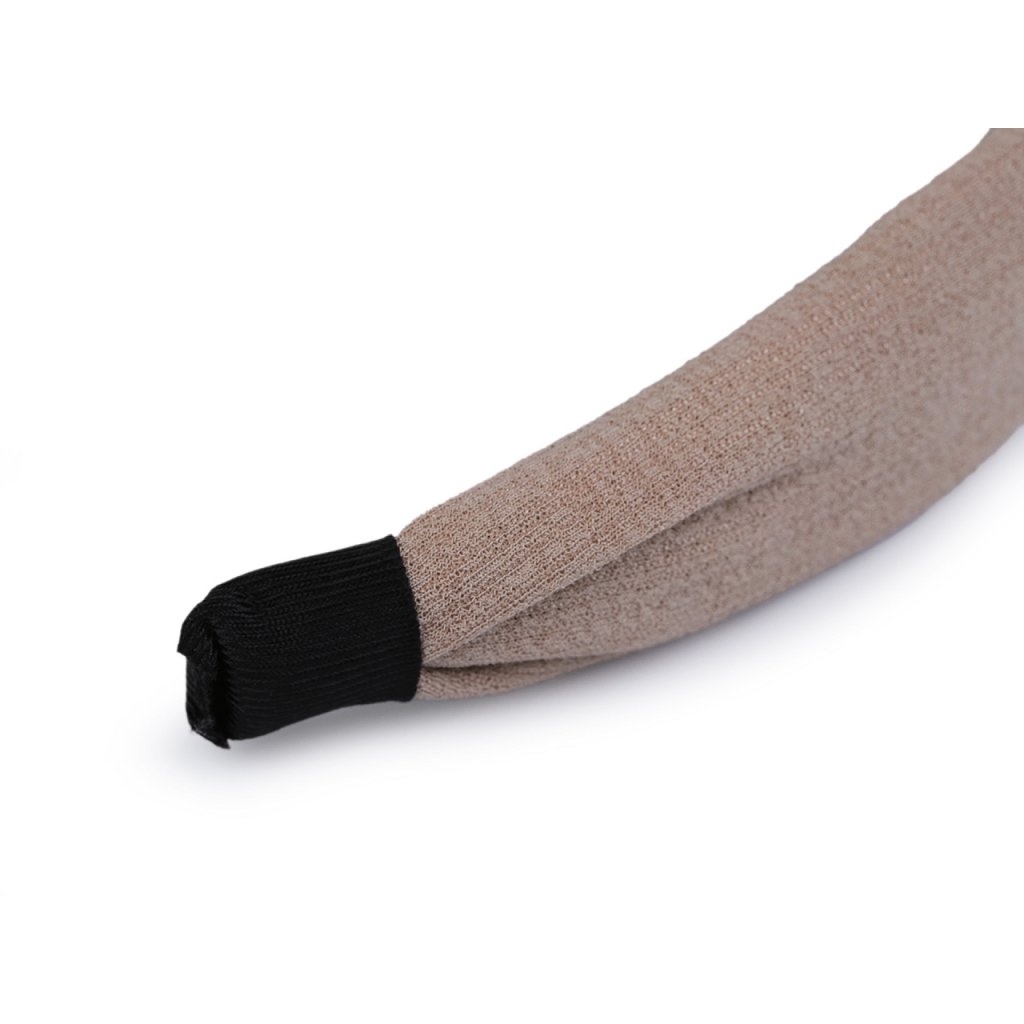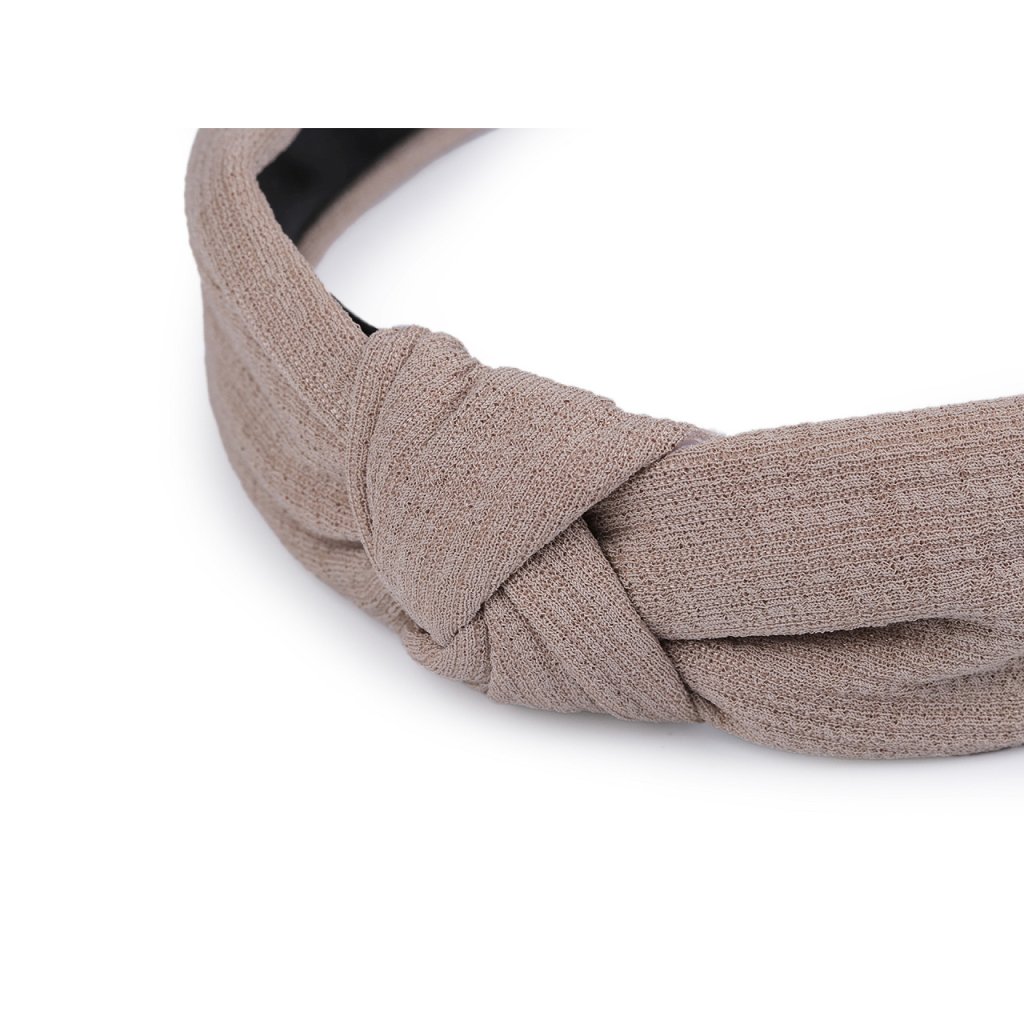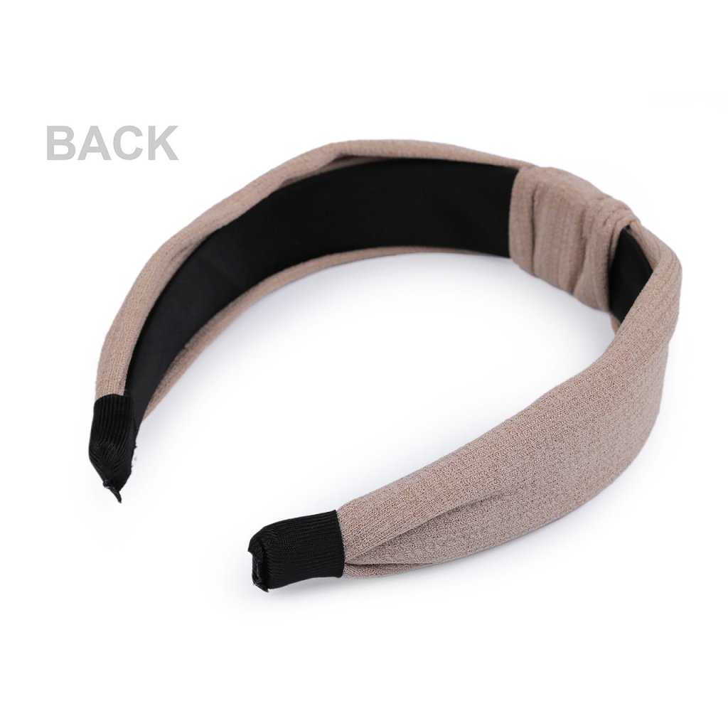 Široká čelenka je ozdobená jednobarevnou látkou se strukturou proužků. Uprostřed je látka spletená do uzlu. Čelenka je elegantní a stylová, využijete ji na běžné nošení i na párty.