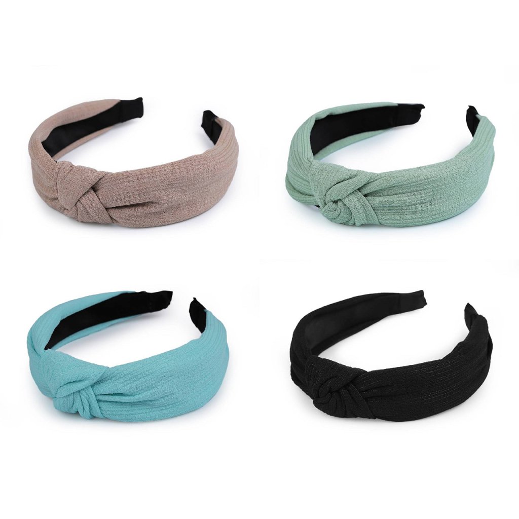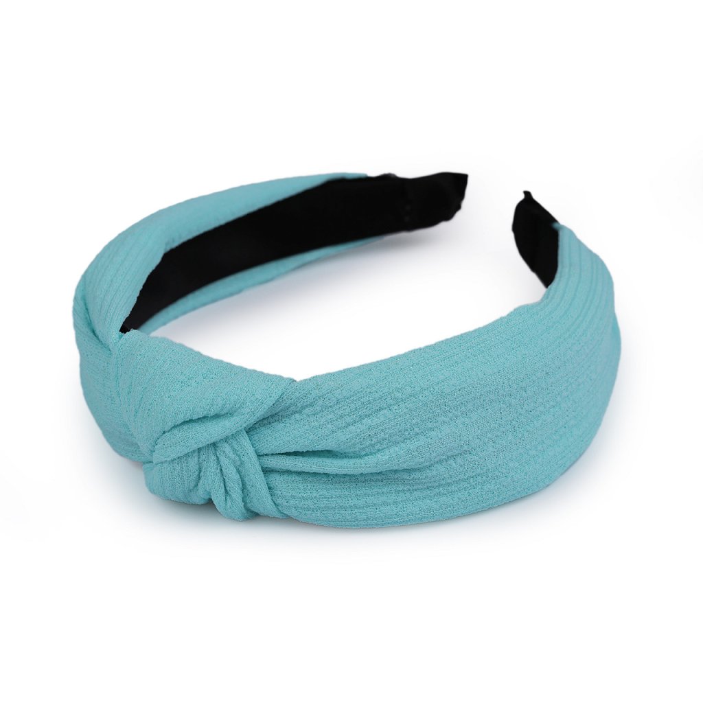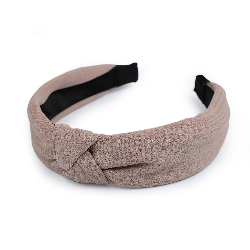 Široká čelenka je ozdobená jednobarevnou látkou se strukturou proužků. Uprostřed je látka spletená do uzlu. Čelenka je elegantní a stylová, využijete ji na běžné nošení i na párty.