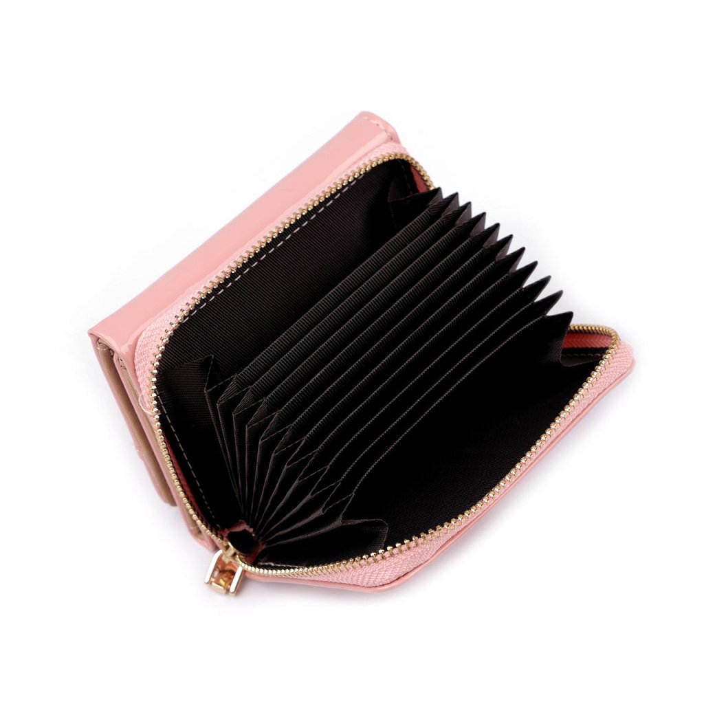 Přední část peněženky se uzavírá na patent. Uvnitř je 5 přihrádek na kreditní karty, 1 průhledná přihrádka na doklady a dlouhá přihrádka na bankovky. Mincovník v zadní části peněženky se zapíná na zip, uvnitř má 2 přihrádky na mince a harmoniku s 9 kapsami.