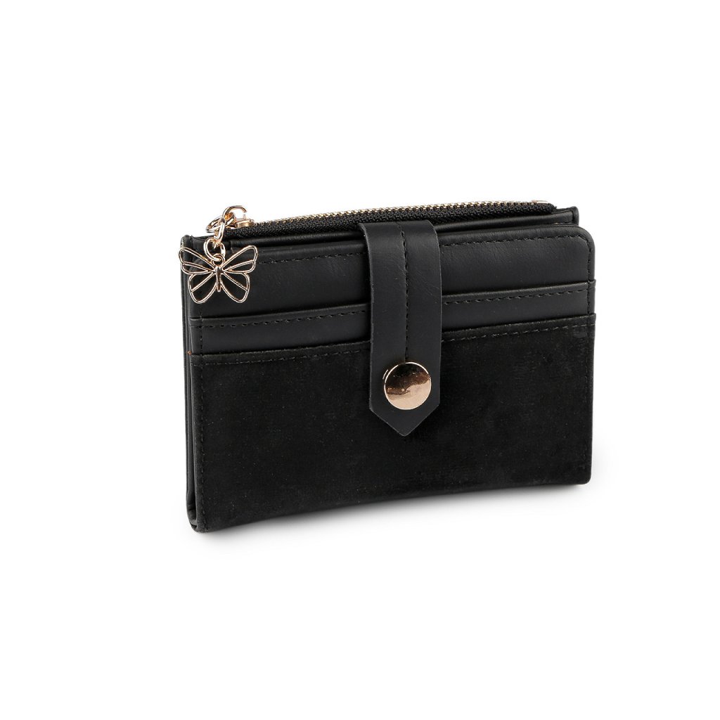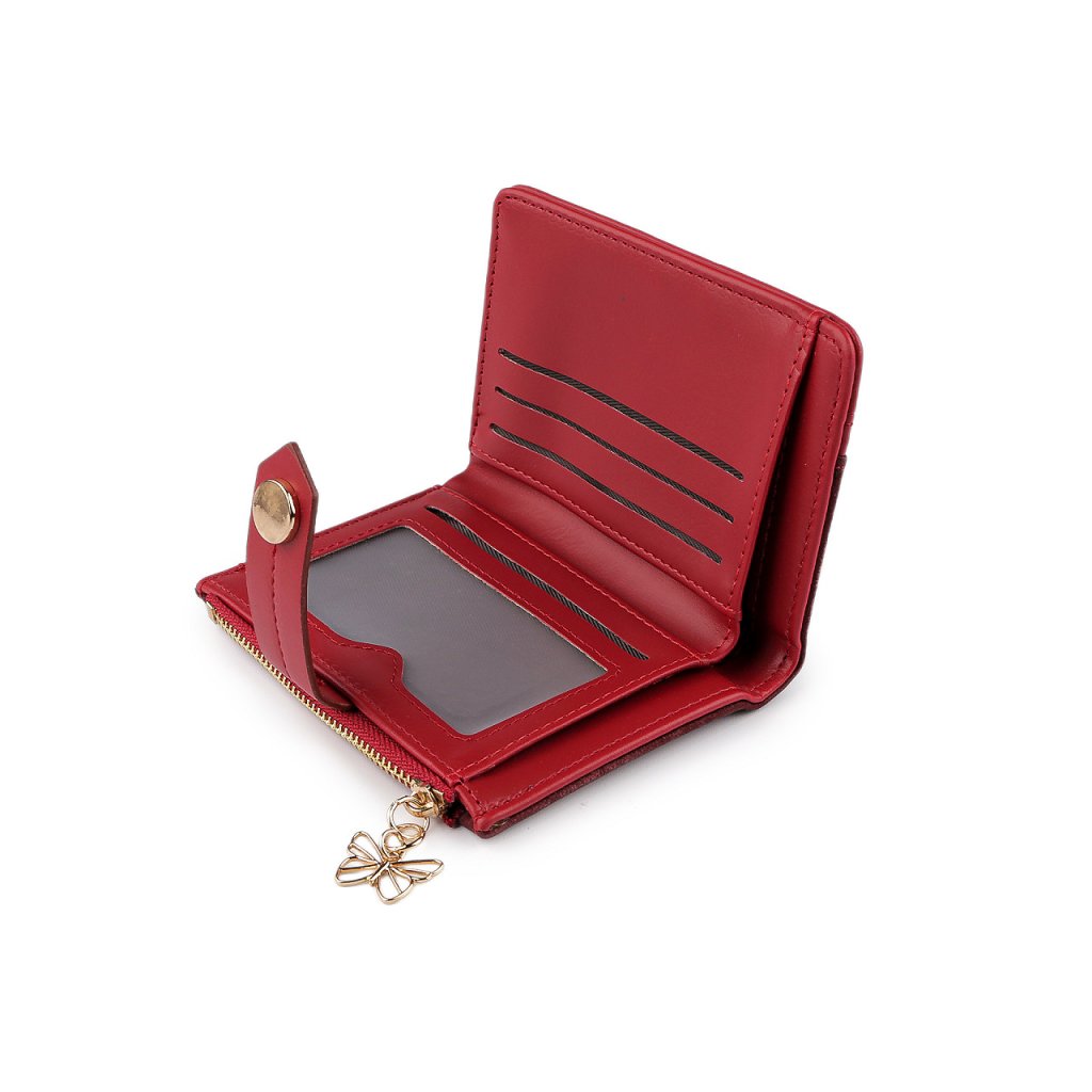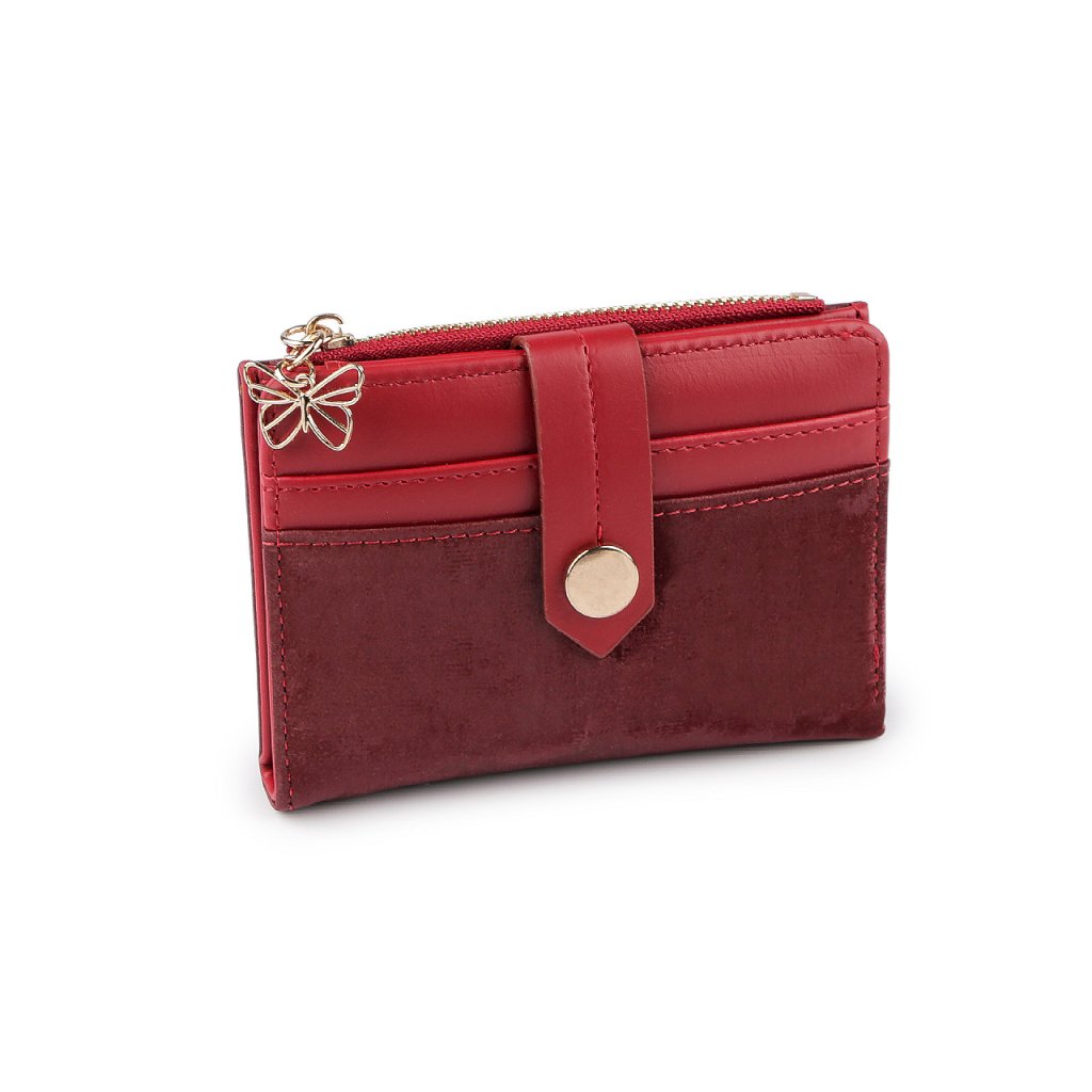 Přední strana peněženky se zapíná na zápinku s patentem. Uvnitř najdete 6 přihrádek na kreditní karty, z toho je jedna průhledná a přihrádku na bankovky. Kapsička na mince se zapíná na zip, je ozdobená přívěskem kovového motýla.