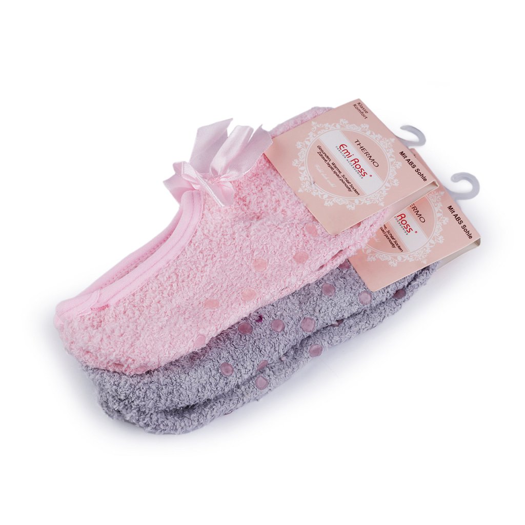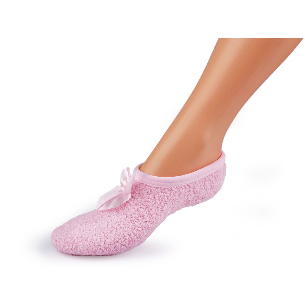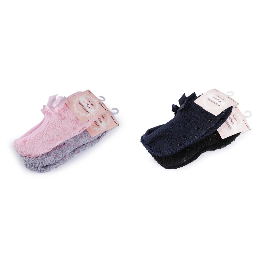 Romantické froté ponožky si oblíbíte na spaní a domácí lenošení, protože jsou neuvěřitelně měkké a hebké. Jsou ozdobené saténovou mašlí, mají plochý šev ve špičce - netlačí. Díky pružnému a přizpůsobivému okraji dobře sedí na noze. Na spodní straně mají protiskluzové puntíky.