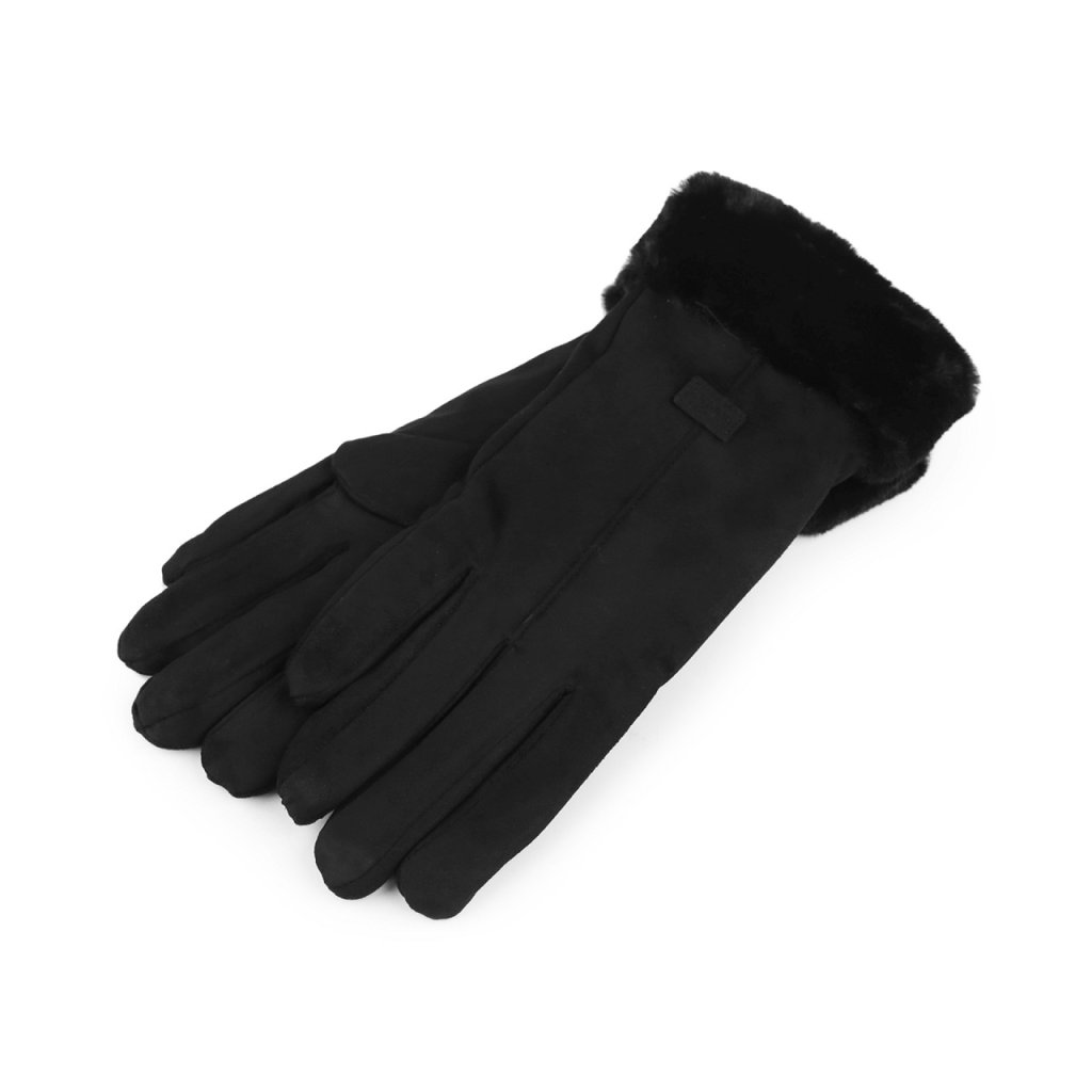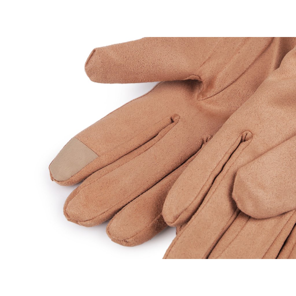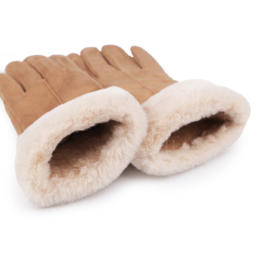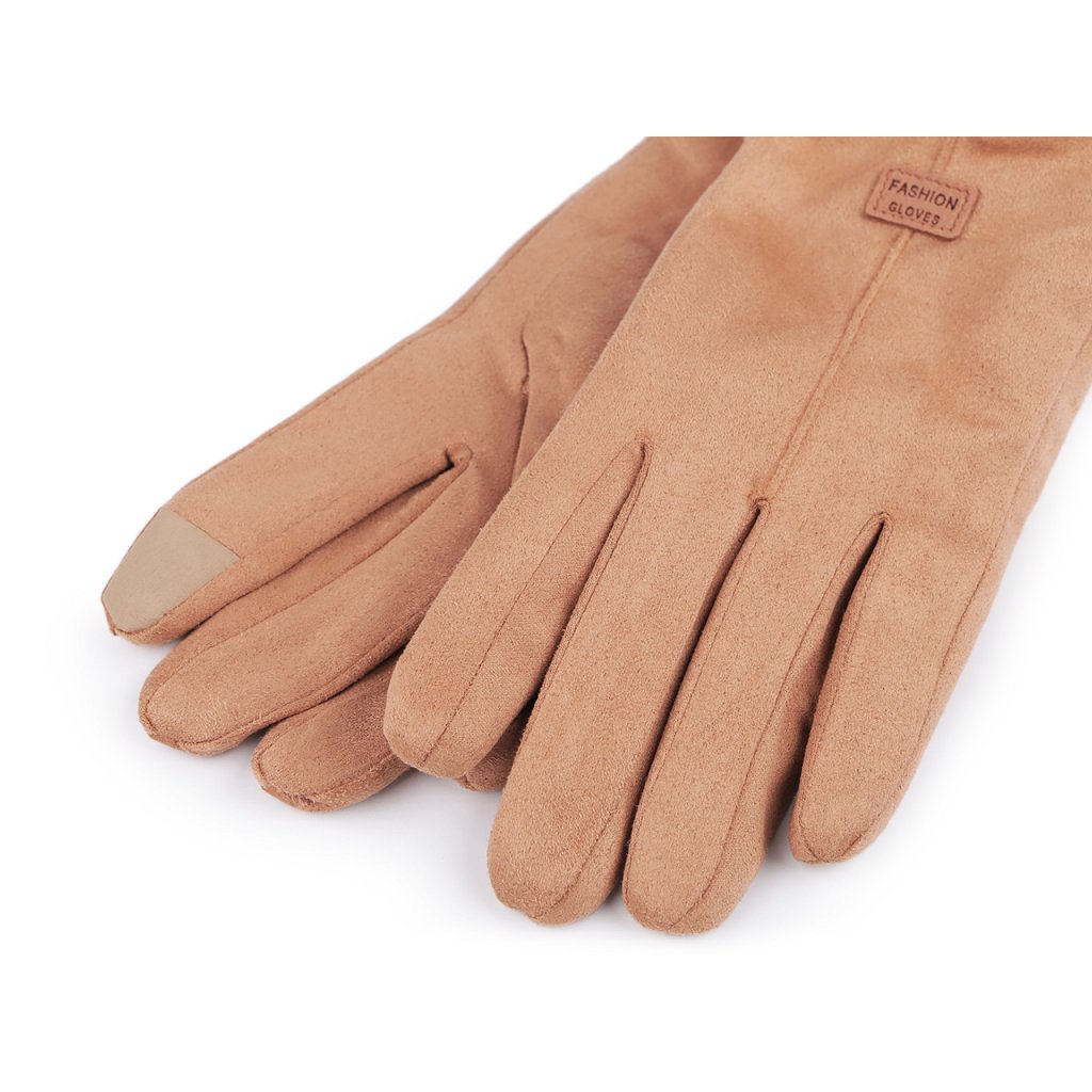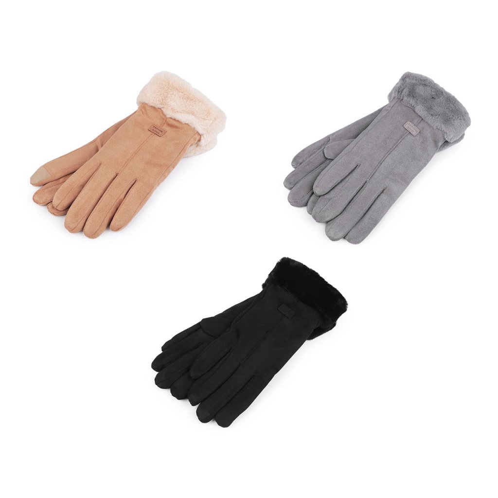 Elegantní dámské rukavice zdobí lem z umělé kožešiny a štítek s nápisem Fashion gloves. Rukavice jemně pruží, jejich povrch připomíná broušenou kůži. Uvnitř mají příjemný plyšový kožíšek. Hodí se do zimy i do chladnějšího podzimního počasí.