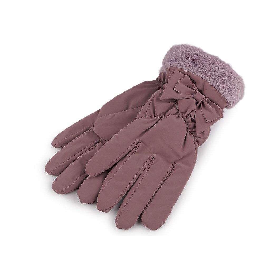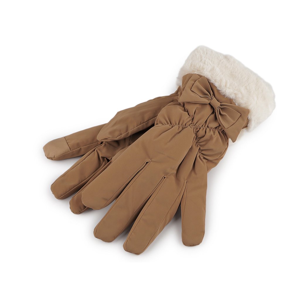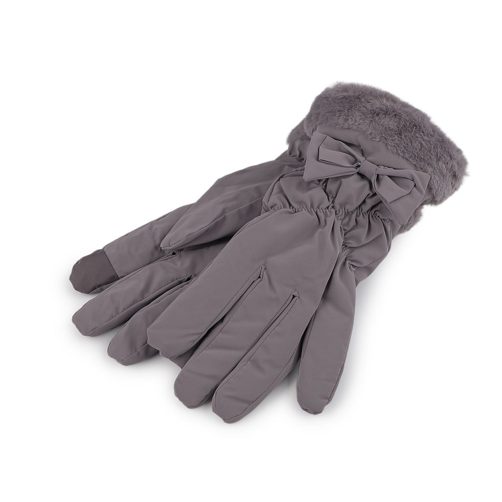 Elegantní šusťákové rukavice jsou ozdobené mašlí a lemem z umělé kožešiny. Využijete je ke sportovním bundám a vestám, ale hodí se i na běžné nošení ke kabátům. Na ukazováčku pravé ruky je speciální tkanina, díky které můžete ovládat dotykové přístroje - mobil, tablet, bankomat apod. Uvnitř mají plyšový kožíšek, který vás příjemně zahřeje. Jsou vhodné do zimy nebo do chladnějšího podzimního počasí.