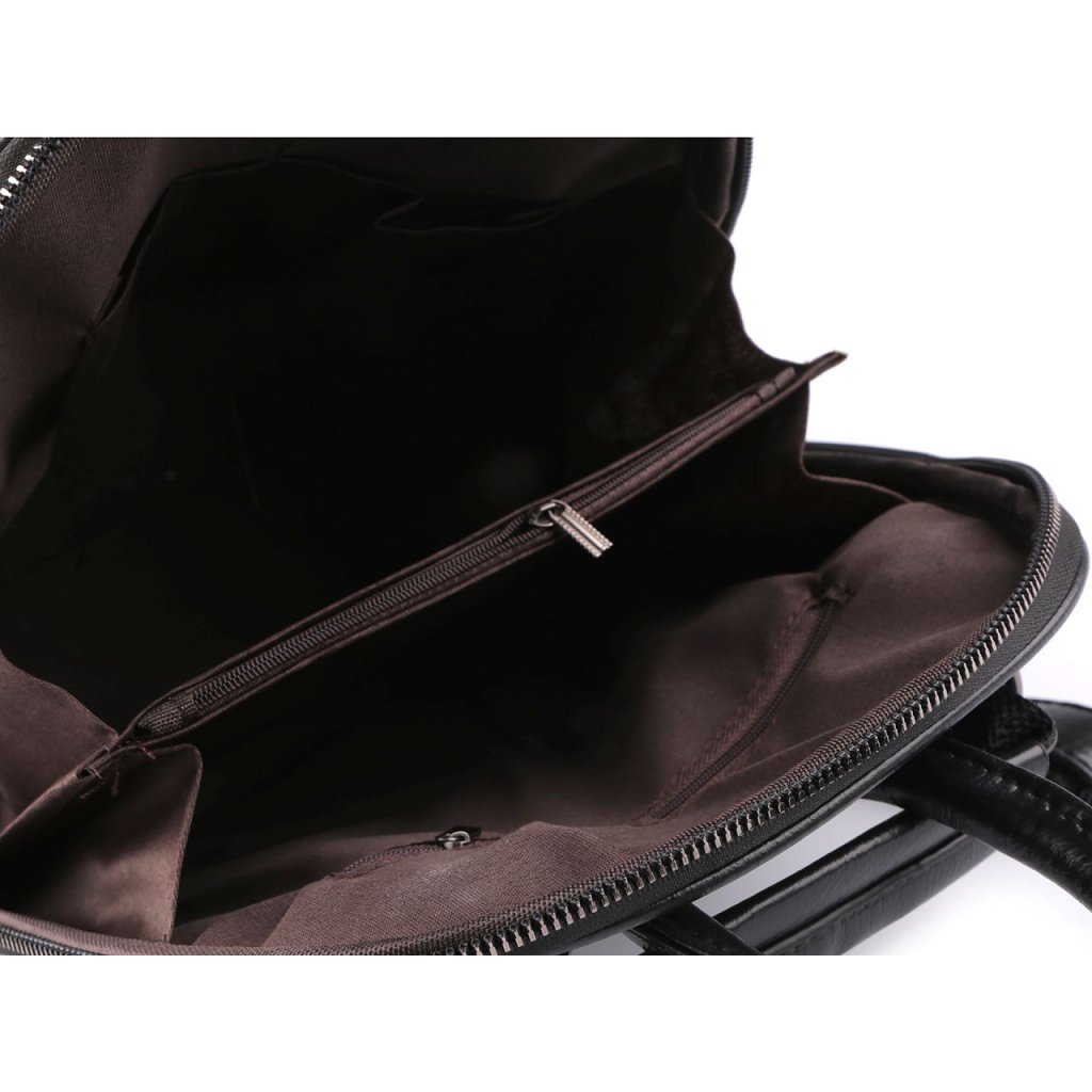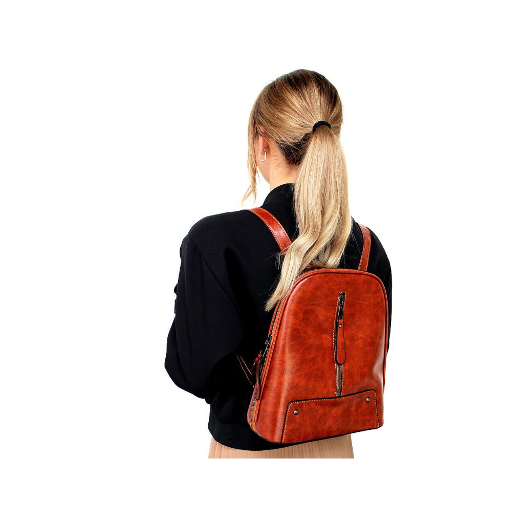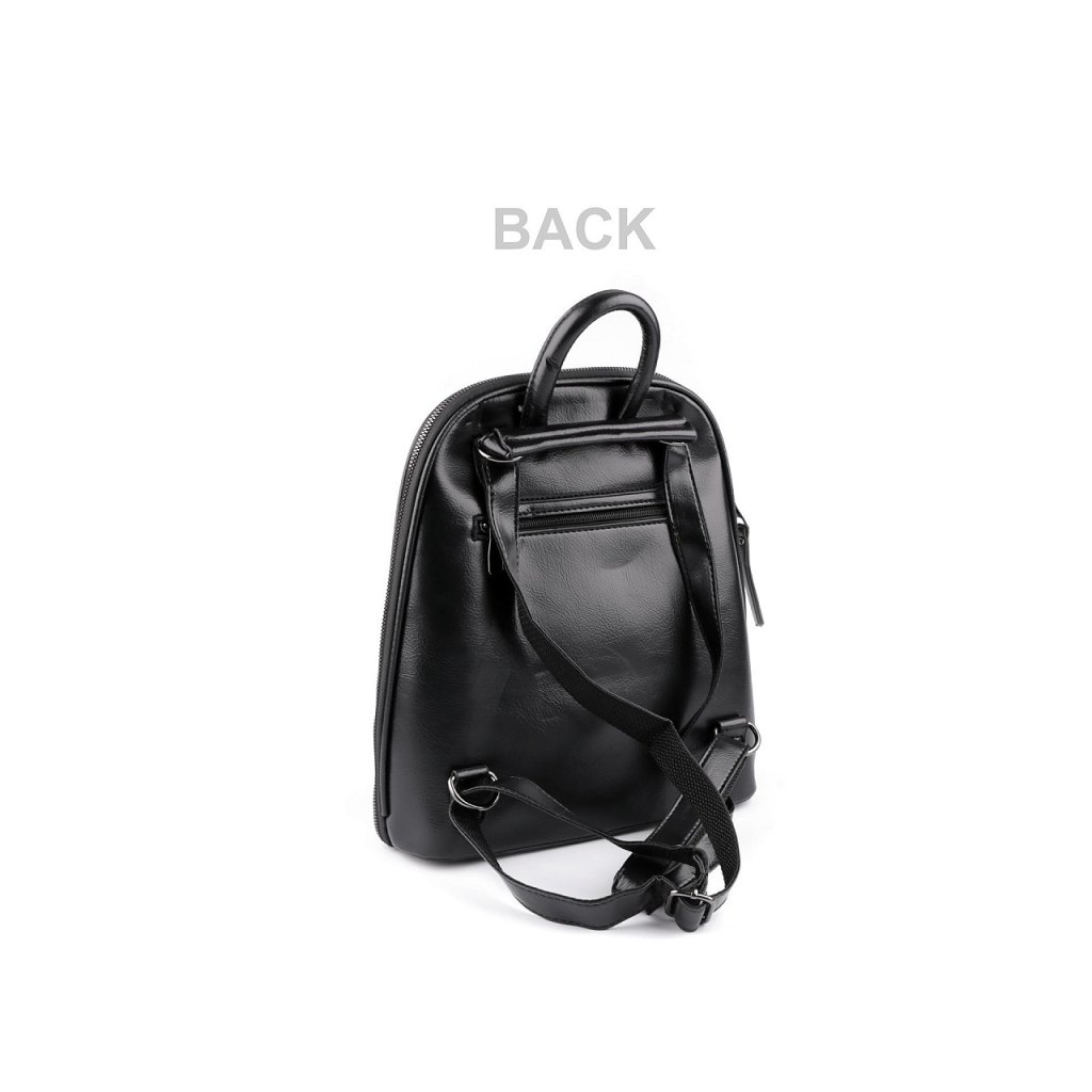 Hlavní kapsa je na zip, je velice prostorná. Je rozdělená přepážkou na dva oddíly, v přepážce je umístěná kapsa na zip. Nechybí ani vnitřní kapsička na zip na drobnosti či mobil a kapsa na uložení plochých předmětů. Zip na přední straně batohu je pouze ozdobný. Na zadní straně batohu je umístěná malá plochá kapsa na zip. Ucho je pevné, krátké do ruky či na pověšení. Popruhy jsou dostatečně dlouhé s možností regulace pro pohodlné užívání během celého dne. Jsou podšité látkou. Nahoře jsou popruhy v kovových průvlecích, které slouží na protáhnutí popruhů na nošení křížem jako kabelka. Dno batohu je opatřené kovovými hřeby, které jej chrání před poškozením.