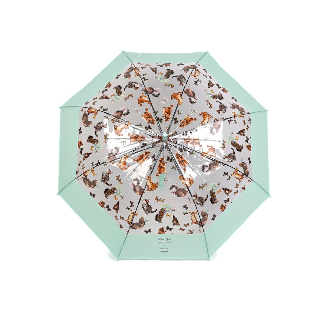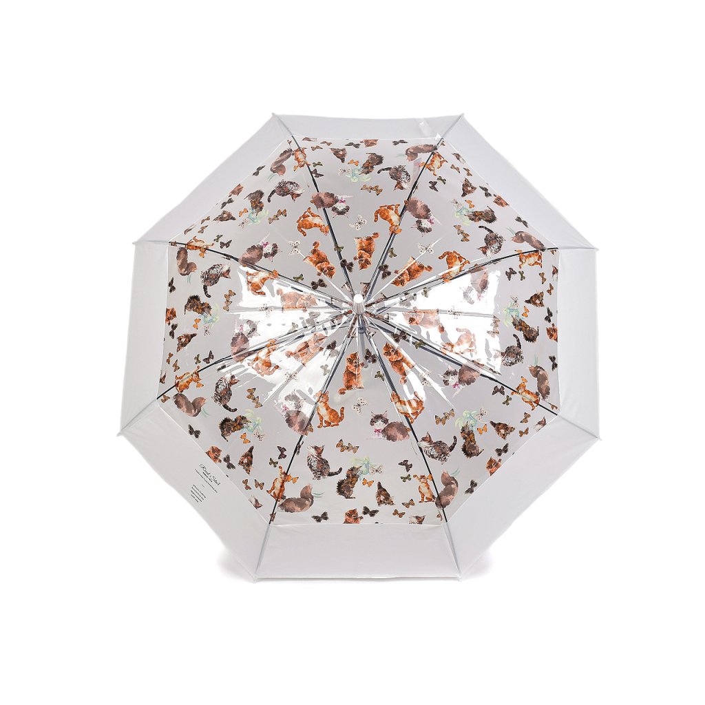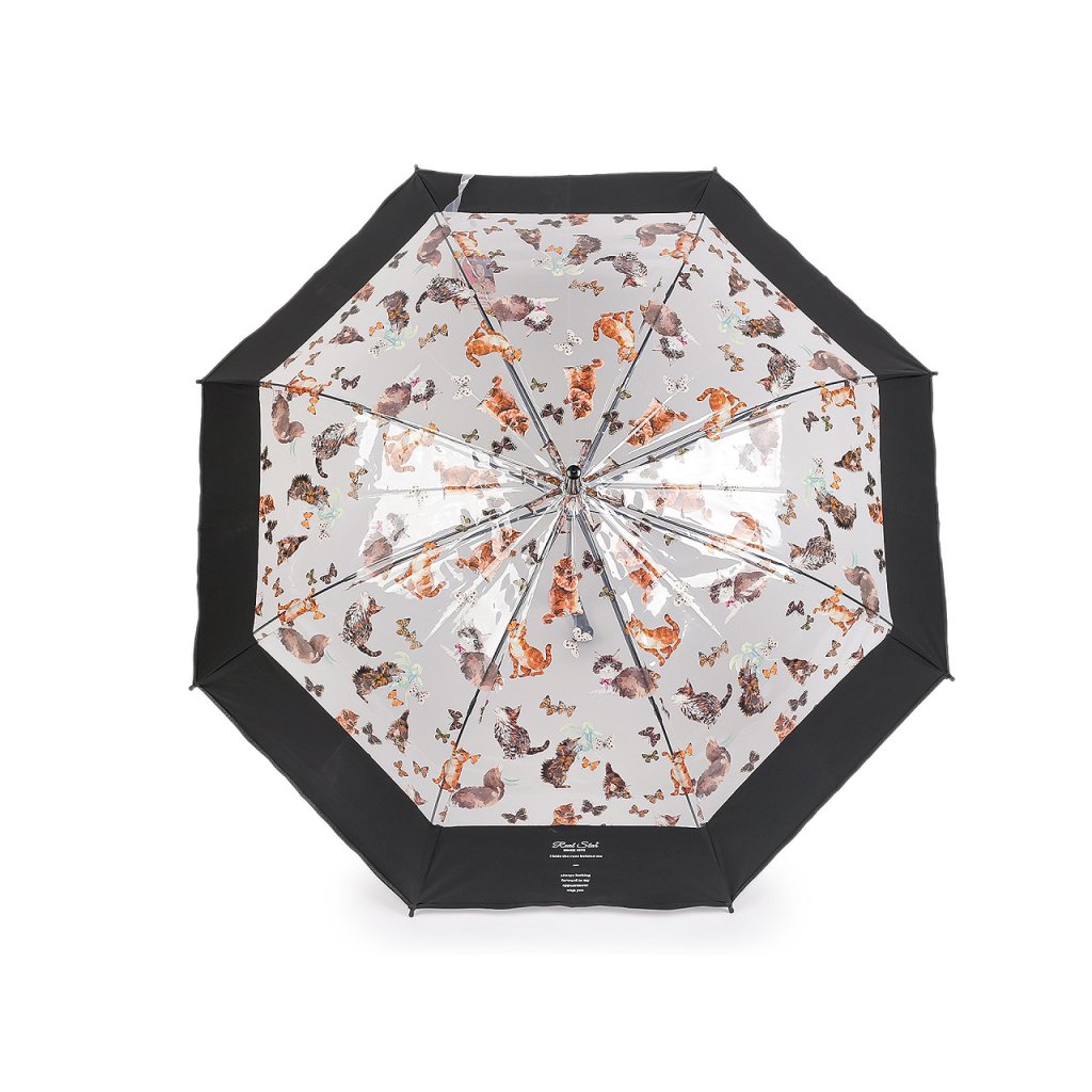 Průhledný deštník s barevným potiskem koček s motýly je ideální volbou pro všechny milovnice hravých módních doplňků. Je vystřelovací, okraj má ozdobený širokým barevným lemem. Konstrukce deštníku je z kovového drátu a pružných lamel, tvoří osm polí. Díky nim je velice pevný, neohne se ani za největšího nečasu. Klasická tyč je zakončená pevnou rukojetí.