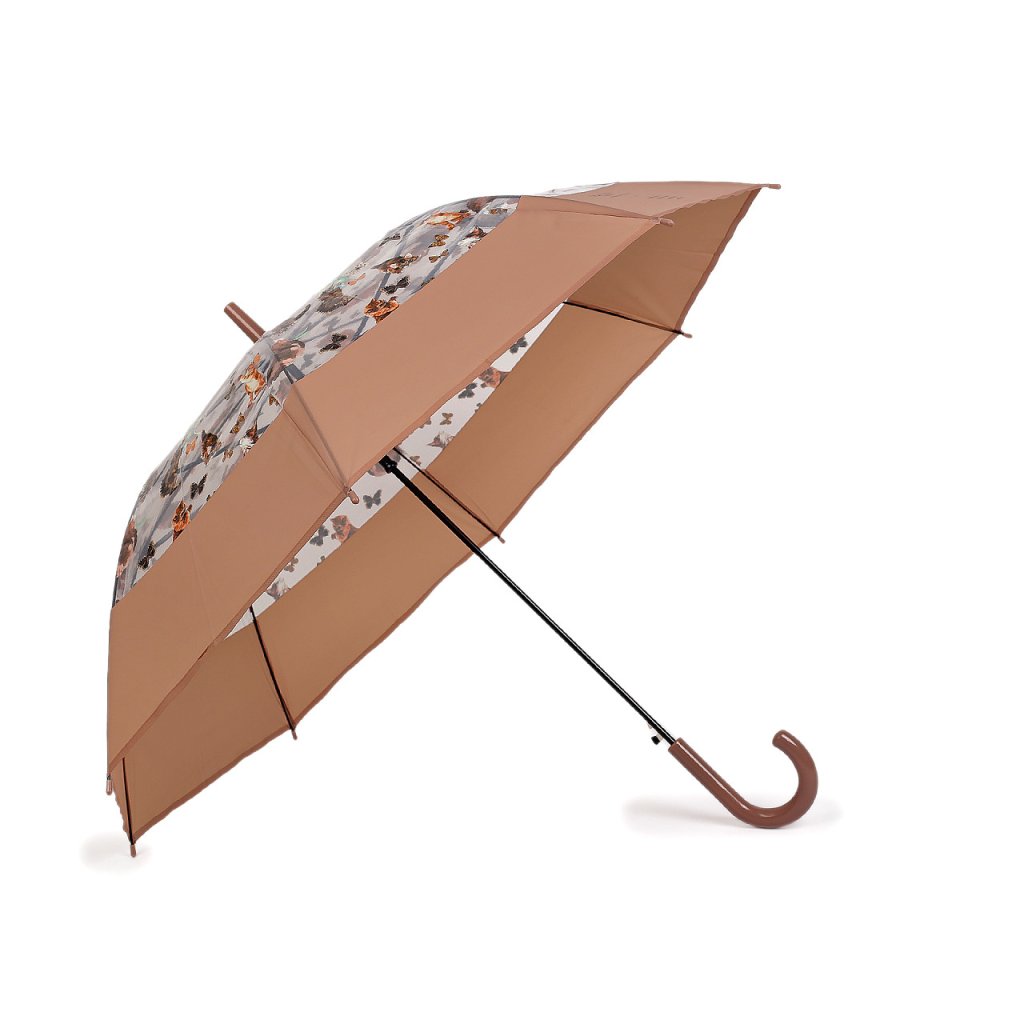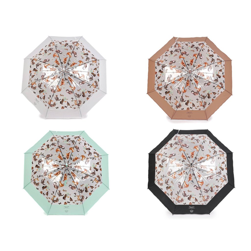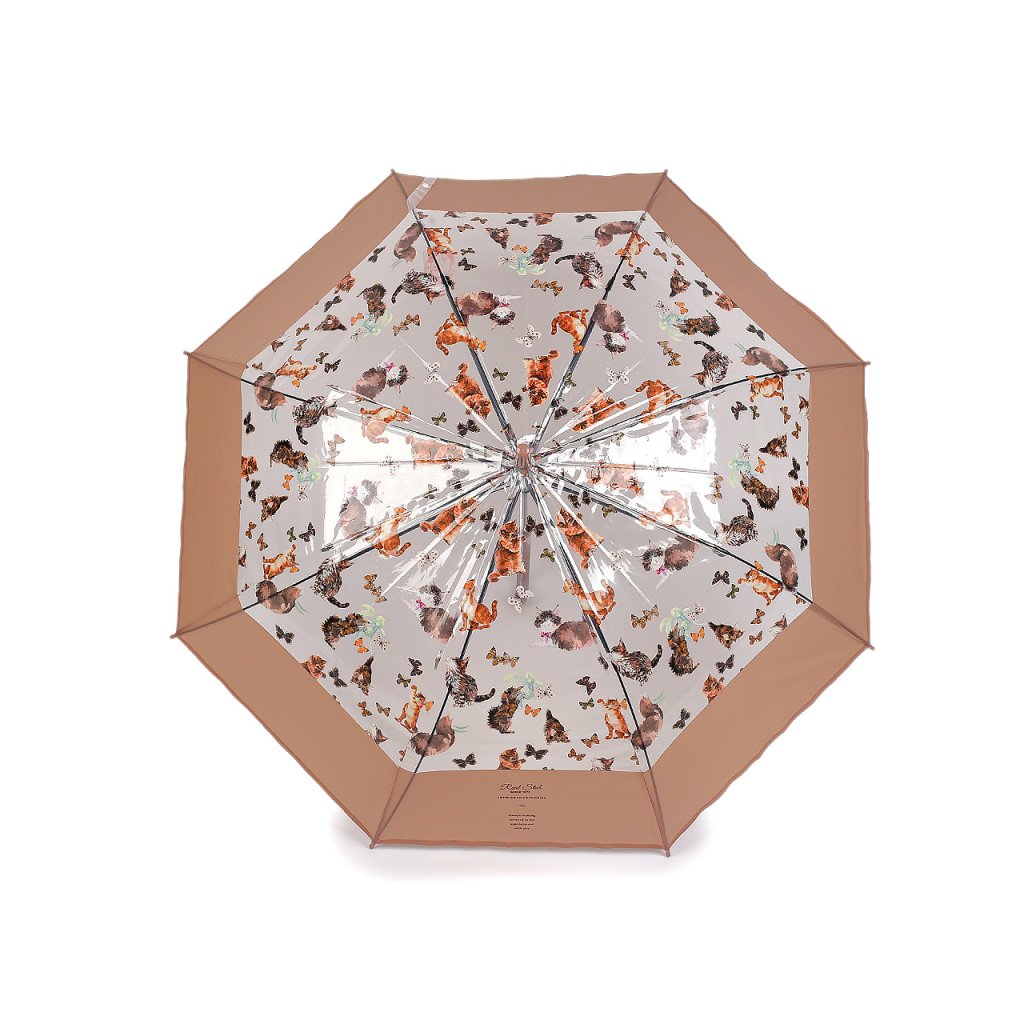 Průhledný deštník s barevným potiskem koček s motýly je ideální volbou pro všechny milovnice hravých módních doplňků. Je vystřelovací, okraj má ozdobený širokým barevným lemem. Konstrukce deštníku je z kovového drátu a pružných lamel, tvoří osm polí. Díky nim je velice pevný, neohne se ani za největšího nečasu. Klasická tyč je zakončená pevnou rukojetí.