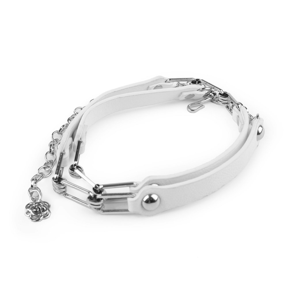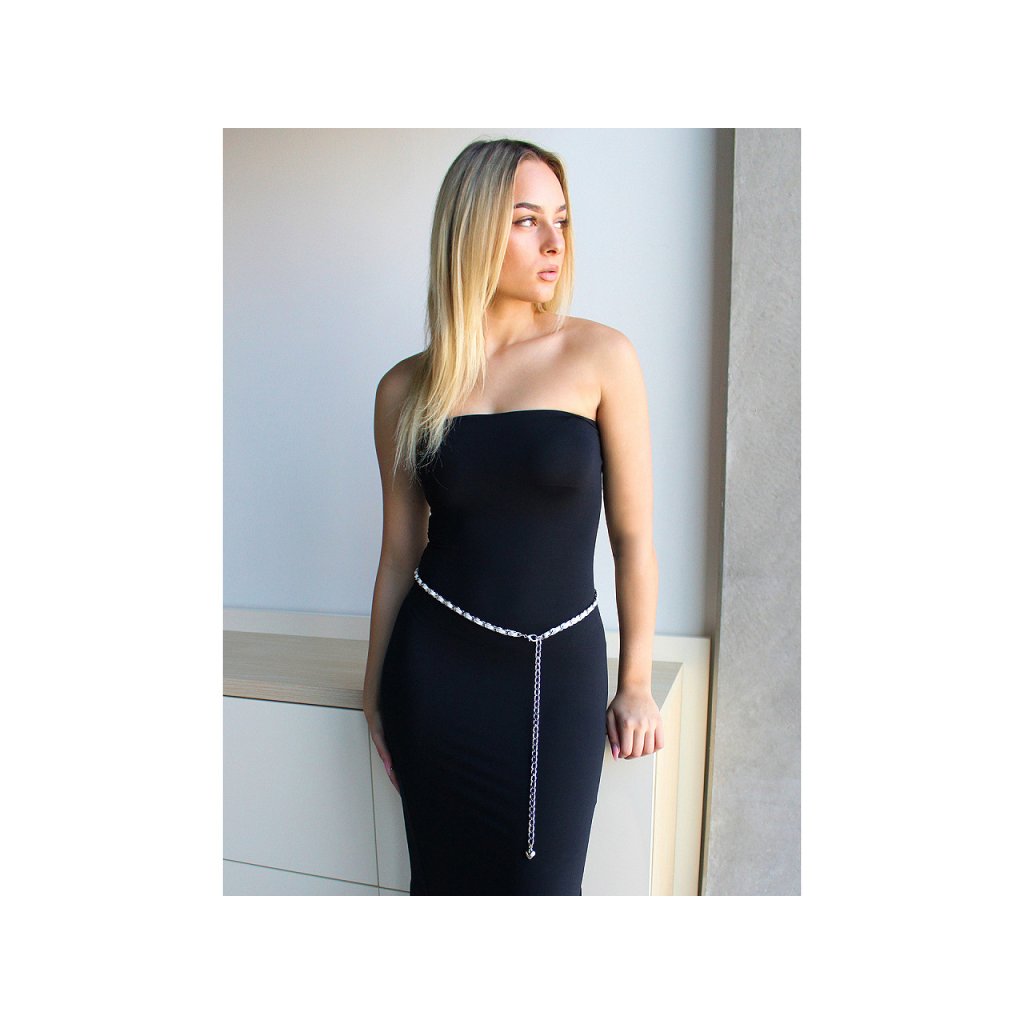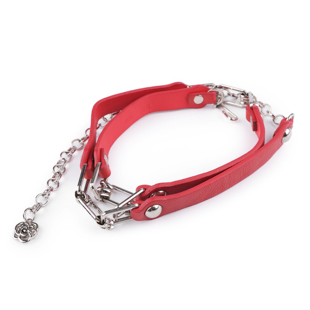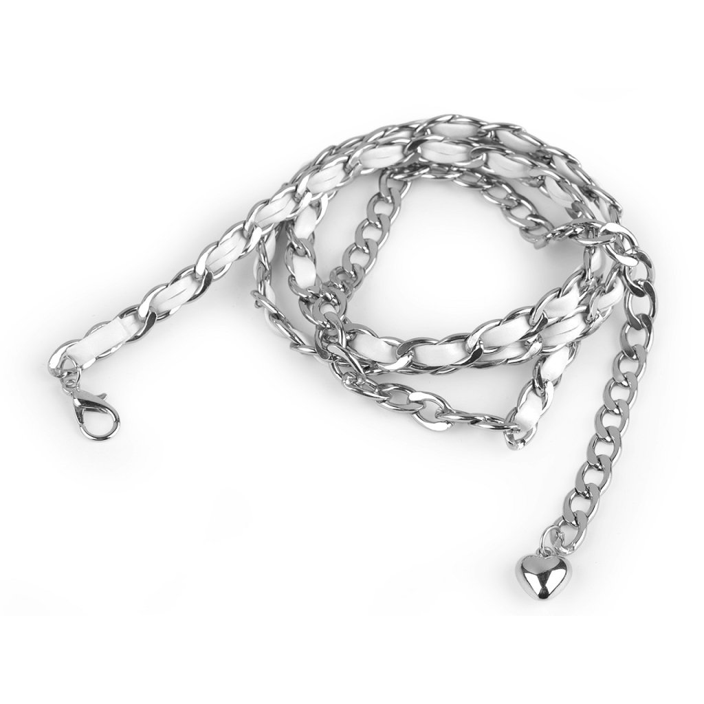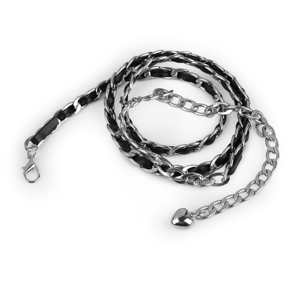 Dámský kombinovaný pásek patří k poutavým módním doplňkům. Je vytvořený z řetězu s plochými oky, který je propletený páskem z imitace kůže. Využijete jej k šatům, tunikám apod. Zapíná se karabinou, která je na jednom konci řetězu. Druhý konec je ozdobený přívěskem srdce.
