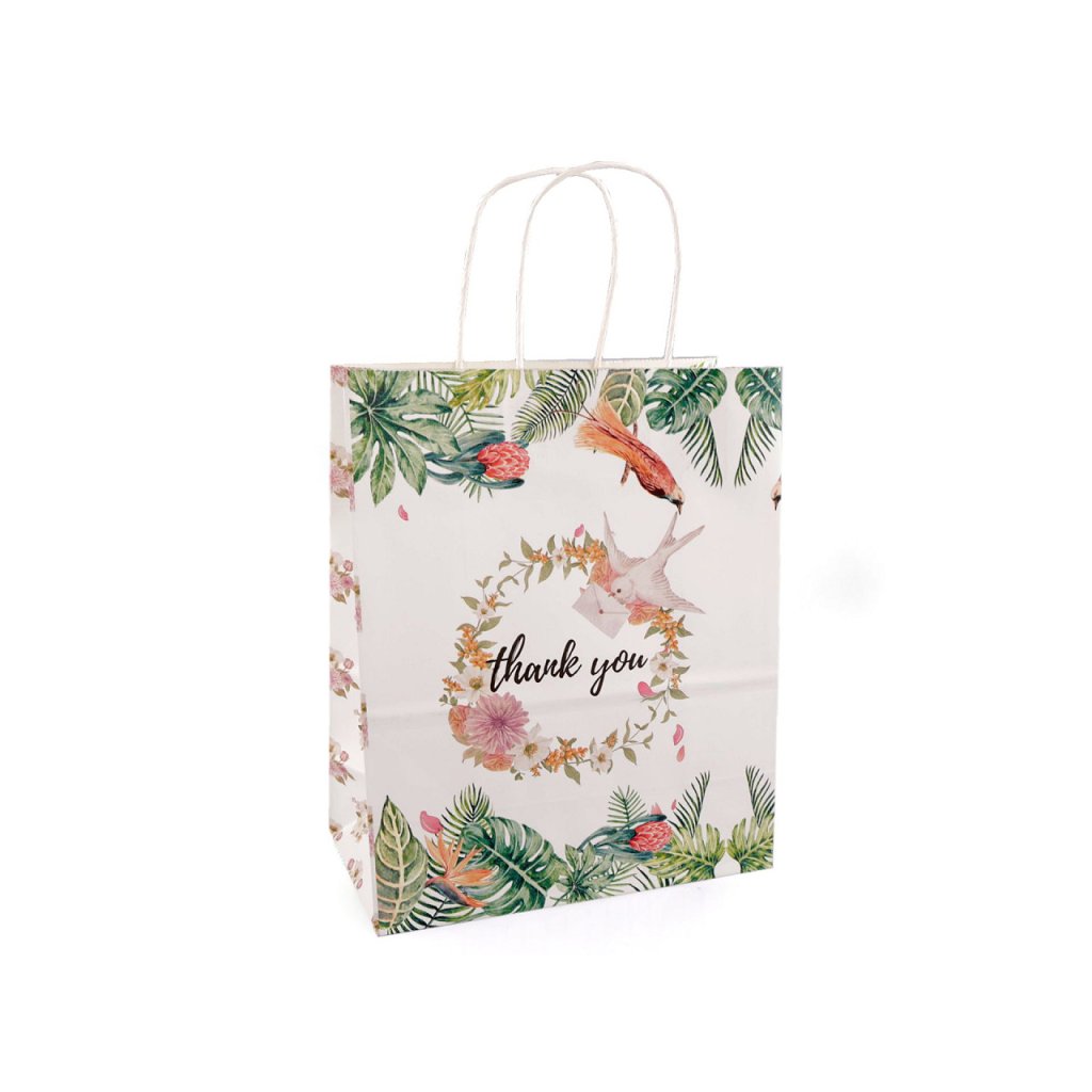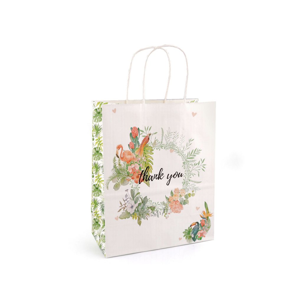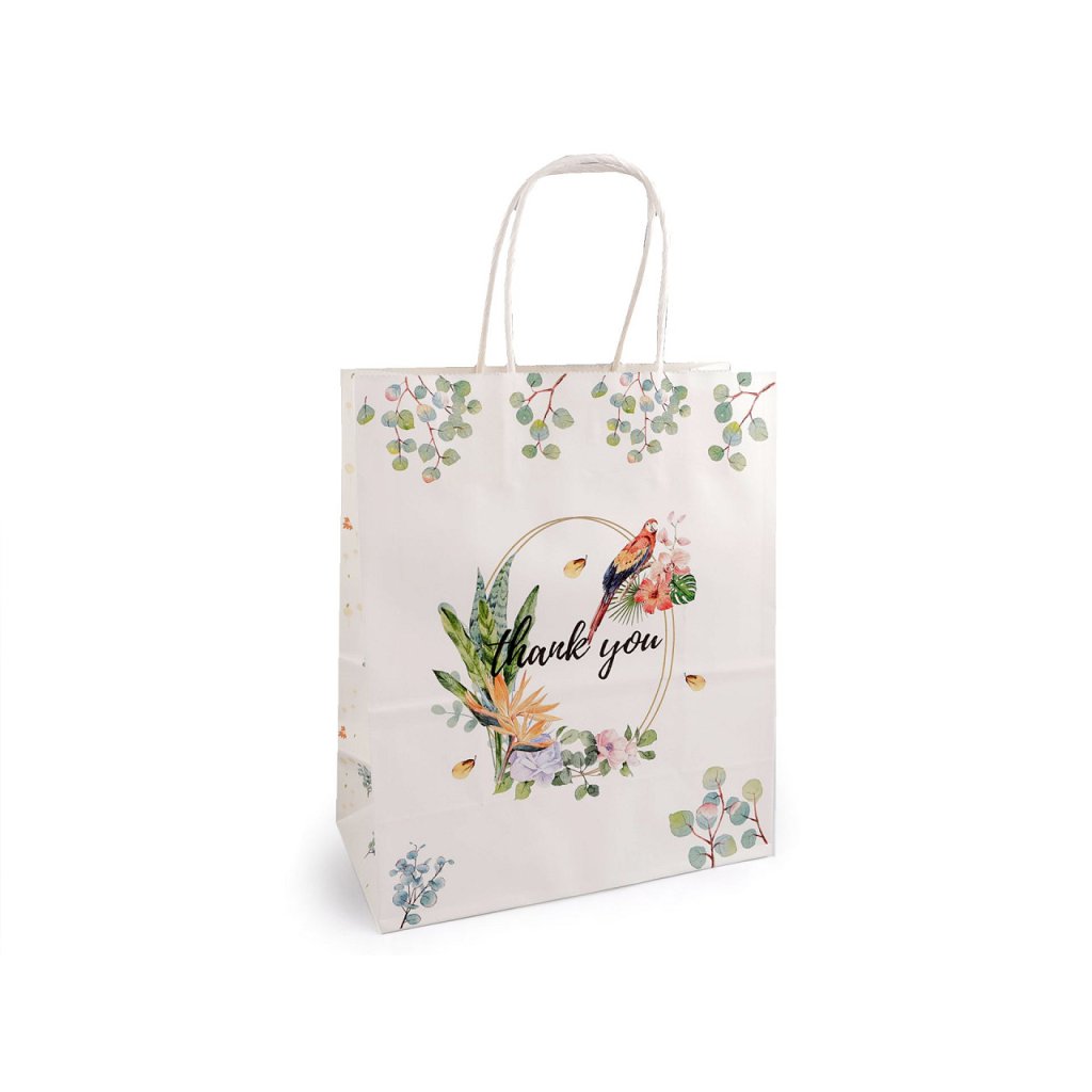 Papírovou dárkovou tašku z obou stran zdobí obrázky a nápis "thank you". Její ucha jsou kroucená a také vyrobená z papíru. Taška je vhodná k darování dárků i k balení zboží v prodejnách.