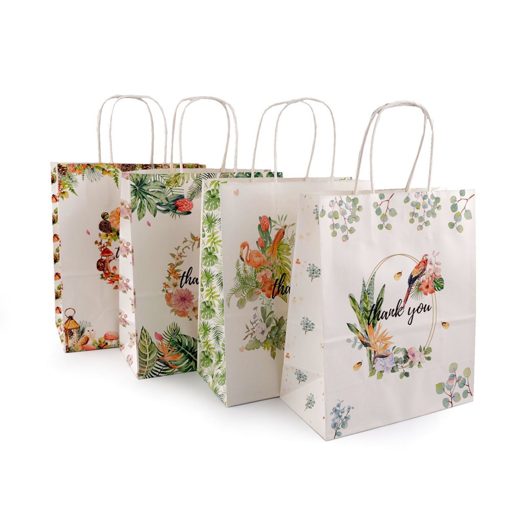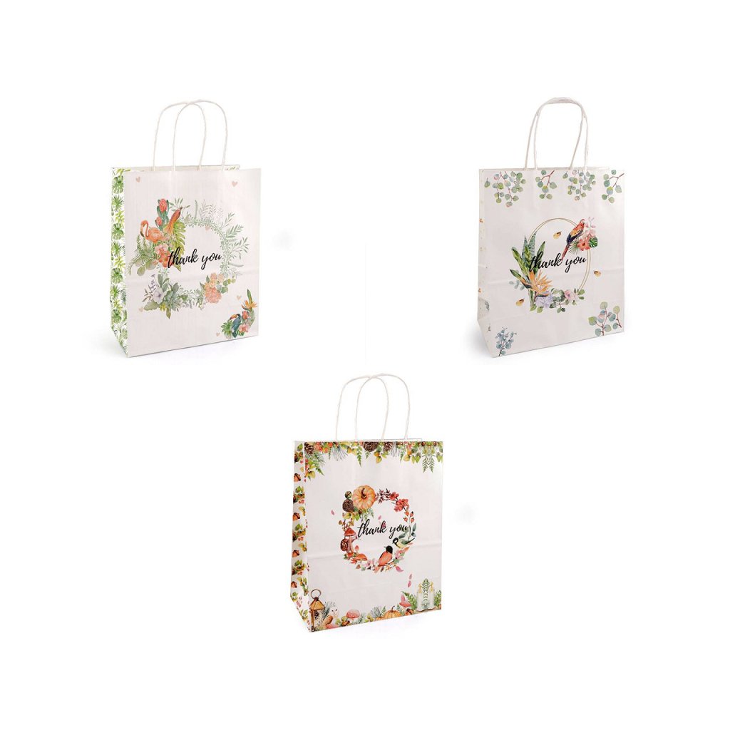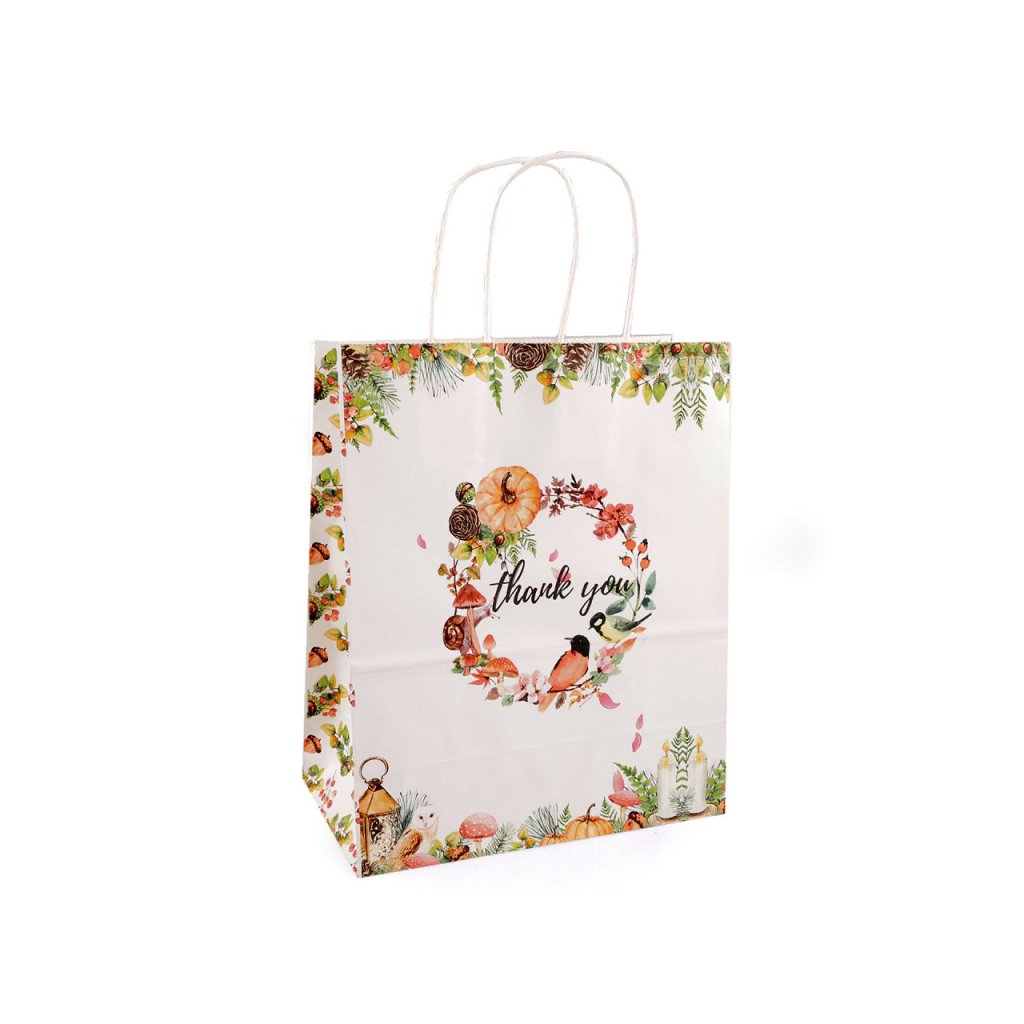 Papírovou dárkovou tašku z obou stran zdobí obrázky a nápis "thank you". Její ucha jsou kroucená a také vyrobená z papíru. Taška je vhodná k darování dárků i k balení zboží v prodejnách.