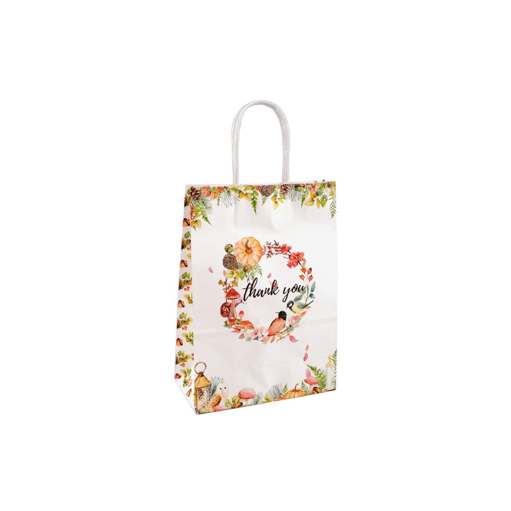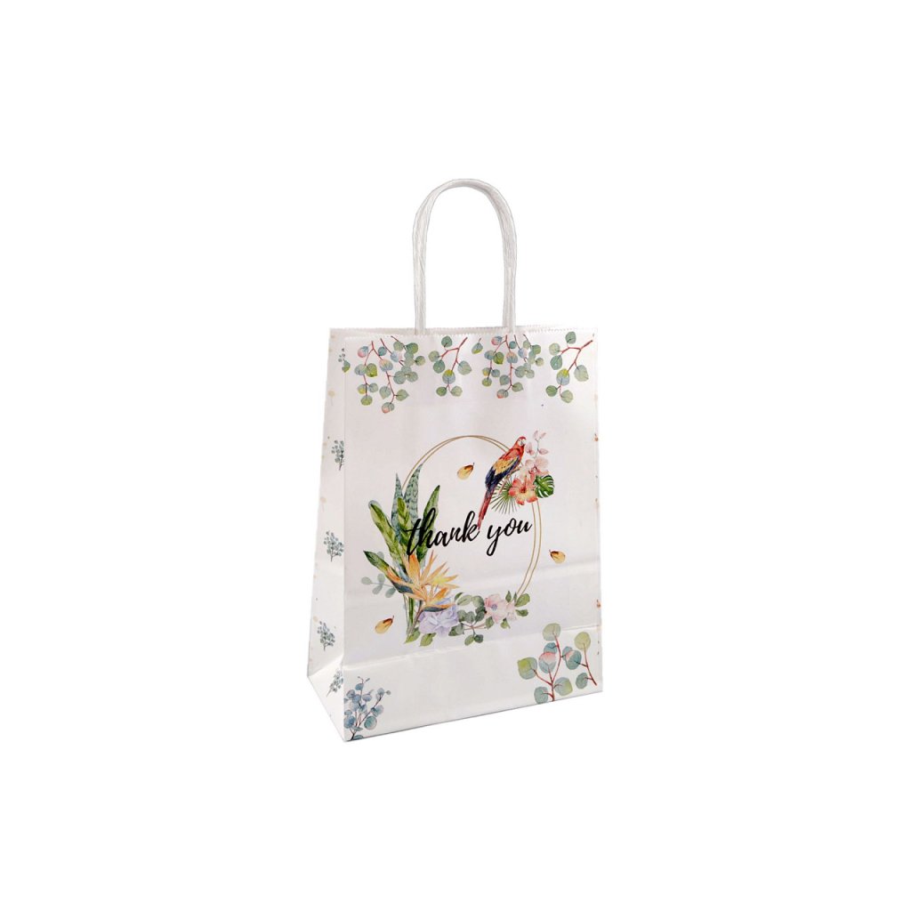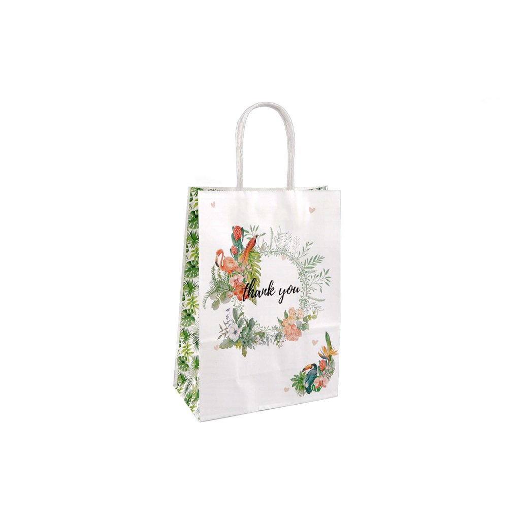 Papírová dárková taška je z obou stran ozdobená obrázky a nápisem "thank you". Její ucha jsou kroucená a také vyrobená z papíru. Taška je vhodná k darování dárků i k balení zboží v prodejnách.