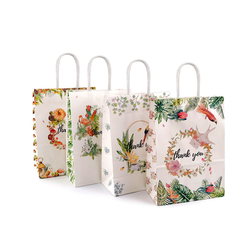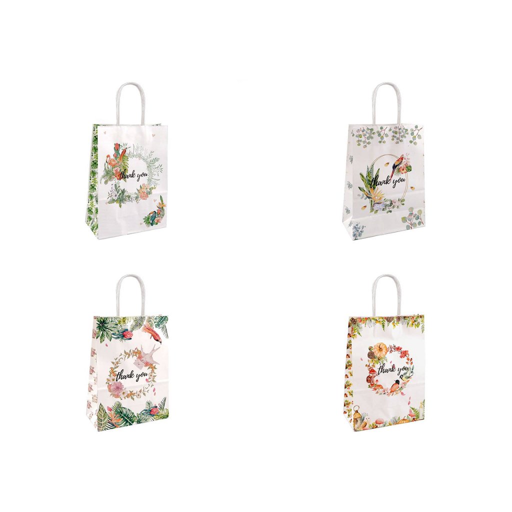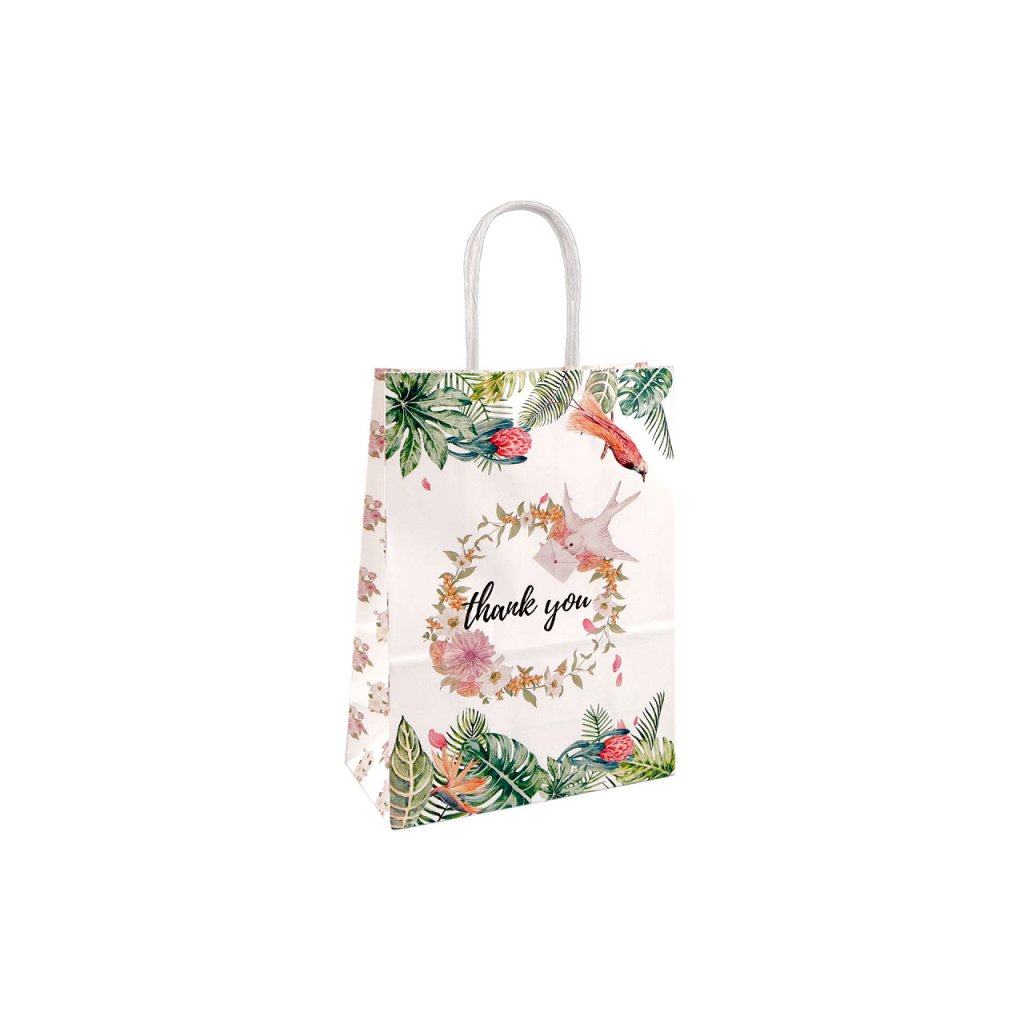 Papírová dárková taška je z obou stran ozdobená obrázky a nápisem "thank you". Její ucha jsou kroucená a také vyrobená z papíru. Taška je vhodná k darování dárků i k balení zboží v prodejnách.