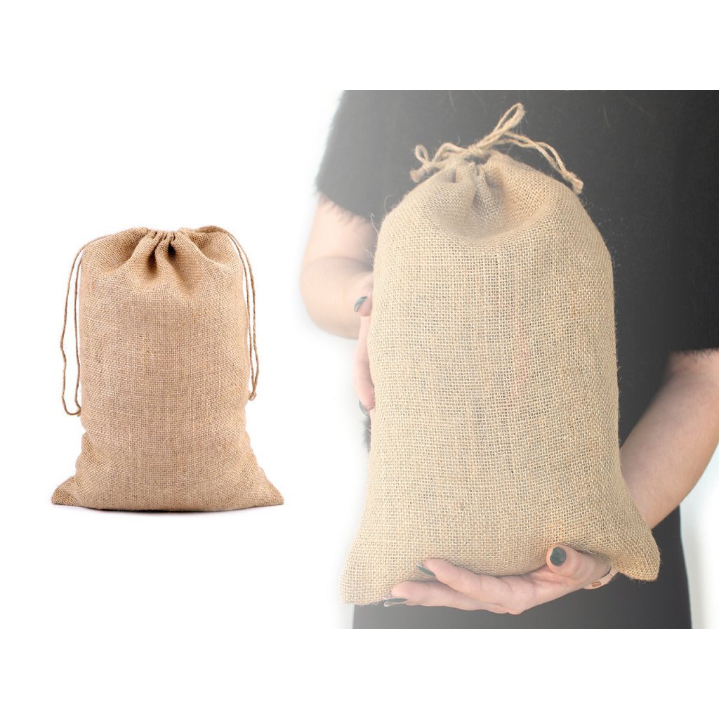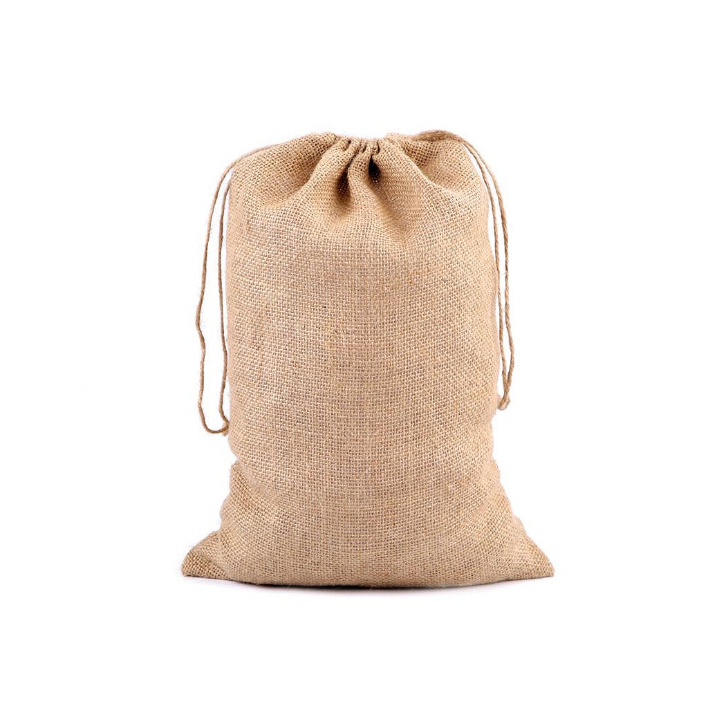 Velký jutový pytlík se snadno uzavírá pomocí dvou stahovacích šňůrek.