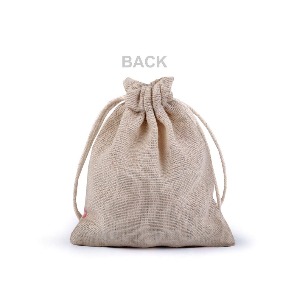 Lněný pytlík zdobí z jedné strany potisk stylizovaných květů. Je kvalitní a pevný, snadno se uzavírá pomocí dvou stahovacích bavlněných šňůrek. Využijete ho celoročně k balení menších dárků, k balení velikonoční výslužky pro koledníky i k jarnímu aranžování.