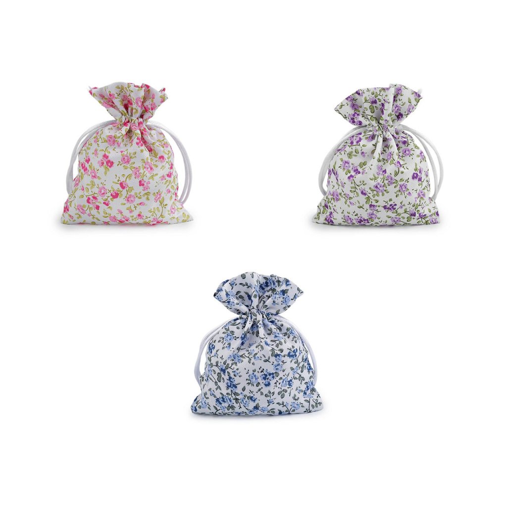 Textilní dárkový pytlík s drobnými květy působí romantickým dojmem. Snadno se uzavírá pomocí dvou stahovacích saténových šňůrek.