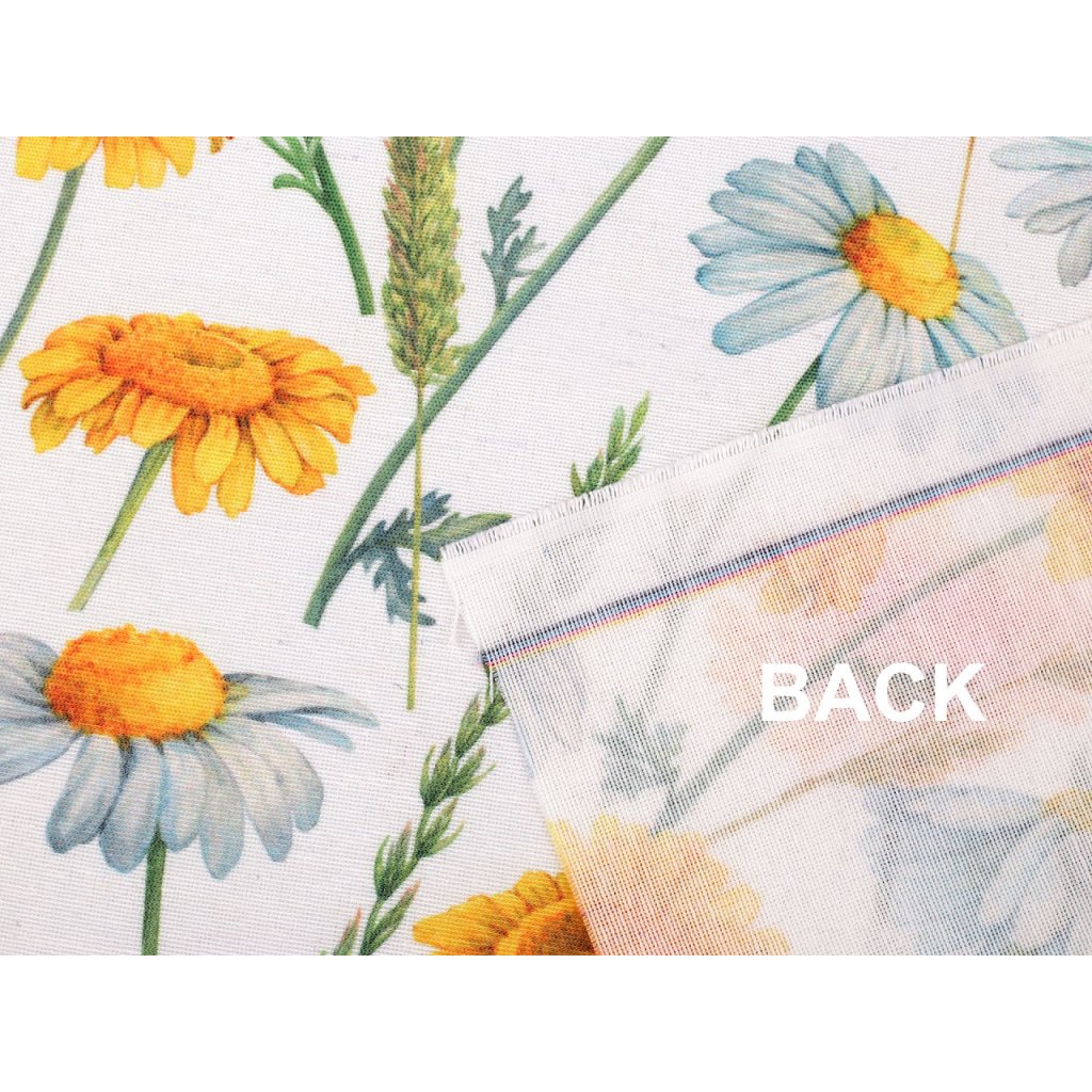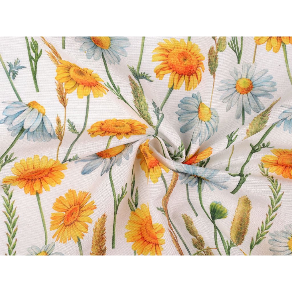 Pevnou a odolnou látku zdobí obrázky kopretin, slunečnic a travin. Využijete ji na šití ubrusů, prostírání, dekoračních povlaků na polštáře, tašek, závěsů a různých bytových dekorací.