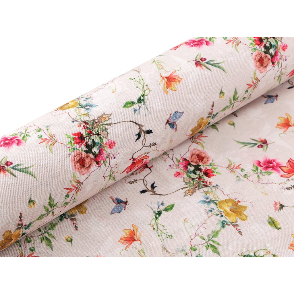 Dekorační látku s romantickými květy využijete k šití ubrusů, povlaků na polštáře, závěsů, tašek a různých bytových dekorací. Vyniká pevností a odolností.
