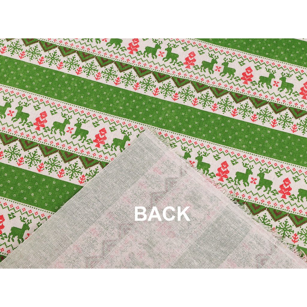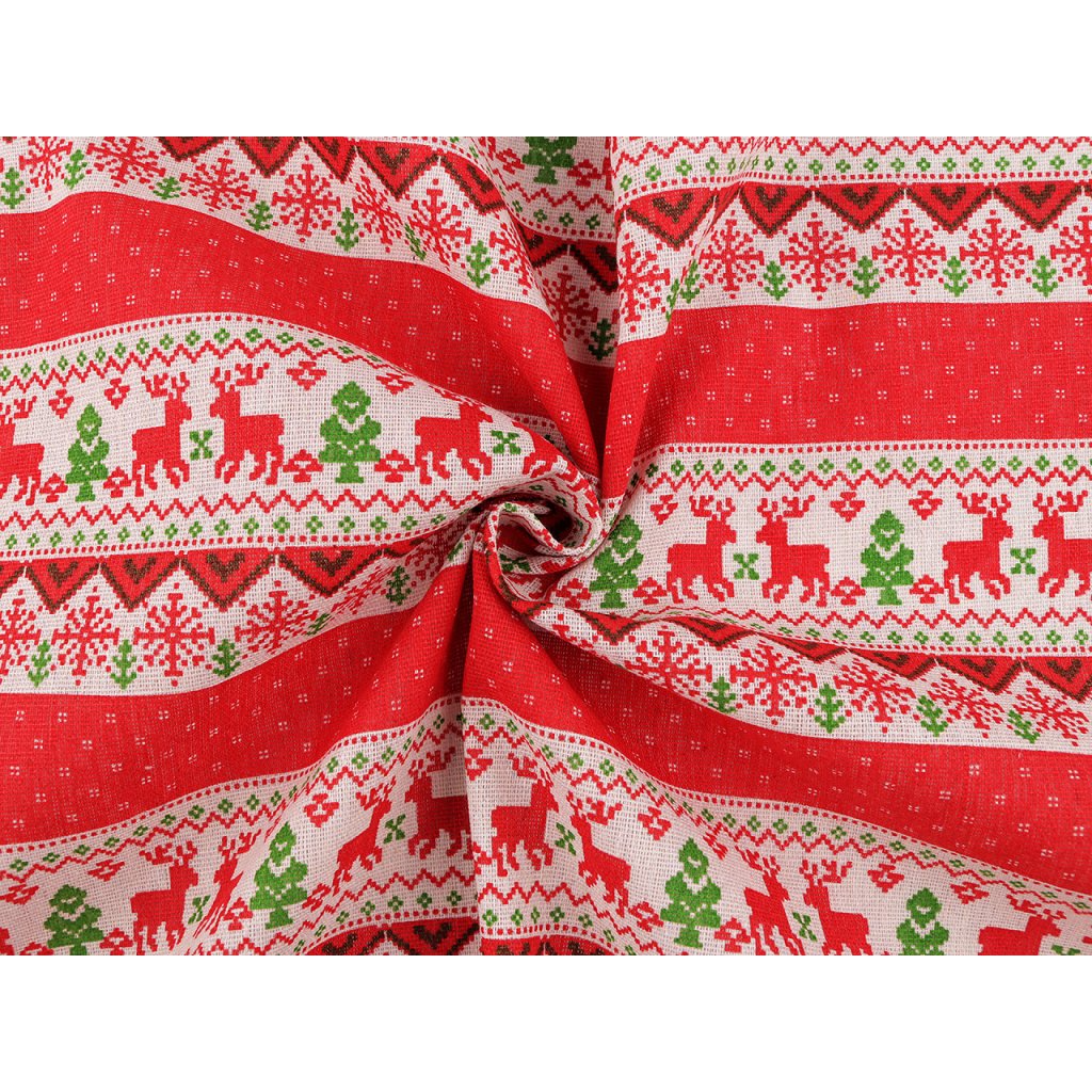 Pevnou dekorační látku zdobí vánoční motivy. Můžete z ní ušít tašky, pytlíky, běhouny na stůl, prostírání nebo dekorační polštáře.