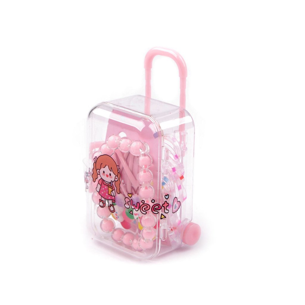Sada dětského náramku, pukaček a gumiček do vlasů je ideální pro holčičky, které se rády parádí. Vše je uschováno v otevíracím plastovém boxu ve tvaru pojízdného kufru.