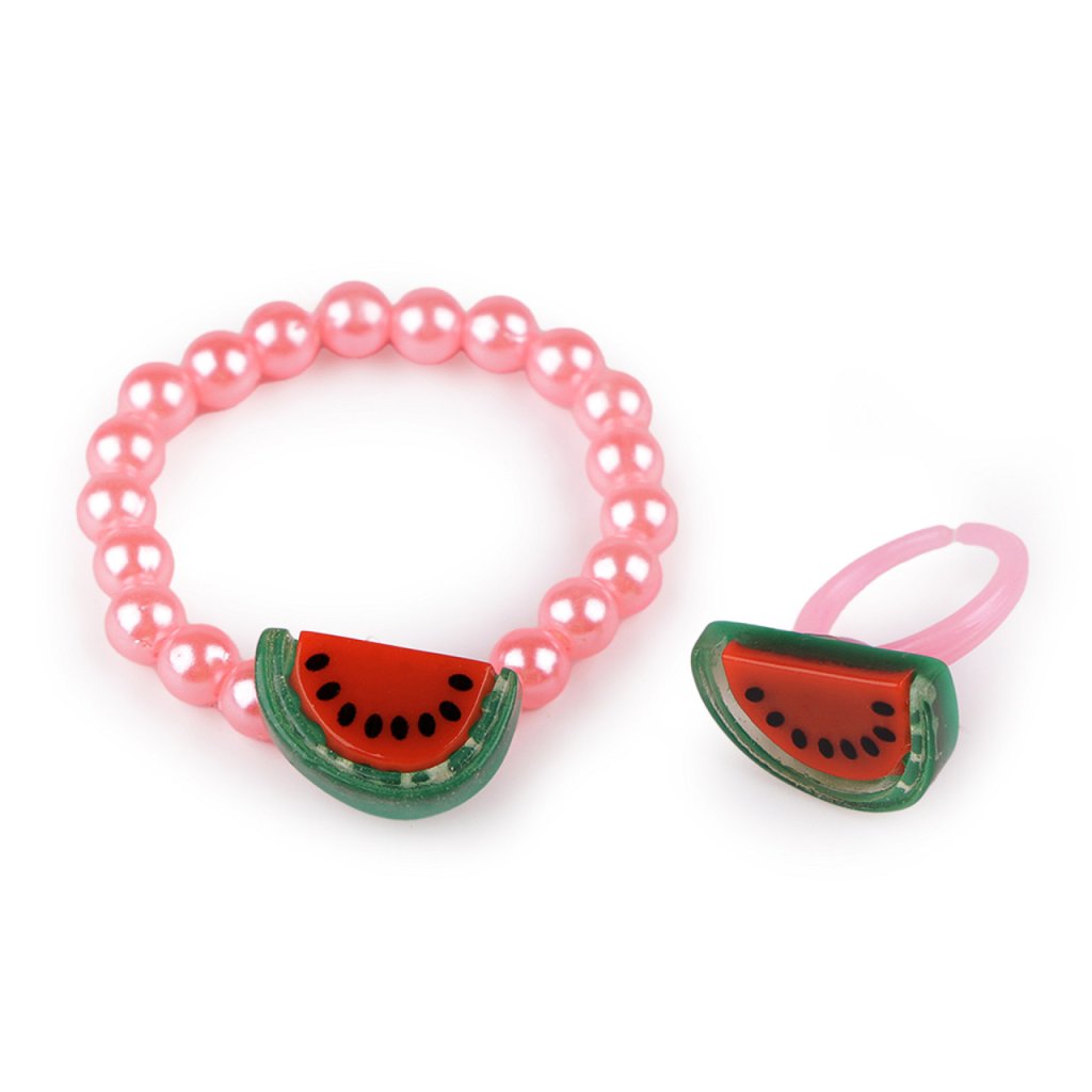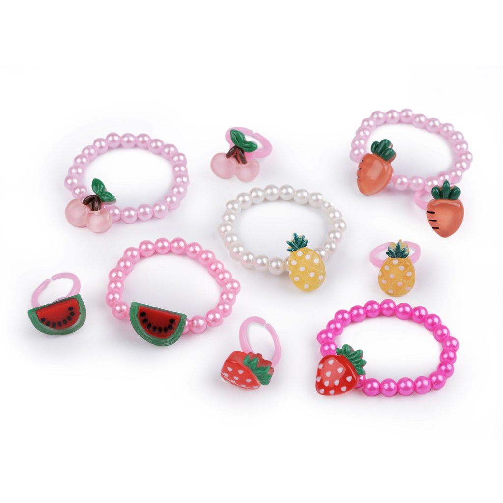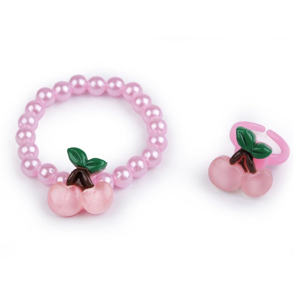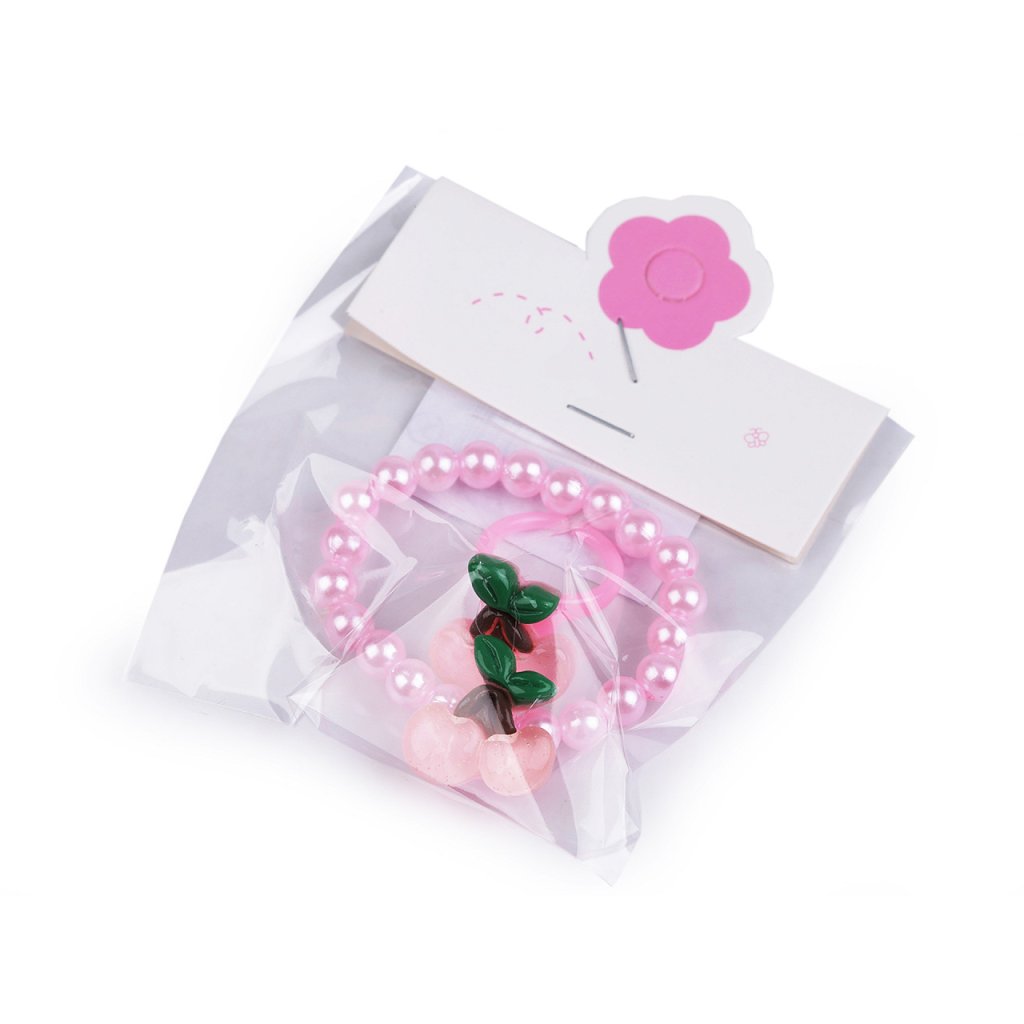 Dětská sada roztomilých šperků z plastových korálků s perlovým leskem obsahuje náramek a prstýnek.