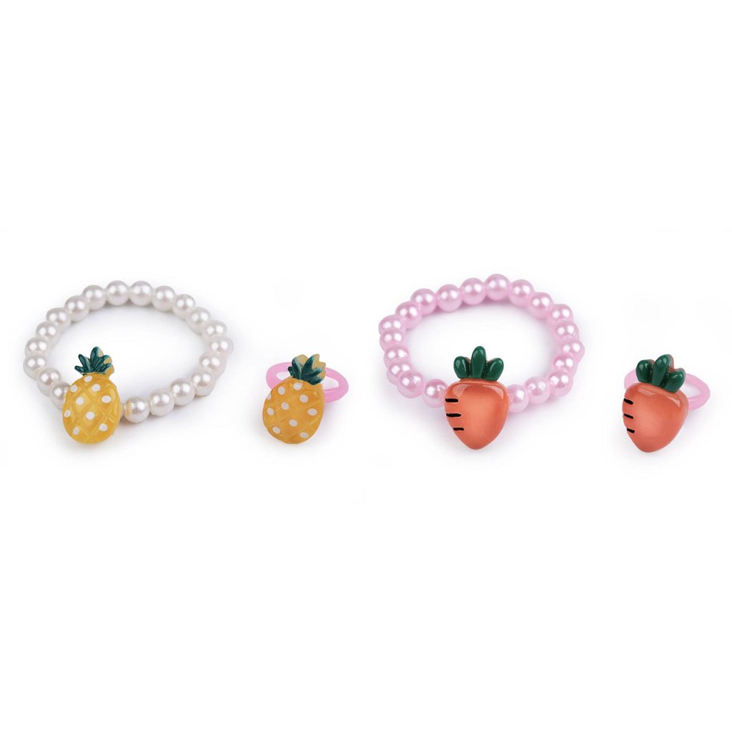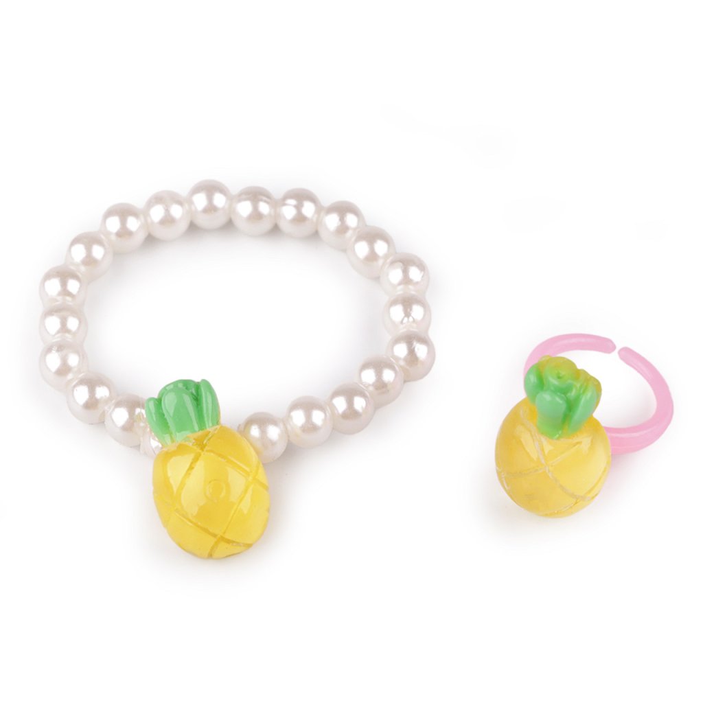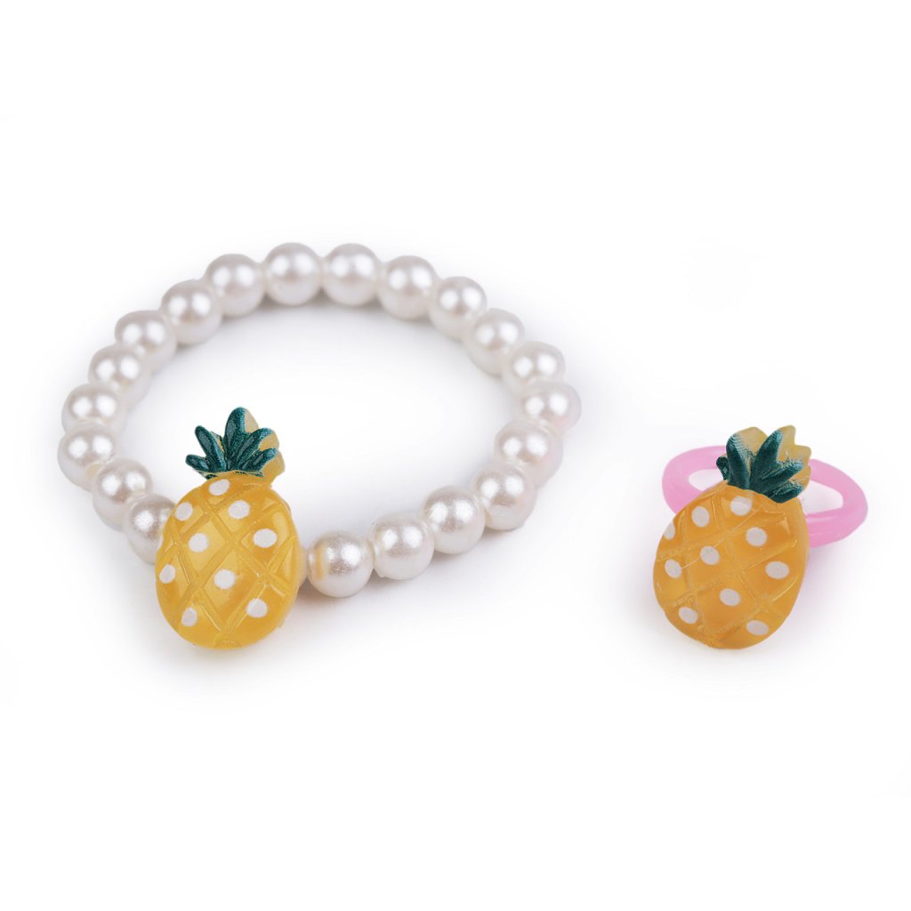 Perlové korálky na náramku jsou navlečené na pružné gumičce. Střed náramku je ozdobený motivem ovoce, který se opakuje i na prstýnku. Náramek nemá uzávěr, je pružný, jde pohodlně navléci.