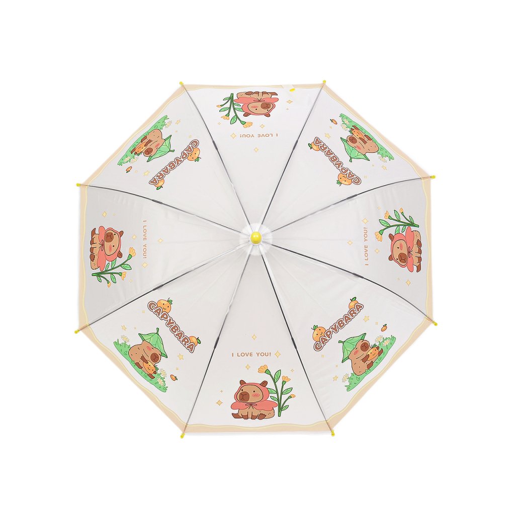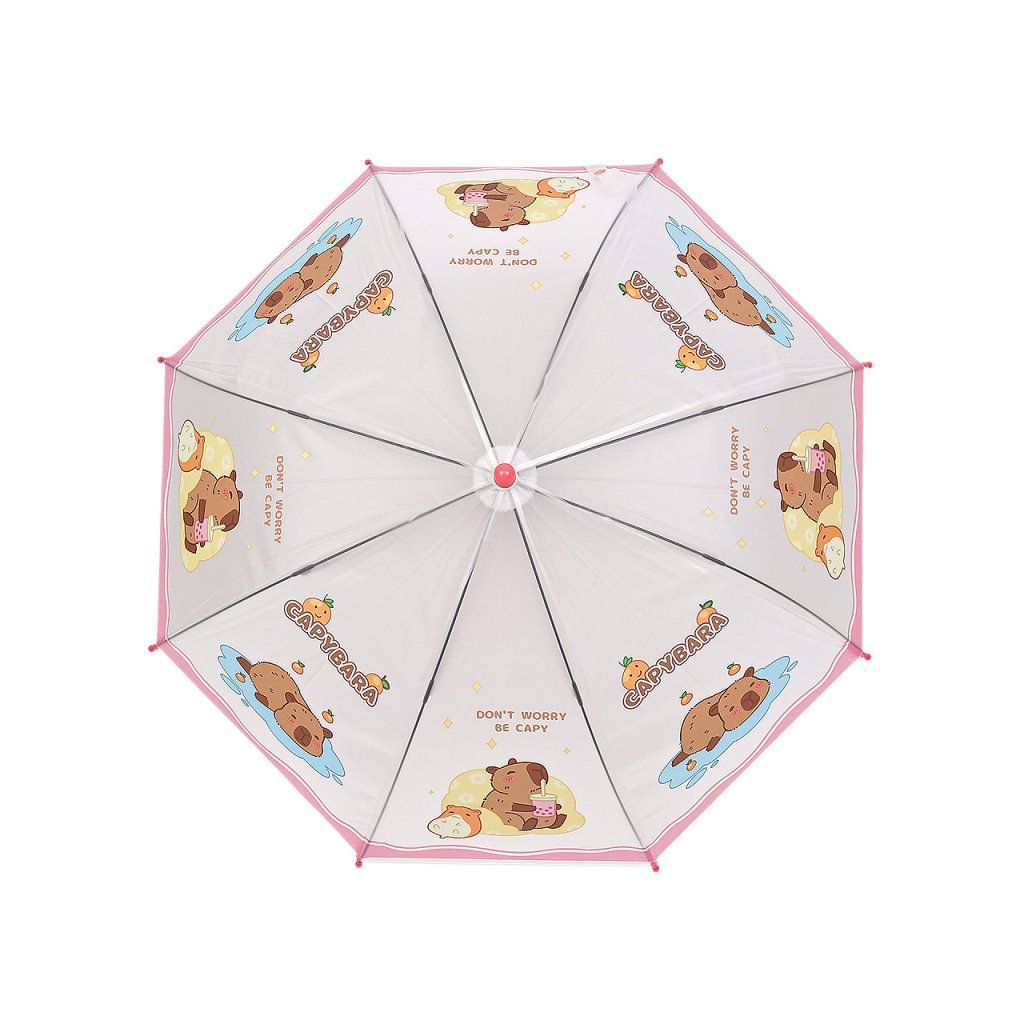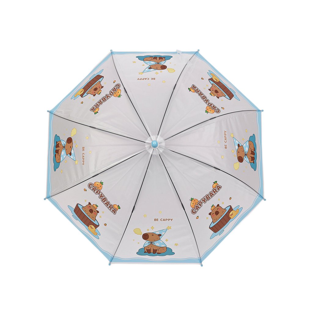 Dětský vystřelovací deštník s motivem kapybary je ideálním společníkem pro deštivé dny. Tento deštník je navržený s ohledem na potřeby dětí, kombinuje stylový vzhled s praktičností. Potah je průsvitný, na rukojeti má deštník visačku, na kterou můžete napsat jméno dítěte. Má klasickou tyč zakončenou pevnou rukojetí. Konstrukce deštníku je z pružných lamel a tvoří osm polí.