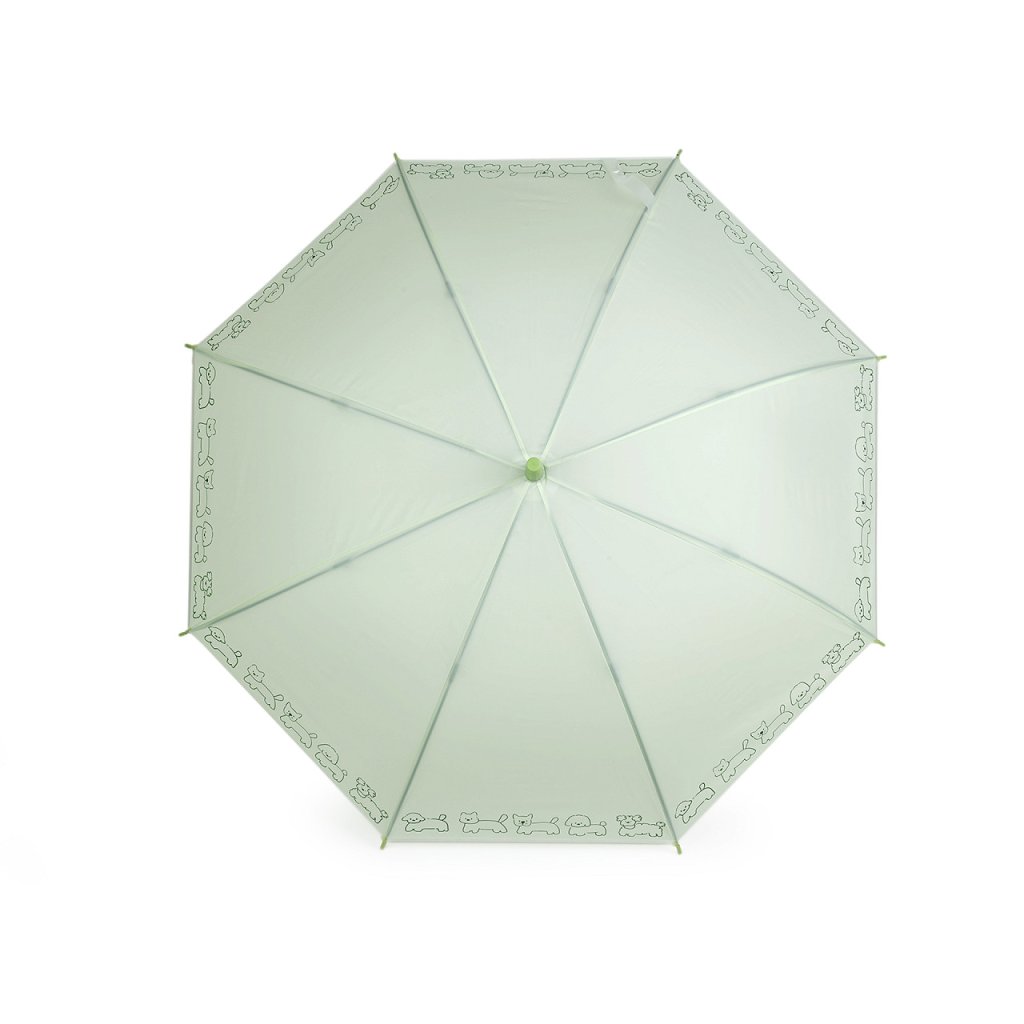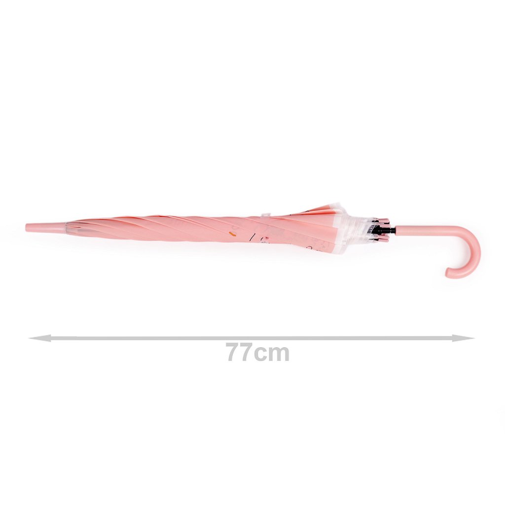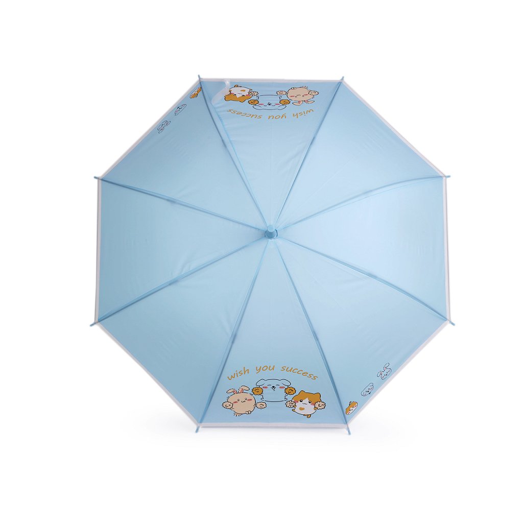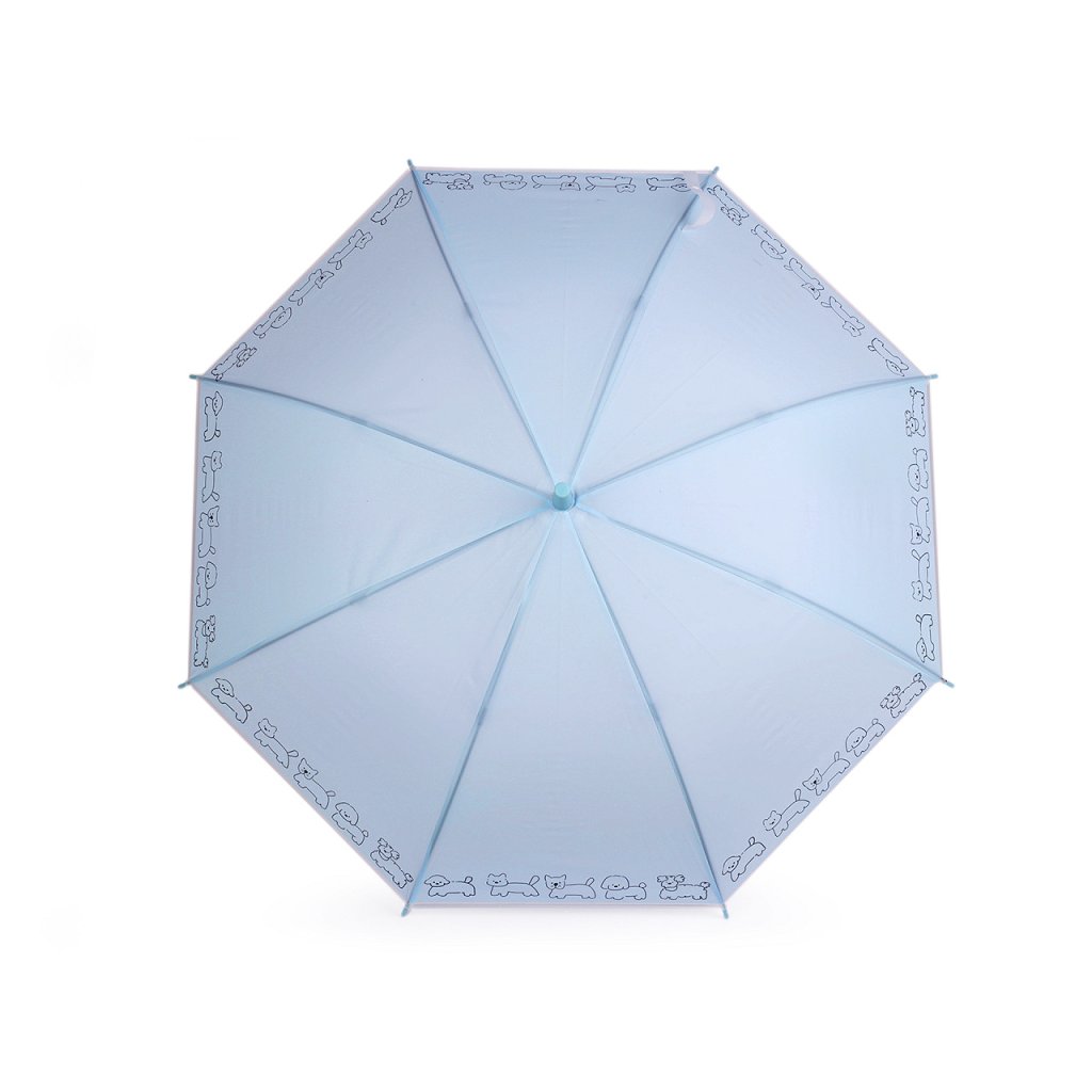 Dětský deštník s jednobarevným potahem s potiskem zvířátek v módních pastelových barvách má už větší velikost. Hodí se pro děti od cca 8 let. Deštník je vystřelovací, má klasickou tyč zakončenou pevnou rukojetí. Konstrukce deštníku je z kovového drátu a pružných lamel, tvoří osm polí. Díky nim je velice pevný, neohne se ani za největšího nečasu.